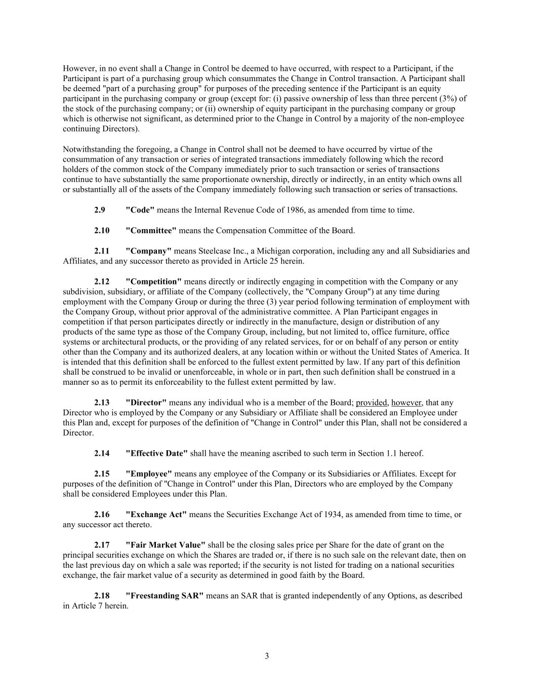 3 However, in no event shall a Change in Control be deemed to have occurred, with respect to a Participant, if the Participant is part of a purchasing group which consummates the Change in Control transaction. A Participant shall be deemed "part of a purchasing group" for purposes of the preceding sentence if the Participant is an equity participant in the purchasing company or group (except for: (i) passive ownership of less than three percent (3%) of the stock of the purchasing company; or (ii) ownership of equity participant in the purchasing company or group which is otherwise not significant, as determined prior to the Change in Control by a majority of the non-employee continuing Directors). Notwithstanding the foregoing, a Change in Control shall not be deemed to have occurred by virtue of the consummation of any transaction or series of integrated transactions immediately following which the record holders of the common stock of the Company immediately prior to such transaction or series of transactions continue to have substantially the same proportionate ownership, directly or indirectly, in an entity which owns all or substantially all of the assets of the Company immediately following such transaction or series of transactions. 2.9 "Code" means the Internal Revenue Code of 1986, as amended from time to time. 2.10 "Committee" means the Compensation Committee of the Board. 2.11 "Company" means Steelcase Inc., a Michigan corporation, including any and all Subsidiaries and Affiliates, and any successor thereto as provided in Article 25 herein. 2.12 "Competition" means directly or indirectly engaging in competition with the Company or any subdivision, subsidiary, or affiliate of the Company (collectively, the "Company Group") at any time during employment with the Company Group or during the three (3) year period following termination of employment with the Company Group, without prior approval of the administrative committee. A Plan Participant engages in competition if that person participates directly or indirectly in the manufacture, design or distribution of any products of the same type as those of the Company Group, including, but not limited to, office furniture, office systems or architectural products, or the providing of any related services, for or on behalf of any person or entity other than the Company and its authorized dealers, at any location within or without the United States of America. It is intended that this definition shall be enforced to the fullest extent permitted by law. If any part of this definition shall be construed to be invalid or unenforceable, in whole or in part, then such definition shall be construed in a manner so as to permit its enforceability to the fullest extent permitted by law. 2.13 "Director" means any individual who is a member of the Board; provided, however, that any Director who is employed by the Company or any Subsidiary or Affiliate shall be considered an Employee under this Plan and, except for purposes of the definition of "Change in Control" under this Plan, shall not be considered a Director. 2.14 "Effective Date" shall have the meaning ascribed to such term in Section 1.1 hereof. 2.15 "Employee" means any employee of the Company or its Subsidiaries or Affiliates. Except for purposes of the definition of "Change in Control" under this Plan, Directors who are employed by the Company shall be considered Employees under this Plan. 2.16 "Exchange Act" means the Securities Exchange Act of 1934, as amended from time to time, or any successor act thereto. 2.17 "Fair Market Value" shall be the closing sales price per Share for the date of grant on the principal securities exchange on which the Shares are traded or, if there is no such sale on the relevant date, then on the last previous day on which a sale was reported; if the security is not listed for trading on a national securities exchange, the fair market value of a security as determined in good faith by the Board. 2.18 "Freestanding SAR" means an SAR that is granted independently of any Options, as described in Article 7 herein.