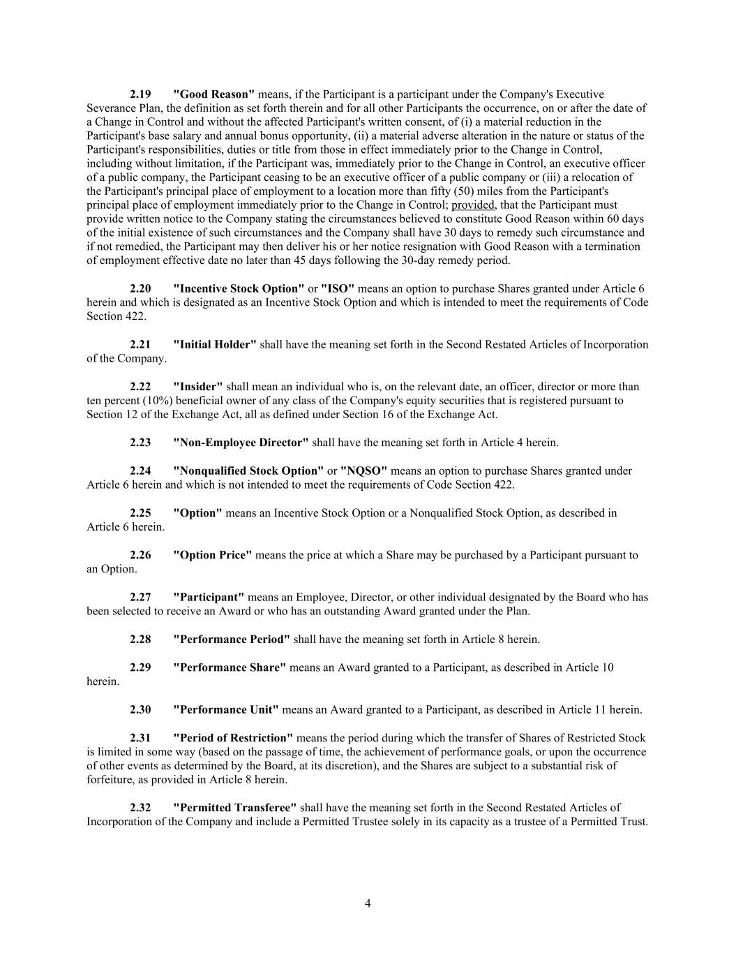 4 2.19 "Good Reason" means, if the Participant is a participant under the Company's Executive Severance Plan, the definition as set forth therein and for all other Participants the occurrence, on or after the date of a Change in Control and without the affected Participant's written consent, of (i) a material reduction in the Participant's base salary and annual bonus opportunity, (ii) a material adverse alteration in the nature or status of the Participant's responsibilities, duties or title from those in effect immediately prior to the Change in Control, including without limitation, if the Participant was, immediately prior to the Change in Control, an executive officer of a public company, the Participant ceasing to be an executive officer of a public company or (iii) a relocation of the Participant's principal place of employment to a location more than fifty (50) miles from the Participant's principal place of employment immediately prior to the Change in Control; provided, that the Participant must provide written notice to the Company stating the circumstances believed to constitute Good Reason within 60 days of the initial existence of such circumstances and the Company shall have 30 days to remedy such circumstance and if not remedied, the Participant may then deliver his or her notice resignation with Good Reason with a termination of employment effective date no later than 45 days following the 30-day remedy period. 2.20 "Incentive Stock Option" or "ISO" means an option to purchase Shares granted under Article 6 herein and which is designated as an Incentive Stock Option and which is intended to meet the requirements of Code Section 422. 2.21 "Initial Holder" shall have the meaning set forth in the Second Restated Articles of Incorporation of the Company. 2.22 "Insider" shall mean an individual who is, on the relevant date, an officer, director or more than ten percent (10%) beneficial owner of any class of the Company's equity securities that is registered pursuant to Section 12 of the Exchange Act, all as defined under Section 16 of the Exchange Act. 2.23 "Non-Employee Director" shall have the meaning set forth in Article 4 herein. 2.24 "Nonqualified Stock Option" or "NQSO" means an option to purchase Shares granted under Article 6 herein and which is not intended to meet the requirements of Code Section 422. 2.25 "Option" means an Incentive Stock Option or a Nonqualified Stock Option, as described in Article 6 herein. 2.26 "Option Price" means the price at which a Share may be purchased by a Participant pursuant to an Option. 2.27 "Participant" means an Employee, Director, or other individual designated by the Board who has been selected to receive an Award or who has an outstanding Award granted under the Plan. 2.28 "Performance Period" shall have the meaning set forth in Article 8 herein. 2.29 "Performance Share" means an Award granted to a Participant, as described in Article 10 herein. 2.30 "Performance Unit" means an Award granted to a Participant, as described in Article 11 herein. 2.31 "Period of Restriction" means the period during which the transfer of Shares of Restricted Stock is limited in some way (based on the passage of time, the achievement of performance goals, or upon the occurrence of other events as determined by the Board, at its discretion), and the Shares are subject to a substantial risk of forfeiture, as provided in Article 8 herein. 2.32 "Permitted Transferee" shall have the meaning set forth in the Second Restated Articles of Incorporation of the Company and include a Permitted Trustee solely in its capacity as a trustee of a Permitted Trust.
