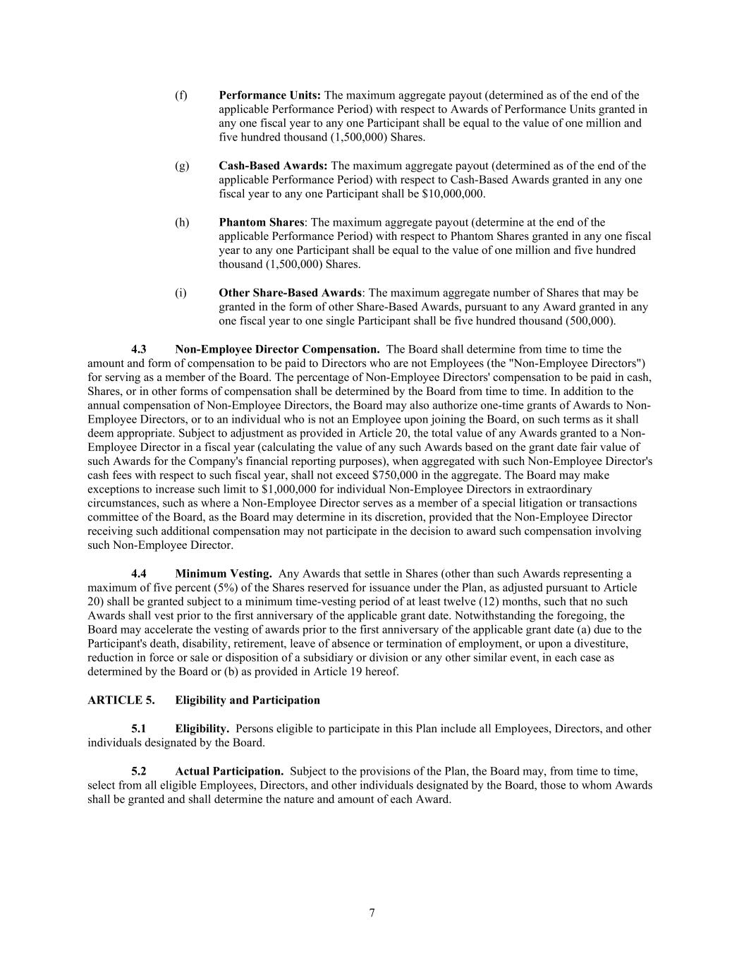 7 (f) Performance Units: The maximum aggregate payout (determined as of the end of the applicable Performance Period) with respect to Awards of Performance Units granted in any one fiscal year to any one Participant shall be equal to the value of one million and five hundred thousand (1,500,000) Shares. (g) Cash-Based Awards: The maximum aggregate payout (determined as of the end of the applicable Performance Period) with respect to Cash-Based Awards granted in any one fiscal year to any one Participant shall be $10,000,000. (h) Phantom Shares: The maximum aggregate payout (determine at the end of the applicable Performance Period) with respect to Phantom Shares granted in any one fiscal year to any one Participant shall be equal to the value of one million and five hundred thousand (1,500,000) Shares. (i) Other Share-Based Awards: The maximum aggregate number of Shares that may be granted in the form of other Share-Based Awards, pursuant to any Award granted in any one fiscal year to one single Participant shall be five hundred thousand (500,000). 4.3 Non-Employee Director Compensation. The Board shall determine from time to time the amount and form of compensation to be paid to Directors who are not Employees (the "Non-Employee Directors") for serving as a member of the Board. The percentage of Non-Employee Directors' compensation to be paid in cash, Shares, or in other forms of compensation shall be determined by the Board from time to time. In addition to the annual compensation of Non-Employee Directors, the Board may also authorize one-time grants of Awards to Non- Employee Directors, or to an individual who is not an Employee upon joining the Board, on such terms as it shall deem appropriate. Subject to adjustment as provided in Article 20, the total value of any Awards granted to a Non- Employee Director in a fiscal year (calculating the value of any such Awards based on the grant date fair value of such Awards for the Company's financial reporting purposes), when aggregated with such Non-Employee Director's cash fees with respect to such fiscal year, shall not exceed $750,000 in the aggregate. The Board may make exceptions to increase such limit to $1,000,000 for individual Non-Employee Directors in extraordinary circumstances, such as where a Non-Employee Director serves as a member of a special litigation or transactions committee of the Board, as the Board may determine in its discretion, provided that the Non-Employee Director receiving such additional compensation may not participate in the decision to award such compensation involving such Non-Employee Director. 4.4 Minimum Vesting. Any Awards that settle in Shares (other than such Awards representing a maximum of five percent (5%) of the Shares reserved for issuance under the Plan, as adjusted pursuant to Article 20) shall be granted subject to a minimum time-vesting period of at least twelve (12) months, such that no such Awards shall vest prior to the first anniversary of the applicable grant date. Notwithstanding the foregoing, the Board may accelerate the vesting of awards prior to the first anniversary of the applicable grant date (a) due to the Participant's death, disability, retirement, leave of absence or termination of employment, or upon a divestiture, reduction in force or sale or disposition of a subsidiary or division or any other similar event, in each case as determined by the Board or (b) as provided in Article 19 hereof. ARTICLE 5. Eligibility and Participation 5.1 Eligibility. Persons eligible to participate in this Plan include all Employees, Directors, and other individuals designated by the Board. 5.2 Actual Participation. Subject to the provisions of the Plan, the Board may, from time to time, select from all eligible Employees, Directors, and other individuals designated by the Board, those to whom Awards shall be granted and shall determine the nature and amount of each Award.