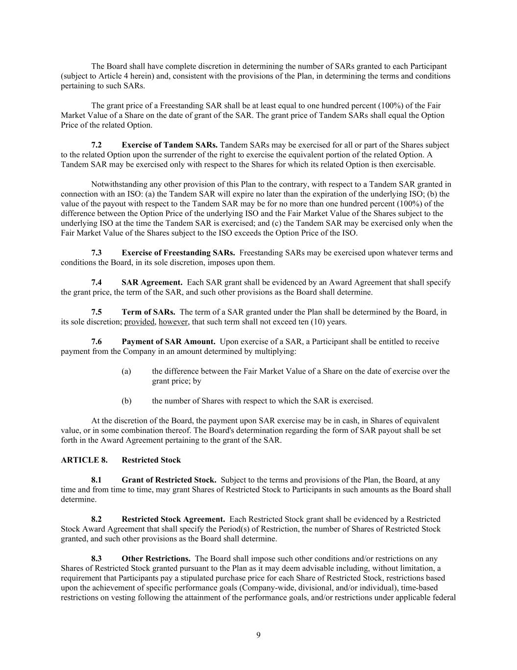 9 The Board shall have complete discretion in determining the number of SARs granted to each Participant (subject to Article 4 herein) and, consistent with the provisions of the Plan, in determining the terms and conditions pertaining to such SARs. The grant price of a Freestanding SAR shall be at least equal to one hundred percent (100%) of the Fair Market Value of a Share on the date of grant of the SAR. The grant price of Tandem SARs shall equal the Option Price of the related Option. 7.2 Exercise of Tandem SARs. Tandem SARs may be exercised for all or part of the Shares subject to the related Option upon the surrender of the right to exercise the equivalent portion of the related Option. A Tandem SAR may be exercised only with respect to the Shares for which its related Option is then exercisable. Notwithstanding any other provision of this Plan to the contrary, with respect to a Tandem SAR granted in connection with an ISO: (a) the Tandem SAR will expire no later than the expiration of the underlying ISO; (b) the value of the payout with respect to the Tandem SAR may be for no more than one hundred percent (100%) of the difference between the Option Price of the underlying ISO and the Fair Market Value of the Shares subject to the underlying ISO at the time the Tandem SAR is exercised; and (c) the Tandem SAR may be exercised only when the Fair Market Value of the Shares subject to the ISO exceeds the Option Price of the ISO. 7.3 Exercise of Freestanding SARs. Freestanding SARs may be exercised upon whatever terms and conditions the Board, in its sole discretion, imposes upon them. 7.4 SAR Agreement. Each SAR grant shall be evidenced by an Award Agreement that shall specify the grant price, the term of the SAR, and such other provisions as the Board shall determine. 7.5 Term of SARs. The term of a SAR granted under the Plan shall be determined by the Board, in its sole discretion; provided, however, that such term shall not exceed ten (10) years. 7.6 Payment of SAR Amount. Upon exercise of a SAR, a Participant shall be entitled to receive payment from the Company in an amount determined by multiplying: (a) the difference between the Fair Market Value of a Share on the date of exercise over the grant price; by (b) the number of Shares with respect to which the SAR is exercised. At the discretion of the Board, the payment upon SAR exercise may be in cash, in Shares of equivalent value, or in some combination thereof. The Board's determination regarding the form of SAR payout shall be set forth in the Award Agreement pertaining to the grant of the SAR. ARTICLE 8. Restricted Stock 8.1 Grant of Restricted Stock. Subject to the terms and provisions of the Plan, the Board, at any time and from time to time, may grant Shares of Restricted Stock to Participants in such amounts as the Board shall determine. 8.2 Restricted Stock Agreement. Each Restricted Stock grant shall be evidenced by a Restricted Stock Award Agreement that shall specify the Period(s) of Restriction, the number of Shares of Restricted Stock granted, and such other provisions as the Board shall determine. 8.3 Other Restrictions. The Board shall impose such other conditions and/or restrictions on any Shares of Restricted Stock granted pursuant to the Plan as it may deem advisable including, without limitation, a requirement that Participants pay a stipulated purchase price for each Share of Restricted Stock, restrictions based upon the achievement of specific performance goals (Company-wide, divisional, and/or individual), time-based restrictions on vesting following the attainment of the performance goals, and/or restrictions under applicable federal
