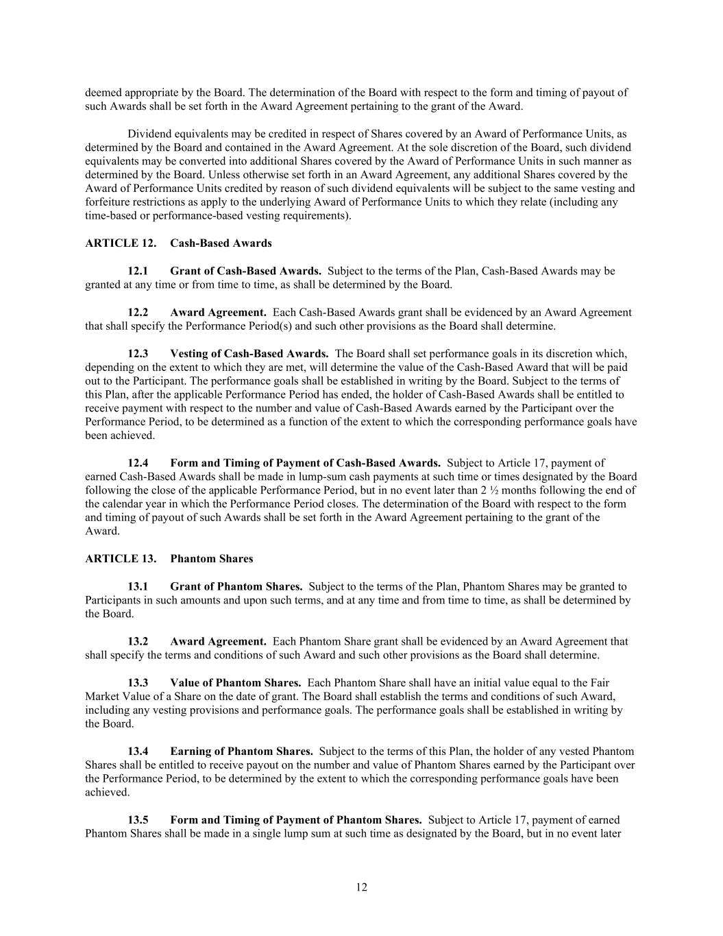 12 deemed appropriate by the Board. The determination of the Board with respect to the form and timing of payout of such Awards shall be set forth in the Award Agreement pertaining to the grant of the Award. Dividend equivalents may be credited in respect of Shares covered by an Award of Performance Units, as determined by the Board and contained in the Award Agreement. At the sole discretion of the Board, such dividend equivalents may be converted into additional Shares covered by the Award of Performance Units in such manner as determined by the Board. Unless otherwise set forth in an Award Agreement, any additional Shares covered by the Award of Performance Units credited by reason of such dividend equivalents will be subject to the same vesting and forfeiture restrictions as apply to the underlying Award of Performance Units to which they relate (including any time-based or performance-based vesting requirements). ARTICLE 12. Cash-Based Awards 12.1 Grant of Cash-Based Awards. Subject to the terms of the Plan, Cash-Based Awards may be granted at any time or from time to time, as shall be determined by the Board. 12.2 Award Agreement. Each Cash-Based Awards grant shall be evidenced by an Award Agreement that shall specify the Performance Period(s) and such other provisions as the Board shall determine. 12.3 Vesting of Cash-Based Awards. The Board shall set performance goals in its discretion which, depending on the extent to which they are met, will determine the value of the Cash-Based Award that will be paid out to the Participant. The performance goals shall be established in writing by the Board. Subject to the terms of this Plan, after the applicable Performance Period has ended, the holder of Cash-Based Awards shall be entitled to receive payment with respect to the number and value of Cash-Based Awards earned by the Participant over the Performance Period, to be determined as a function of the extent to which the corresponding performance goals have been achieved. 12.4 Form and Timing of Payment of Cash-Based Awards. Subject to Article 17, payment of earned Cash-Based Awards shall be made in lump-sum cash payments at such time or times designated by the Board following the close of the applicable Performance Period, but in no event later than 2 ½ months following the end of the calendar year in which the Performance Period closes. The determination of the Board with respect to the form and timing of payout of such Awards shall be set forth in the Award Agreement pertaining to the grant of the Award. ARTICLE 13. Phantom Shares 13.1 Grant of Phantom Shares. Subject to the terms of the Plan, Phantom Shares may be granted to Participants in such amounts and upon such terms, and at any time and from time to time, as shall be determined by the Board. 13.2 Award Agreement. Each Phantom Share grant shall be evidenced by an Award Agreement that shall specify the terms and conditions of such Award and such other provisions as the Board shall determine. 13.3 Value of Phantom Shares. Each Phantom Share shall have an initial value equal to the Fair Market Value of a Share on the date of grant. The Board shall establish the terms and conditions of such Award, including any vesting provisions and performance goals. The performance goals shall be established in writing by the Board. 13.4 Earning of Phantom Shares. Subject to the terms of this Plan, the holder of any vested Phantom Shares shall be entitled to receive payout on the number and value of Phantom Shares earned by the Participant over the Performance Period, to be determined by the extent to which the corresponding performance goals have been achieved. 13.5 Form and Timing of Payment of Phantom Shares. Subject to Article 17, payment of earned Phantom Shares shall be made in a single lump sum at such time as designated by the Board, but in no event later