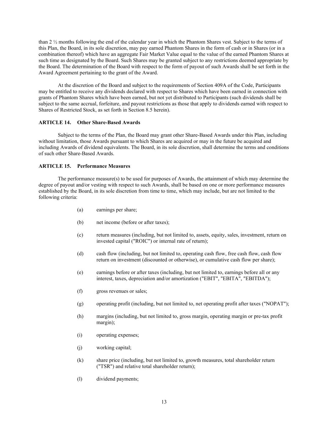 13 than 2 ½ months following the end of the calendar year in which the Phantom Shares vest. Subject to the terms of this Plan, the Board, in its sole discretion, may pay earned Phantom Shares in the form of cash or in Shares (or in a combination thereof) which have an aggregate Fair Market Value equal to the value of the earned Phantom Shares at such time as designated by the Board. Such Shares may be granted subject to any restrictions deemed appropriate by the Board. The determination of the Board with respect to the form of payout of such Awards shall be set forth in the Award Agreement pertaining to the grant of the Award. At the discretion of the Board and subject to the requirements of Section 409A of the Code, Participants may be entitled to receive any dividends declared with respect to Shares which have been earned in connection with grants of Phantom Shares which have been earned, but not yet distributed to Participants (such dividends shall be subject to the same accrual, forfeiture, and payout restrictions as those that apply to dividends earned with respect to Shares of Restricted Stock, as set forth in Section 8.5 herein). ARTICLE 14. Other Share-Based Awards Subject to the terms of the Plan, the Board may grant other Share-Based Awards under this Plan, including without limitation, those Awards pursuant to which Shares are acquired or may in the future be acquired and including Awards of dividend equivalents. The Board, in its sole discretion, shall determine the terms and conditions of such other Share-Based Awards. ARTICLE 15. Performance Measures The performance measure(s) to be used for purposes of Awards, the attainment of which may determine the degree of payout and/or vesting with respect to such Awards, shall be based on one or more performance measures established by the Board, in its sole discretion from time to time, which may include, but are not limited to the following criteria: (a) earnings per share; (b) net income (before or after taxes); (c) return measures (including, but not limited to, assets, equity, sales, investment, return on invested capital ("ROIC") or internal rate of return); (d) cash flow (including, but not limited to, operating cash flow, free cash flow, cash flow return on investment (discounted or otherwise), or cumulative cash flow per share); (e) earnings before or after taxes (including, but not limited to, earnings before all or any interest, taxes, depreciation and/or amortization ("EBIT", "EBITA", "EBITDA"); (f) gross revenues or sales; (g) operating profit (including, but not limited to, net operating profit after taxes ("NOPAT"); (h) margins (including, but not limited to, gross margin, operating margin or pre-tax profit margin); (i) operating expenses; (j) working capital; (k) share price (including, but not limited to, growth measures, total shareholder return ("TSR") and relative total shareholder return); (l) dividend payments;