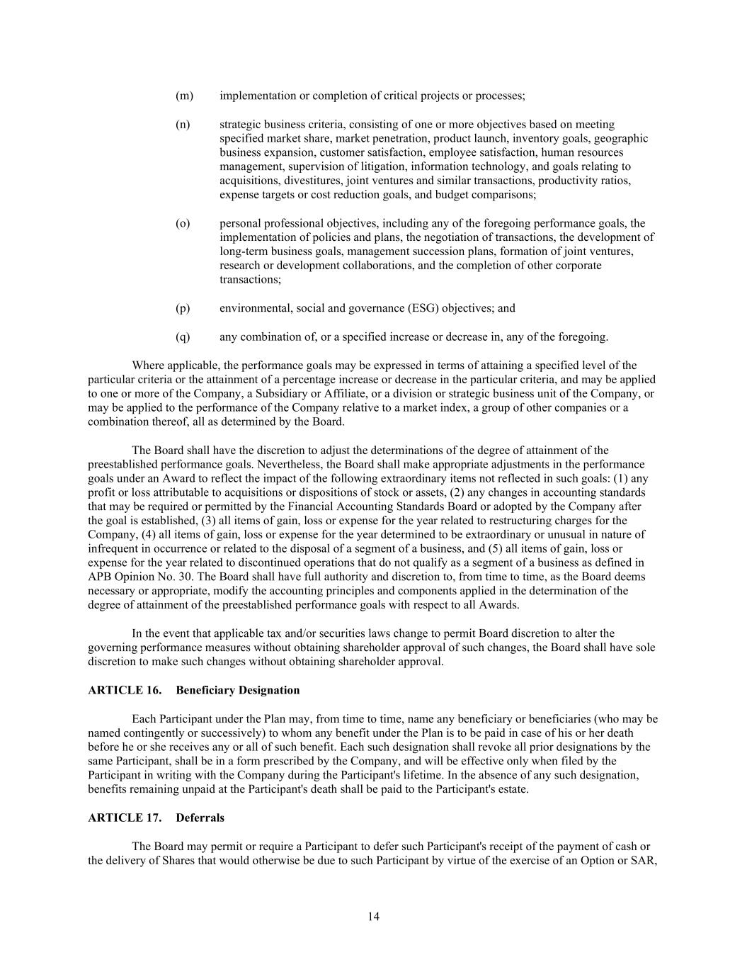 14 (m) implementation or completion of critical projects or processes; (n) strategic business criteria, consisting of one or more objectives based on meeting specified market share, market penetration, product launch, inventory goals, geographic business expansion, customer satisfaction, employee satisfaction, human resources management, supervision of litigation, information technology, and goals relating to acquisitions, divestitures, joint ventures and similar transactions, productivity ratios, expense targets or cost reduction goals, and budget comparisons; (o) personal professional objectives, including any of the foregoing performance goals, the implementation of policies and plans, the negotiation of transactions, the development of long-term business goals, management succession plans, formation of joint ventures, research or development collaborations, and the completion of other corporate transactions; (p) environmental, social and governance (ESG) objectives; and (q) any combination of, or a specified increase or decrease in, any of the foregoing. Where applicable, the performance goals may be expressed in terms of attaining a specified level of the particular criteria or the attainment of a percentage increase or decrease in the particular criteria, and may be applied to one or more of the Company, a Subsidiary or Affiliate, or a division or strategic business unit of the Company, or may be applied to the performance of the Company relative to a market index, a group of other companies or a combination thereof, all as determined by the Board. The Board shall have the discretion to adjust the determinations of the degree of attainment of the preestablished performance goals. Nevertheless, the Board shall make appropriate adjustments in the performance goals under an Award to reflect the impact of the following extraordinary items not reflected in such goals: (1) any profit or loss attributable to acquisitions or dispositions of stock or assets, (2) any changes in accounting standards that may be required or permitted by the Financial Accounting Standards Board or adopted by the Company after the goal is established, (3) all items of gain, loss or expense for the year related to restructuring charges for the Company, (4) all items of gain, loss or expense for the year determined to be extraordinary or unusual in nature of infrequent in occurrence or related to the disposal of a segment of a business, and (5) all items of gain, loss or expense for the year related to discontinued operations that do not qualify as a segment of a business as defined in APB Opinion No. 30. The Board shall have full authority and discretion to, from time to time, as the Board deems necessary or appropriate, modify the accounting principles and components applied in the determination of the degree of attainment of the preestablished performance goals with respect to all Awards. In the event that applicable tax and/or securities laws change to permit Board discretion to alter the governing performance measures without obtaining shareholder approval of such changes, the Board shall have sole discretion to make such changes without obtaining shareholder approval. ARTICLE 16. Beneficiary Designation Each Participant under the Plan may, from time to time, name any beneficiary or beneficiaries (who may be named contingently or successively) to whom any benefit under the Plan is to be paid in case of his or her death before he or she receives any or all of such benefit. Each such designation shall revoke all prior designations by the same Participant, shall be in a form prescribed by the Company, and will be effective only when filed by the Participant in writing with the Company during the Participant's lifetime. In the absence of any such designation, benefits remaining unpaid at the Participant's death shall be paid to the Participant's estate. ARTICLE 17. Deferrals The Board may permit or require a Participant to defer such Participant's receipt of the payment of cash or the delivery of Shares that would otherwise be due to such Participant by virtue of the exercise of an Option or SAR,
