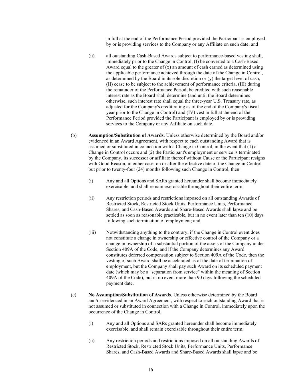 16 in full at the end of the Performance Period provided the Participant is employed by or is providing services to the Company or any Affiliate on such date; and (ii) all outstanding Cash-Based Awards subject to performance-based vesting shall, immediately prior to the Change in Control, (I) be converted to a Cash-Based Award equal to the greater of (x) an amount of cash earned as determined using the applicable performance achieved through the date of the Change in Control, as determined by the Board in its sole discretion or (y) the target level of cash, (II) cease to be subject to the achievement of performance criteria, (III) during the remainder of the Performance Period, be credited with such reasonable interest rate as the Board shall determine (and until the Board determines otherwise, such interest rate shall equal the three-year U.S. Treasury rate, as adjusted for the Company's credit rating as of the end of the Company's fiscal year prior to the Change in Control) and (IV) vest in full at the end of the Performance Period provided the Participant is employed by or is providing services to the Company or any Affiliate on such date. (b) Assumption/Substitution of Awards. Unless otherwise determined by the Board and/or evidenced in an Award Agreement, with respect to each outstanding Award that is assumed or substituted in connection with a Change in Control, in the event that (1) a Change in Control occurs and (2) the Participant's employment or service is terminated by the Company, its successor or affiliate thereof without Cause or the Participant resigns with Good Reason, in either case, on or after the effective date of the Change in Control but prior to twenty-four (24) months following such Change in Control, then: (i) Any and all Options and SARs granted hereunder shall become immediately exercisable, and shall remain exercisable throughout their entire term; (ii) Any restriction periods and restrictions imposed on all outstanding Awards of Restricted Stock, Restricted Stock Units, Performance Units, Performance Shares, and Cash-Based Awards and Share-Based Awards shall lapse and be settled as soon as reasonable practicable, but in no event later than ten (10) days following such termination of employment; and (iii) Notwithstanding anything to the contrary, if the Change in Control event does not constitute a change in ownership or effective control of the Company or a change in ownership of a substantial portion of the assets of the Company under Section 409A of the Code, and if the Company determines any Award constitutes deferred compensation subject to Section 409A of the Code, then the vesting of such Award shall be accelerated as of the date of termination of employment, but the Company shall pay such Award on its scheduled payment date (which may be a "separation from service" within the meaning of Section 409A of the Code), but in no event more than 90 days following the scheduled payment date. (c) No Assumption/Substitution of Awards. Unless otherwise determined by the Board and/or evidenced in an Award Agreement, with respect to each outstanding Award that is not assumed or substituted in connection with a Change in Control, immediately upon the occurrence of the Change in Control, (i) Any and all Options and SARs granted hereunder shall become immediately exercisable, and shall remain exercisable throughout their entire term; (ii) Any restriction periods and restrictions imposed on all outstanding Awards of Restricted Stock, Restricted Stock Units, Performance Units, Performance Shares, and Cash-Based Awards and Share-Based Awards shall lapse and be