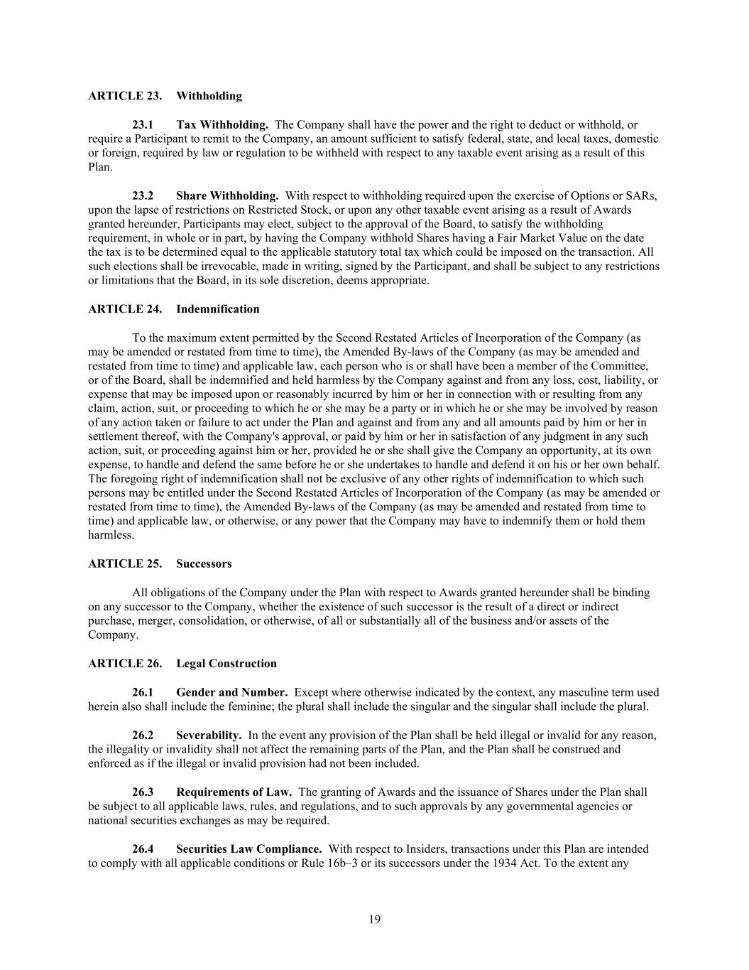 19 ARTICLE 23. Withholding 23.1 Tax Withholding. The Company shall have the power and the right to deduct or withhold, or require a Participant to remit to the Company, an amount sufficient to satisfy federal, state, and local taxes, domestic or foreign, required by law or regulation to be withheld with respect to any taxable event arising as a result of this Plan. 23.2 Share Withholding. With respect to withholding required upon the exercise of Options or SARs, upon the lapse of restrictions on Restricted Stock, or upon any other taxable event arising as a result of Awards granted hereunder, Participants may elect, subject to the approval of the Board, to satisfy the withholding requirement, in whole or in part, by having the Company withhold Shares having a Fair Market Value on the date the tax is to be determined equal to the applicable statutory total tax which could be imposed on the transaction. All such elections shall be irrevocable, made in writing, signed by the Participant, and shall be subject to any restrictions or limitations that the Board, in its sole discretion, deems appropriate. ARTICLE 24. Indemnification To the maximum extent permitted by the Second Restated Articles of Incorporation of the Company (as may be amended or restated from time to time), the Amended By-laws of the Company (as may be amended and restated from time to time) and applicable law, each person who is or shall have been a member of the Committee, or of the Board, shall be indemnified and held harmless by the Company against and from any loss, cost, liability, or expense that may be imposed upon or reasonably incurred by him or her in connection with or resulting from any claim, action, suit, or proceeding to which he or she may be a party or in which he or she may be involved by reason of any action taken or failure to act under the Plan and against and from any and all amounts paid by him or her in settlement thereof, with the Company's approval, or paid by him or her in satisfaction of any judgment in any such action, suit, or proceeding against him or her, provided he or she shall give the Company an opportunity, at its own expense, to handle and defend the same before he or she undertakes to handle and defend it on his or her own behalf. The foregoing right of indemnification shall not be exclusive of any other rights of indemnification to which such persons may be entitled under the Second Restated Articles of Incorporation of the Company (as may be amended or restated from time to time), the Amended By-laws of the Company (as may be amended and restated from time to time) and applicable law, or otherwise, or any power that the Company may have to indemnify them or hold them harmless. ARTICLE 25. Successors All obligations of the Company under the Plan with respect to Awards granted hereunder shall be binding on any successor to the Company, whether the existence of such successor is the result of a direct or indirect purchase, merger, consolidation, or otherwise, of all or substantially all of the business and/or assets of the Company. ARTICLE 26. Legal Construction 26.1 Gender and Number. Except where otherwise indicated by the context, any masculine term used herein also shall include the feminine; the plural shall include the singular and the singular shall include the plural. 26.2 Severability. In the event any provision of the Plan shall be held illegal or invalid for any reason, the illegality or invalidity shall not affect the remaining parts of the Plan, and the Plan shall be construed and enforced as if the illegal or invalid provision had not been included. 26.3 Requirements of Law. The granting of Awards and the issuance of Shares under the Plan shall be subject to all applicable laws, rules, and regulations, and to such approvals by any governmental agencies or national securities exchanges as may be required. 26.4 Securities Law Compliance. With respect to Insiders, transactions under this Plan are intended to comply with all applicable conditions or Rule 16b–3 or its successors under the 1934 Act. To the extent any