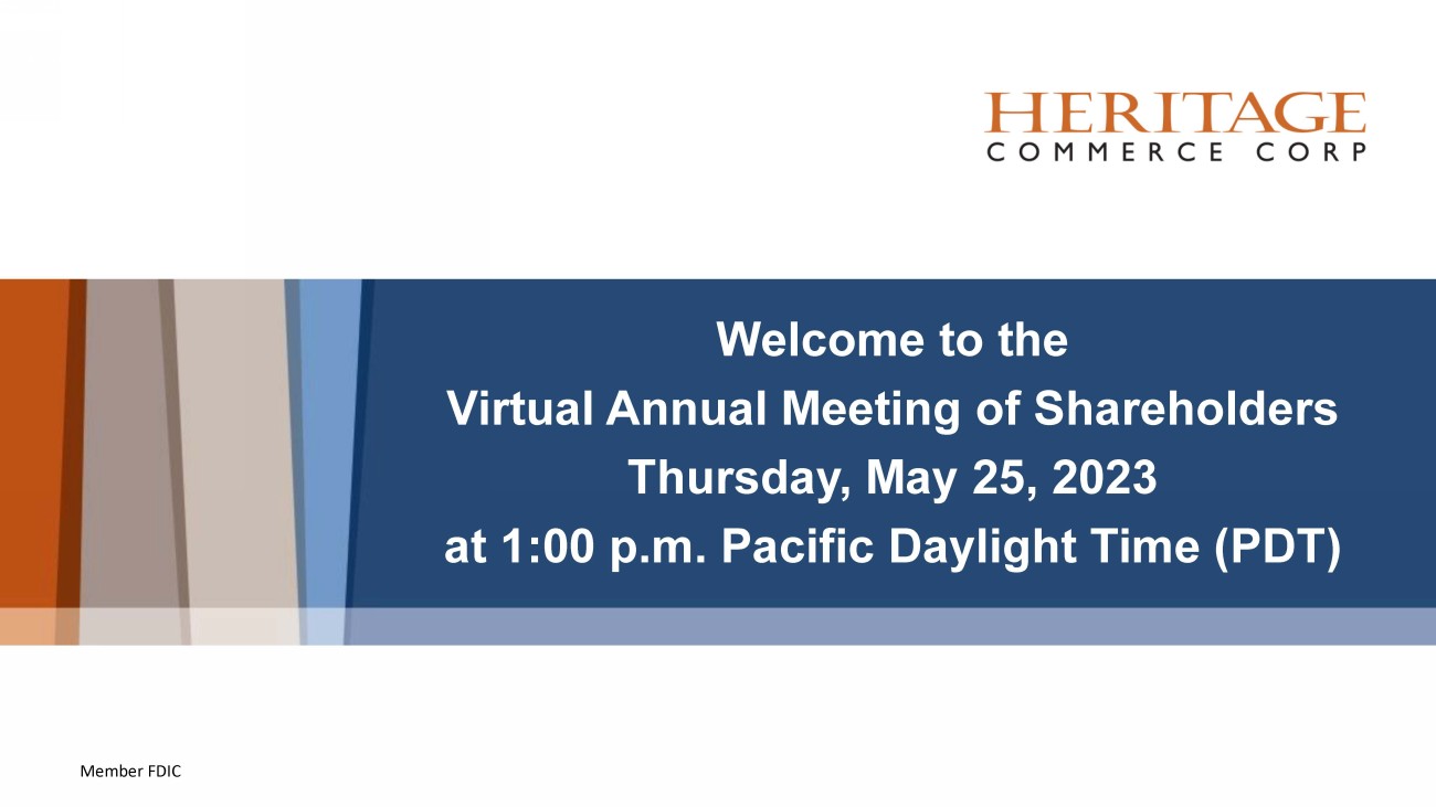 Member FDIC Welcome to the Virtual Annual Meeting of Shareholders Thursday, May 25, 2023 at 1:00 p.m. Pacific Daylight Time (PDT)