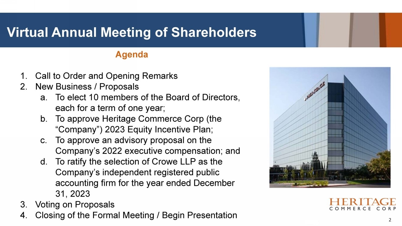 Prepared for the North Bay Advisory Board Virtual Annual Meeting of Shareholders Agenda 1. Call to Order and Opening Remarks 2. New Business / Proposals a. To elect 10 members of the Board of Directors, each for a term of one year ; b. To approve Heritage Commerce Corp (the “Company”) 2023 Equity Incentive Plan; c. To approve an advisory proposal on the Company’s 2022 executive compensation ; and d. To ratify the selection of Crowe LLP as the Company’s independent registered public accounting firm for the year ended December 31, 2023 3. Voting on Proposals 4. Closing of the Formal Meeting / Begin Presentation 2