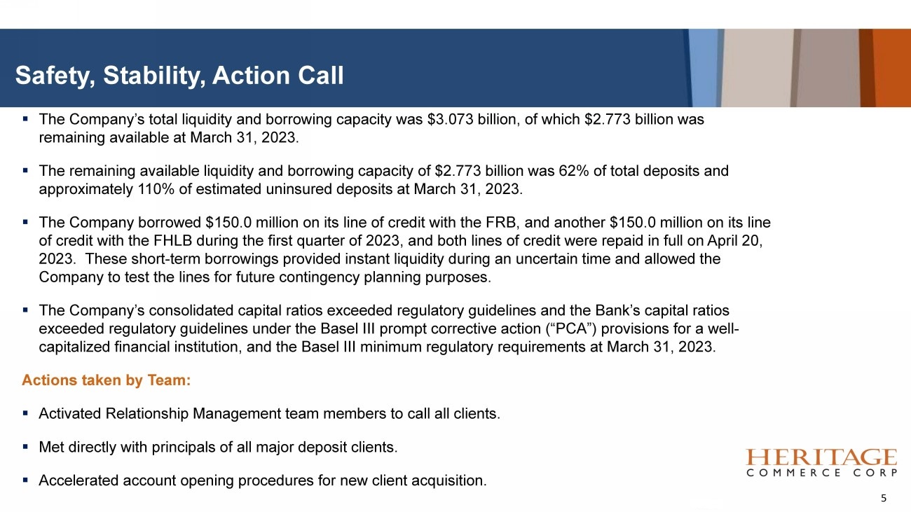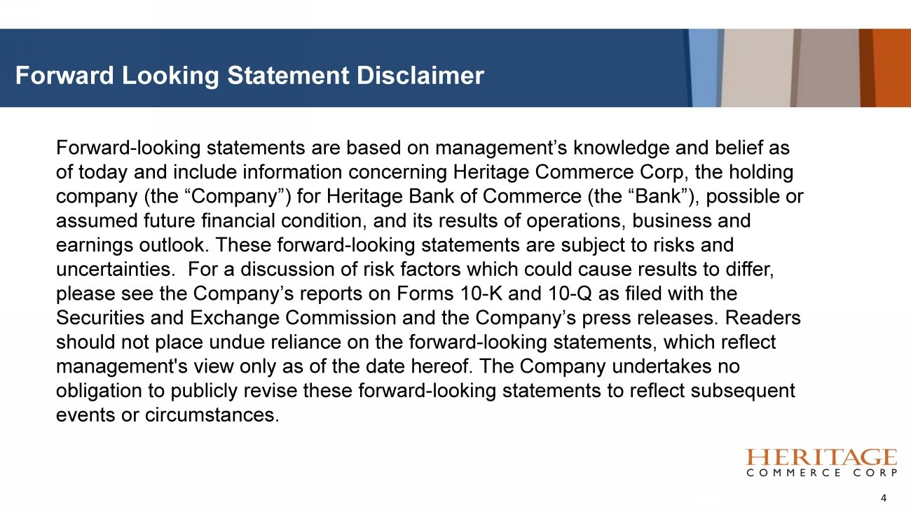 Prepared for the North Bay Advisory Board Forward Looking Statement Disclaimer Forward - looking statements are based on management’s knowledge and belief as of today and include information concerning Heritage Commerce Corp, the holding company (the “Company”) for Heritage Bank of Commerce (the “Bank”), possible or assumed future financial condition, and its results of operations, business and earnings outlook. These forward - looking statements are subject to risks and uncertainties. For a discussion of risk factors which could cause results to differ, please see the Company’s reports on Forms 10 - K and 10 - Q as filed with the Securities and Exchange Commission and the Company’s press releases. Readers should not place undue reliance on the forward - looking statements, which reflect management's view only as of the date hereof. The Company undertakes no obligation to publicly revise these forward - looking statements to reflect subsequent events or circumstances. 4