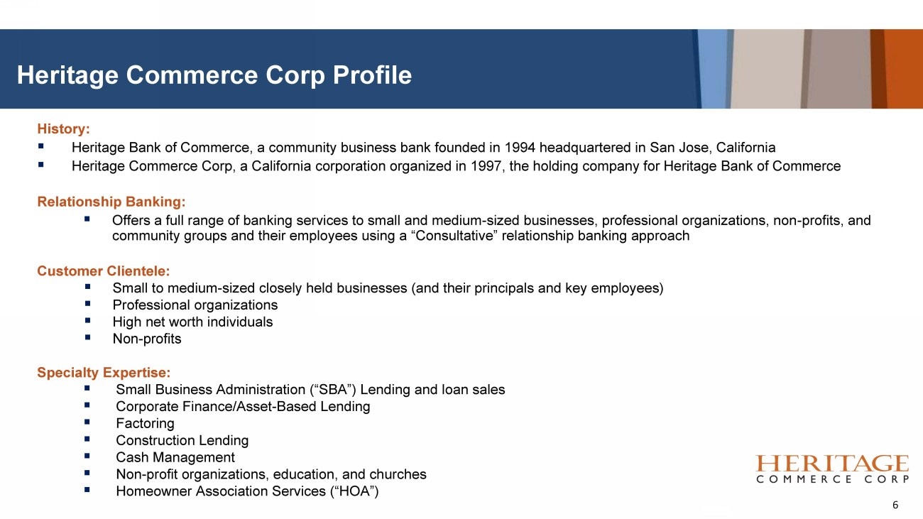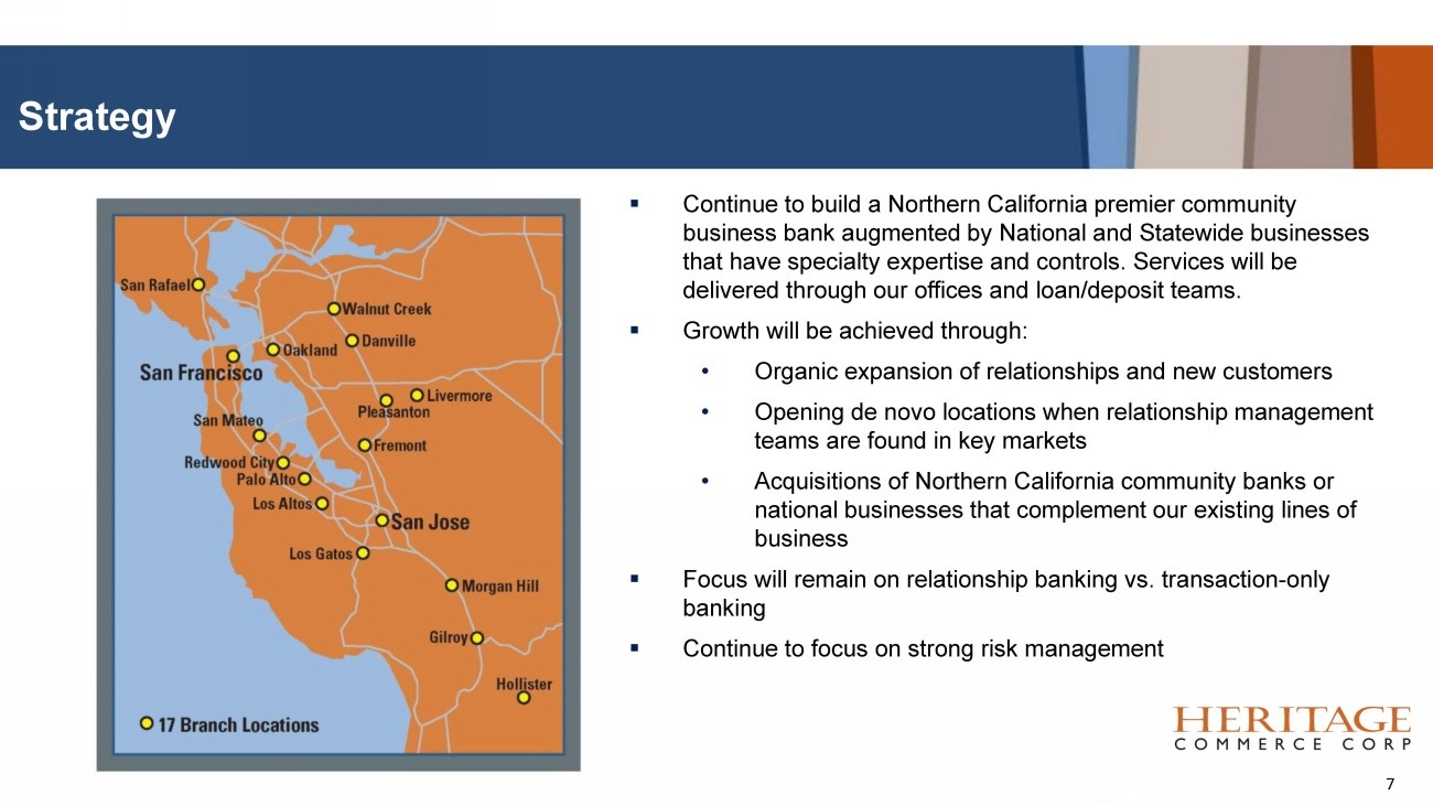 Prepared for the North Bay Advisory Board Heritage Commerce Corp Profile History: ▪ Heritage Bank of Commerce, a community business bank founded in 1994 headquartered in San Jose, California ▪ Heritage Commerce Corp, a California corporation organized in 1997, the holding company for Heritage Bank of Commerce Relationship Banking: ▪ Offers a full range of banking services to small and medium - sized businesses, professional organizations, non - profits, and community groups and their employees using a “Consultative” relationship banking approach Customer Clientele: ▪ Small to medium - sized closely held businesses (and their principals and key employees) ▪ Professional organizations ▪ High net worth individuals ▪ Non - profits Specialty Expertise: ▪ Small Business Administration (“SBA”) Lending and loan sales ▪ Corporate Finance/Asset - Based Lending ▪ Factoring ▪ Construction Lending ▪ Cash Management ▪ Non - profit organizations, education, and churches ▪ Homeowner Association Services (“HOA”) 6