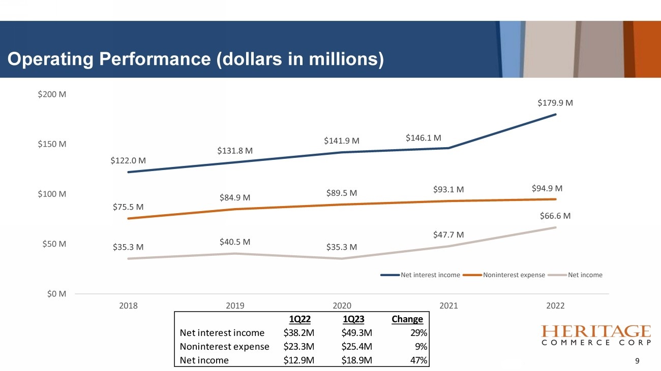 Prepared for the North Bay Advisory Board Balance Sheet Highlights (dollars in billions) 8 $3.1 B $4.1 B $4.6 B $5.5 B $5.2 B $5.5 B $1.9 B $2.5 B $2.6 B $3.1 B $3.3 B $3.3 B $2.6 B $3.4 B $3.9 B $4.8 B $4.4 B $4.4 B $0.0 B $1.0 B $2.0 B $3.0 B $4.0 B $5.0 B $6.0 B 2018 2019 2020 2021 2022 1Q23 Total assets Total loans Total deposits