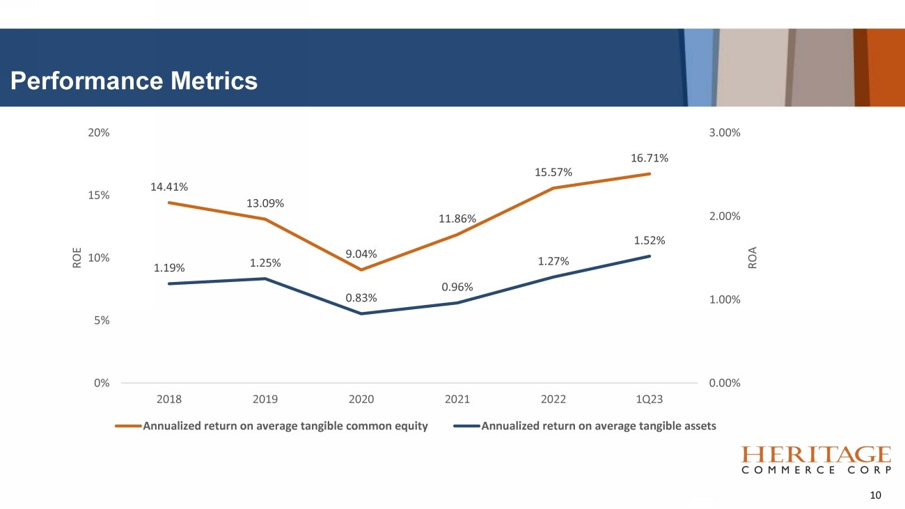 Prepared for the North Bay Advisory Board Operating Performance (dollars in millions) 9 $122.0 M $131.8 M $141.9 M $146.1 M $179.9 M $75.5 M $84.9 M $89.5 M $93.1 M $94.9 M $35.3 M $40.5 M $35.3 M $47.7 M $66.6 M $0 M $50 M $100 M $150 M $200 M 2018 2019 2020 2021 2022 Net interest income Noninterest expense Net income 1Q22 1Q23 Change Net interest income $38.2M $49.3M 29% Noninterest expense $23.3M $25.4M 9% Net income $12.9M $18.9M 47%