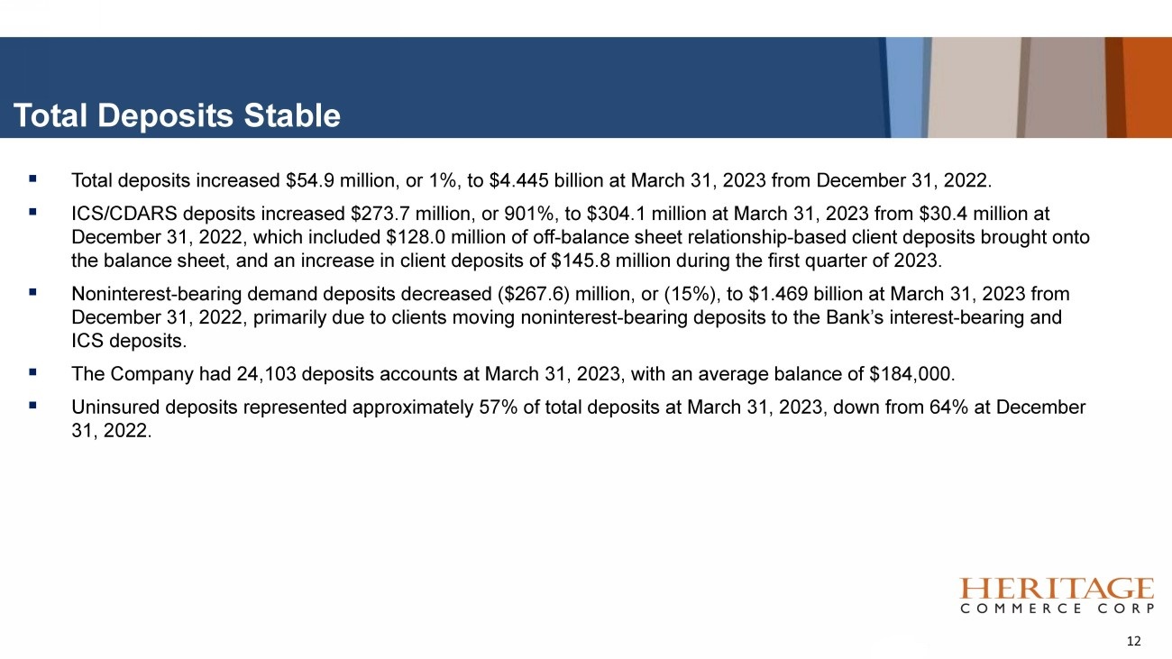 Prepared for the North Bay Advisory Board Strong Deposit Base at March 31, 2023 Demand, noninterest - bearing 33% Demand, interest - bearing 27% Savings and money market 28% Time deposits - under $250,000 1% Time deposits - $250,000 and over 4% *ICS/CDARS - interest - bearing demand, money market and time deposits 7% Total Cost of Deposits of 0.54% 11 *Insured Cash Sweep (“ICS”)/Certificate of Deposits Account Registry Service (“CDARS”) $4,444,538,000