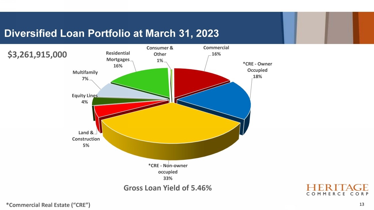 Prepared for the North Bay Advisory Board Total Deposits Stable ▪ Total deposits increased $54.9 million, or 1%, to $4.445 billion at March 31, 2023 from December 31, 2022. ▪ ICS/CDARS deposits increased $273.7 million, or 901%, to $304.1 million at March 31, 2023 from $30.4 million at December 31, 2022, which included $128.0 million of off - balance sheet relationship - based client deposits brought onto the balance sheet, and an increase in client deposits of $145.8 million during the first quarter of 2023. ▪ Noninterest - bearing demand deposits decreased ($267.6) million, or (15%), to $1.469 billion at March 31, 2023 from December 31, 2022, primarily due to clients moving noninterest - bearing deposits to the Bank’s interest - bearing and ICS deposits. ▪ The Company had 24,103 deposits accounts at March 31, 2023, with an average balance of $184,000. ▪ Uninsured deposits represented approximately 57% of total deposits at March 31, 2023, down from 64% at December 31, 2022. 12