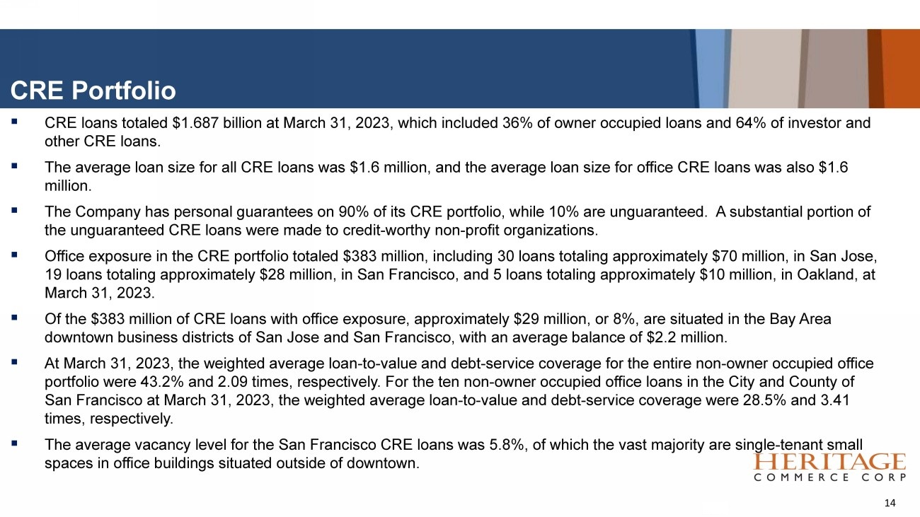 Prepared for the North Bay Advisory Board CRE Portfolio ▪ CRE loans totaled $1.687 billion at March 31, 2023, which included 36% of owner occupied loans and 64% of investor and other CRE loans. ▪ The average loan size for all CRE loans was $1.6 million, and the average loan size for office CRE loans was also $1.6 million. ▪ The Company has personal guarantees on 90% of its CRE portfolio, while 10% are unguaranteed. A substantial portion of the unguaranteed CRE loans were made to credit - worthy non - profit organizations. ▪ Office exposure in the CRE portfolio totaled $383 million, including 30 loans totaling approximately $70 million, in San Jose , 19 loans totaling approximately $28 million, in San Francisco, and 5 loans totaling approximately $10 million, in Oakland, at March 31, 2023. ▪ Of the $383 million of CRE loans with office exposure, approximately $29 million, or 8%, are situated in the Bay Area downtown business districts of San Jose and San Francisco, with an average balance of $2.2 million. ▪ At March 31, 2023, the weighted average loan - to - value and debt - service coverage for the entire non - owner occupied office portfolio were 43.2% and 2.09 times, respectively. For the ten non - owner occupied office loans in the City and County of San Francisco at March 31, 2023, the weighted average loan - to - value and debt - service coverage were 28.5% and 3.41 times, respectively. ▪ The average vacancy level for the San Francisco CRE loans was 5.8%, of which the vast majority are single - tenant small spaces in office buildings situated outside of downtown. 14
