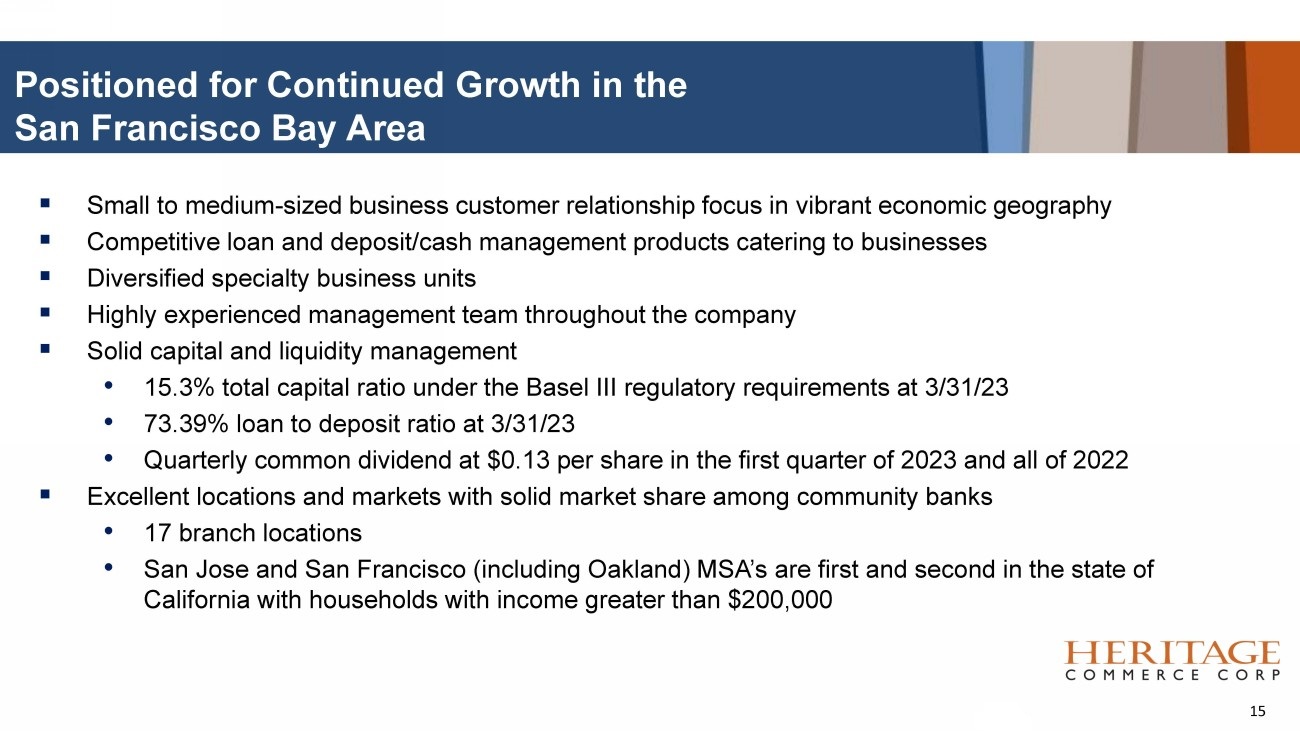 Prepared for the North Bay Advisory Board Positioned for Continued Growth in the San Francisco Bay Area ▪ Small to medium - sized business customer relationship focus in vibrant economic geography ▪ Competitive loan and deposit/cash management products catering to businesses ▪ Diversified specialty business units ▪ Highly experienced management team throughout the company ▪ Solid capital and liquidity management • 15.3% total capital ratio under the Basel III regulatory requirements at 3/31/23 • 73.39% loan to deposit ratio at 3/31/23 • Quarterly common dividend at $0.13 per share in the first quarter of 2023 and all of 2022 ▪ Excellent locations and markets with solid market share among community banks • 17 branch locations • San Jose and San Francisco (including Oakland) MSA’s are first and second in the state of California with households with income greater than $200,000 15
