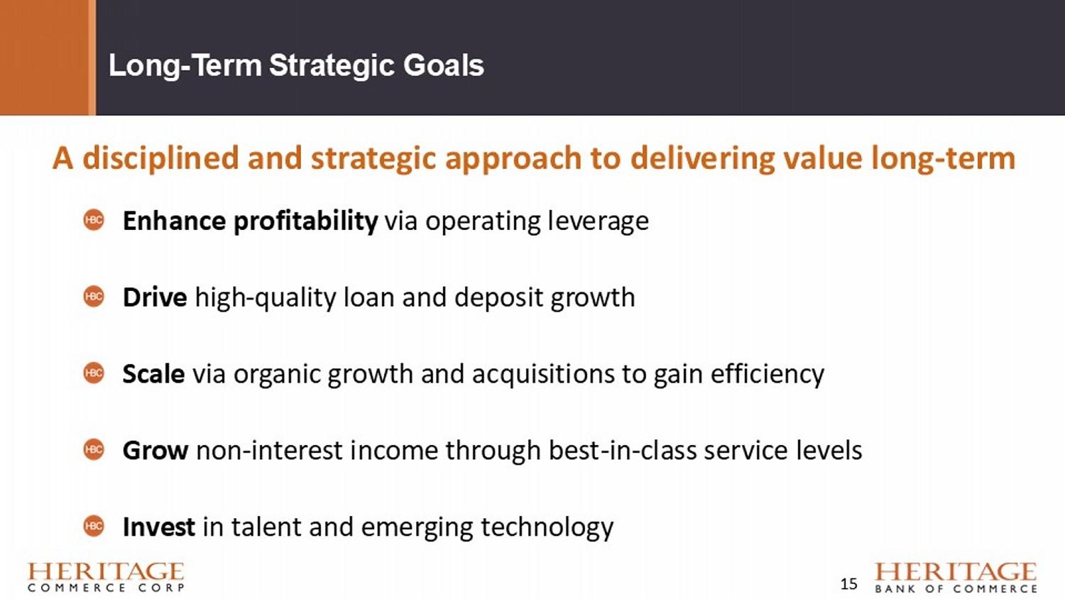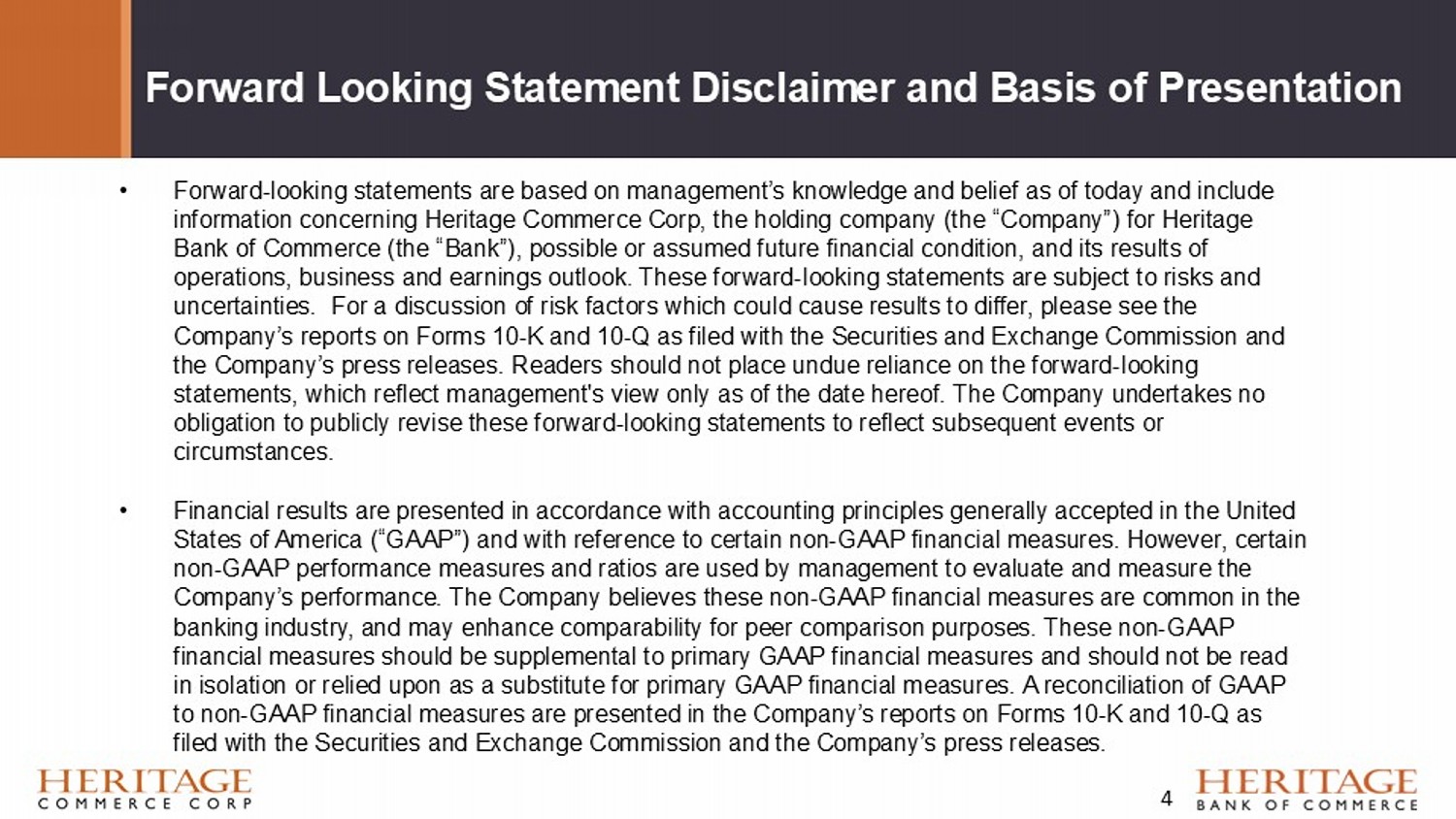 Forward Looking Statement Disclaimer and Basis of Presentation • Forward - looking statements are based on management’s knowledge and belief as of today and include information concerning Heritage Commerce Corp, the holding company (the “Company”) for Heritage Bank of Commerce (the “Bank”), possible or assumed future financial condition, and its results of operations, business and earnings outlook. These forward - looking statements are subject to risks and uncertainties. For a discussion of risk factors which could cause results to differ, please see the Company’s reports on Forms 10 - K and 10 - Q as filed with the Securities and Exchange Commission and the Company’s press releases. Readers should not place undue reliance on the forward - looking statements, which reflect management's view only as of the date hereof. The Company undertakes no obligation to publicly revise these forward - looking statements to reflect subsequent events or circumstances. • Financial results are presented in accordance with accounting principles generally accepted in the United States of America (“GAAP”) and with reference to certain non - GAAP financial measures. However, certain non - GAAP performance measures and ratios are used by management to evaluate and measure the Company’s performance. The Company believes these non - GAAP financial measures are common in the banking industry, and may enhance comparability for peer comparison purposes. These non - GAAP financial measures should be supplemental to primary GAAP financial measures and should not be read in isolation or relied upon as a substitute for primary GAAP financial measures. A reconciliation of GAAP to non - GAAP financial measures are presented in the Company’s reports on Forms 10 - K and 10 - Q as filed with the Securities and Exchange Commission and the Company’s press releases. 4