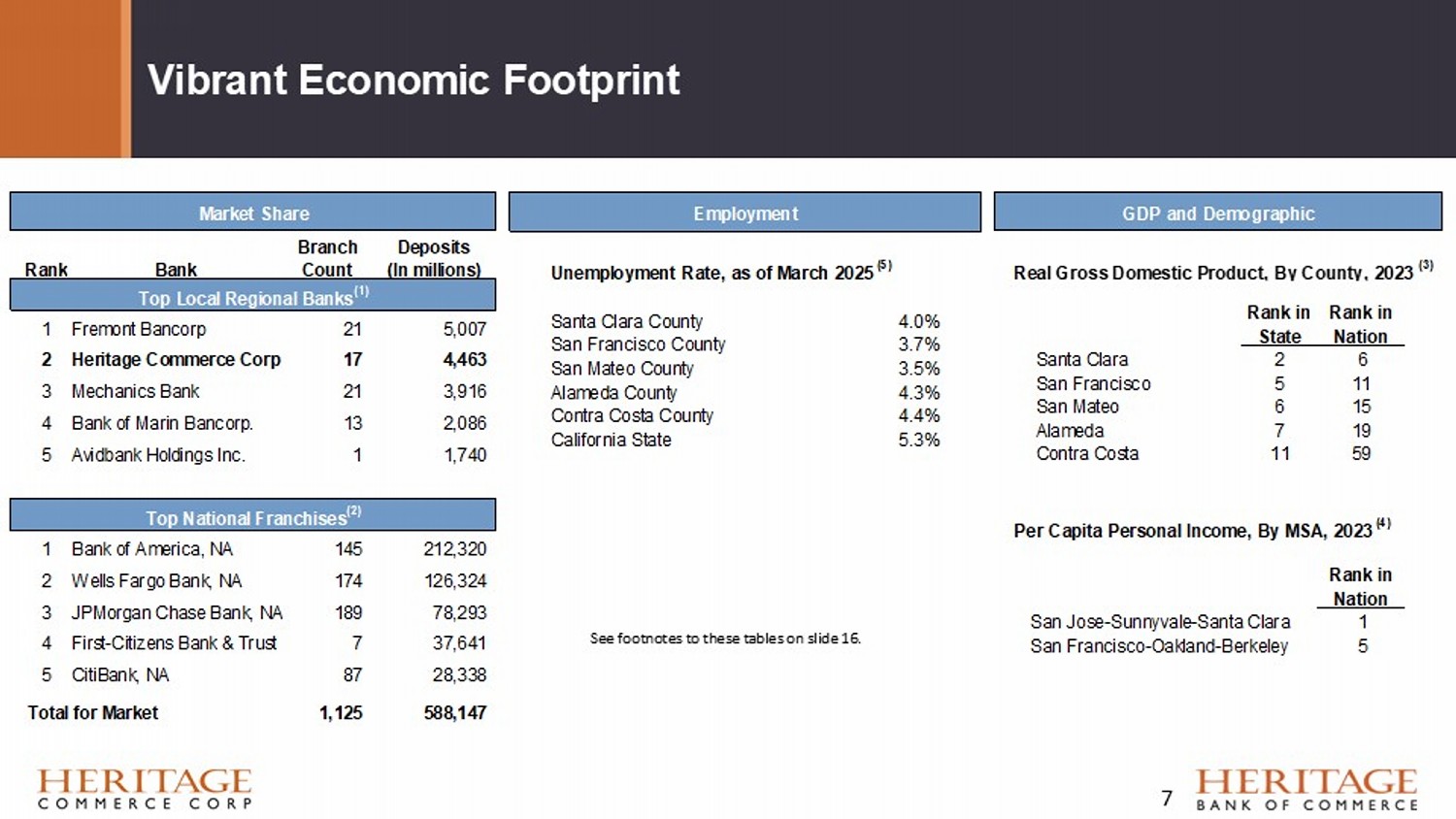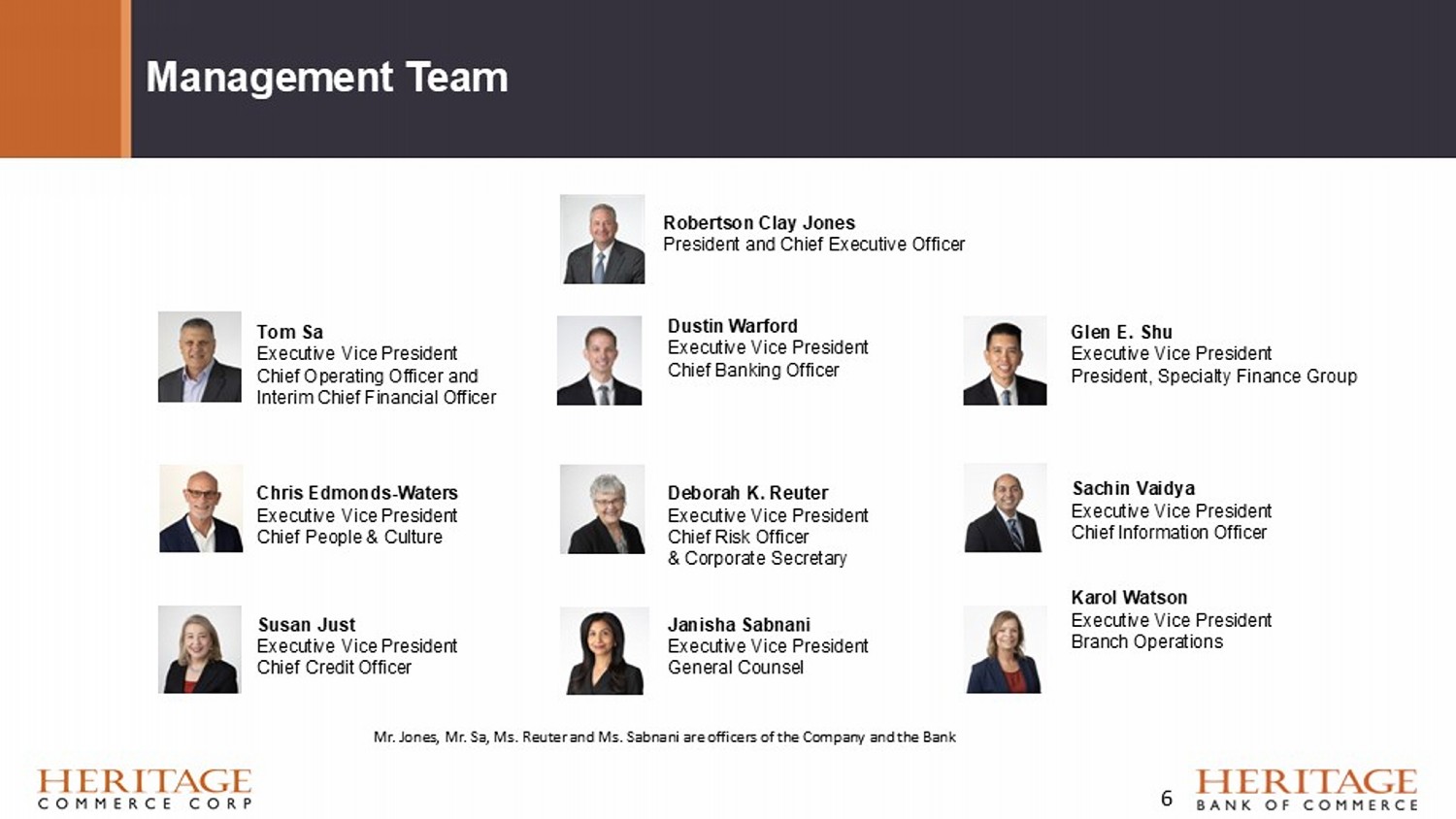 Heritage Commerce Corp: At a Glance Greater San Francisco Bay Area Strategy Heritage Commerce Corp Greater San Francisco Bay Area Ticker HTBK Headquarters San Jose, CA Assets $5.5 billion Loans $3.5 billion Deposits $4.7 billion 13.6% Total Capital Ratio 15.9% Loan to Deposit Ratio 74.45% Corporate Financials as of March 31, 2025 Common Equity Tier 1 Capital Ratio • Northern California’s premier relationship - focused business bank • Offering a wide range of tailored financial solutions including business loans, deposit and treasury management services • Specialty businesses focused on non - profits, SBA, factoring and home owner association management • Low - cost deposit base, well diversified loan portfolio, strong asset quality, and high levels of capital and liquidity • Well positioned to continue increasing market share, adding clients, and generating profitable growth 5