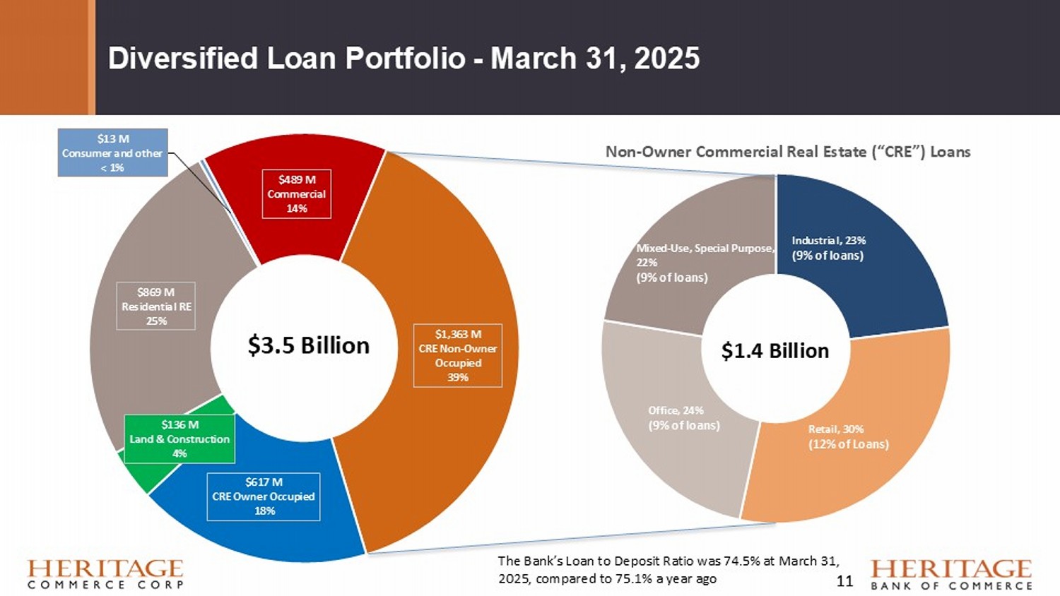 First Quarter 2025 Highlights Net income was $11.6 million, or $0.19 per averaged diluted common share, up from $10.6 million and $0.17 in the fourth quarter of 2024, respectively A further reduction in our cost of funds drove the FTE net interest margin (1) up to 3.39%, compared to 3.32% for the fourth quarter of 2024 Credit quality was strong and improving with nonperforming loans at $6.3 million, or 0.18% of total loans, while the allowance for credit losses on loans to total loans was 1.38% at quarter - end Liquidity and available lines of credit remain robust at $3 billion Deployment of excess cash into quality investment securities, begun in late December, continued in the first quarter with over $150 million purchased in the quarter (1) This is a non - GAAP financial measure. $11.6 million Net income $16.6 million PPNR (1) $0.19 Diluted Earnings per Share 1.25% PPNR Return on Avg. Tangible Assets (1) 12.98% PPNR Return on Avg. Tangible Common Equity (1) 9