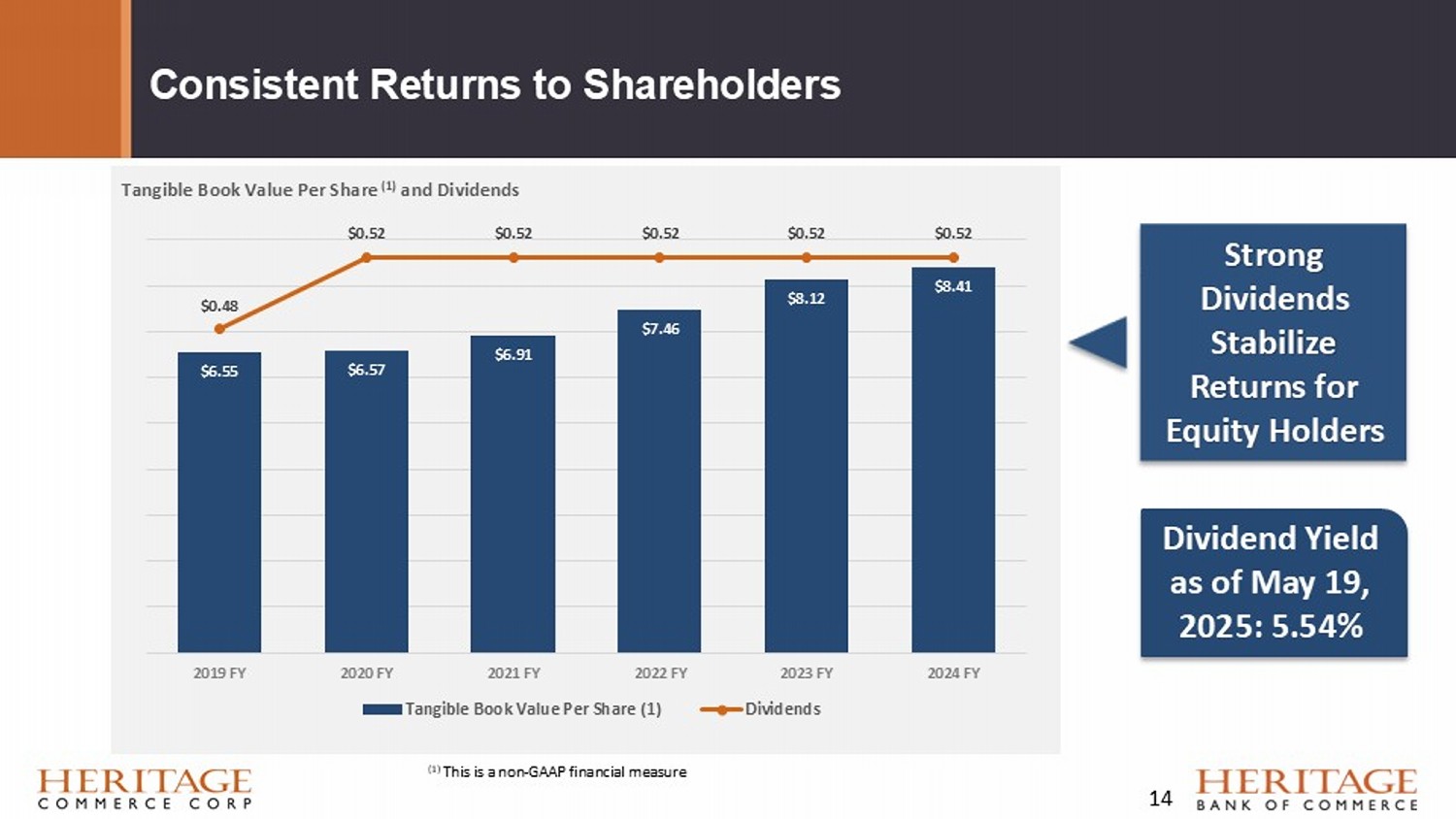 Credit Quality at a Glance - March 31, 2025 x ACLL of $48 million represents 7.6x NPAs and 1.2x of Classified Assets x ACLL 1.38% of gross loans x NPAs totaled $6.3 million on 9 loans and 8 relationships x Classified assets totaled $40.0 million, or 0.73% of total assets x No CRE loans included in NPAs x No foreclosed assets on the balance sheet x No Shared National Credits (“SNCs”) or material purchased participations 7% Classified Assets / Tier 1 Capital & Allowance for Credit Losses on Loans (“ACLL”) 0.11% Nonperforming Assets ("NPAs") / Total Assets 0.11% Net Charge - offs / Average Loans For the Quarter 13