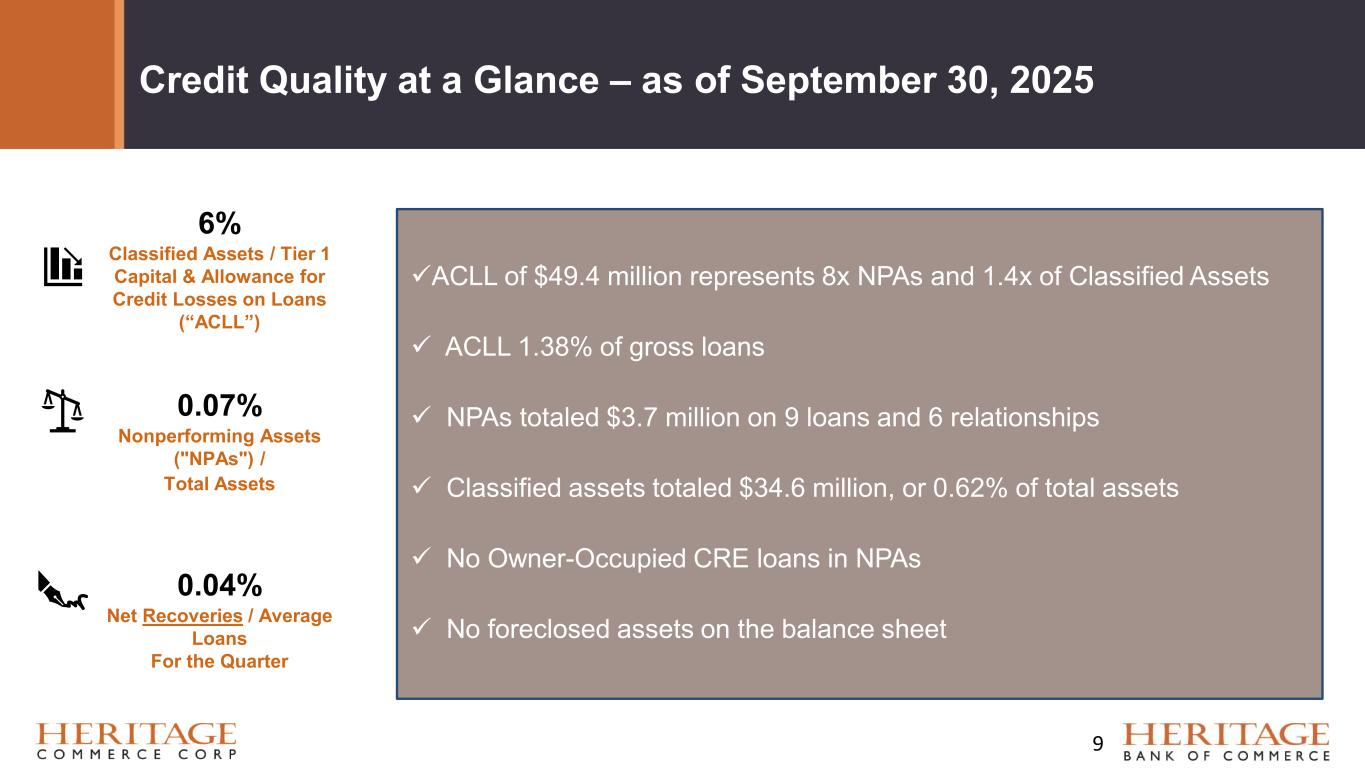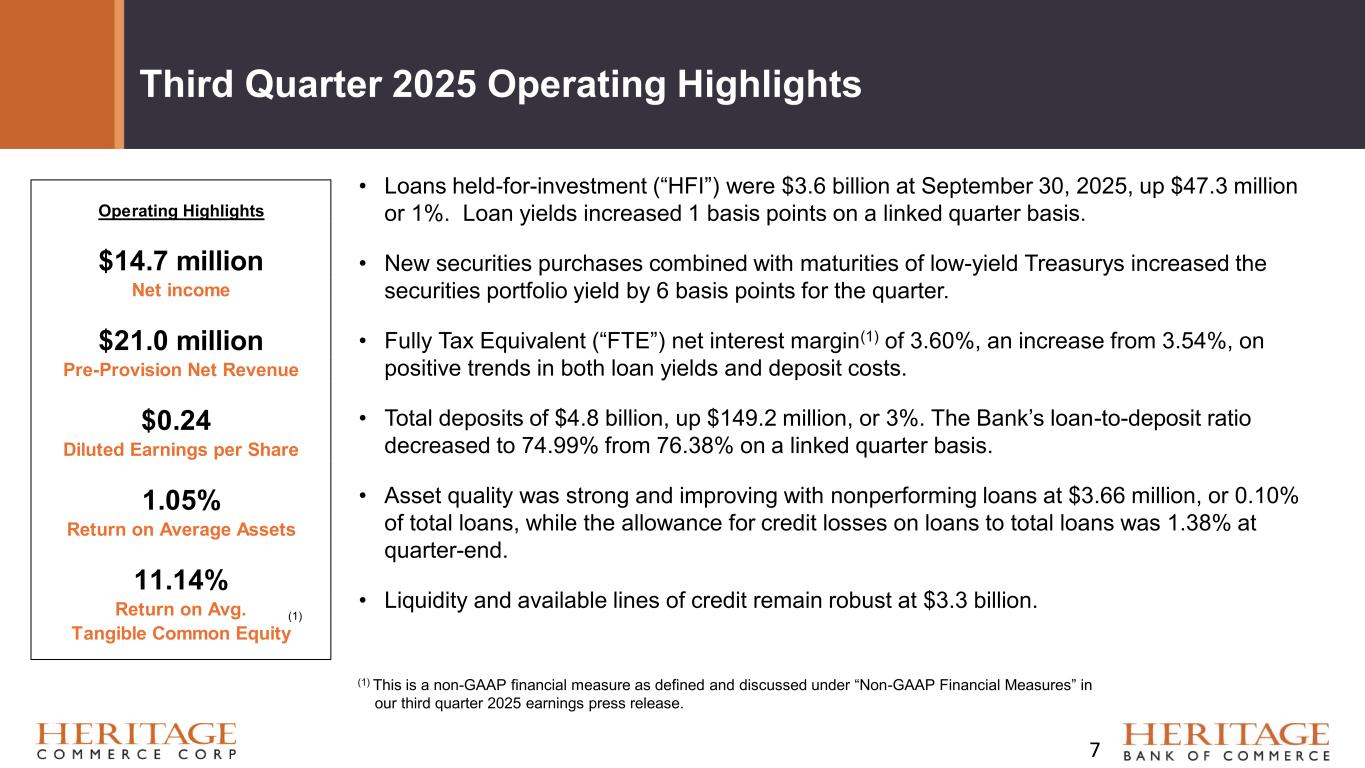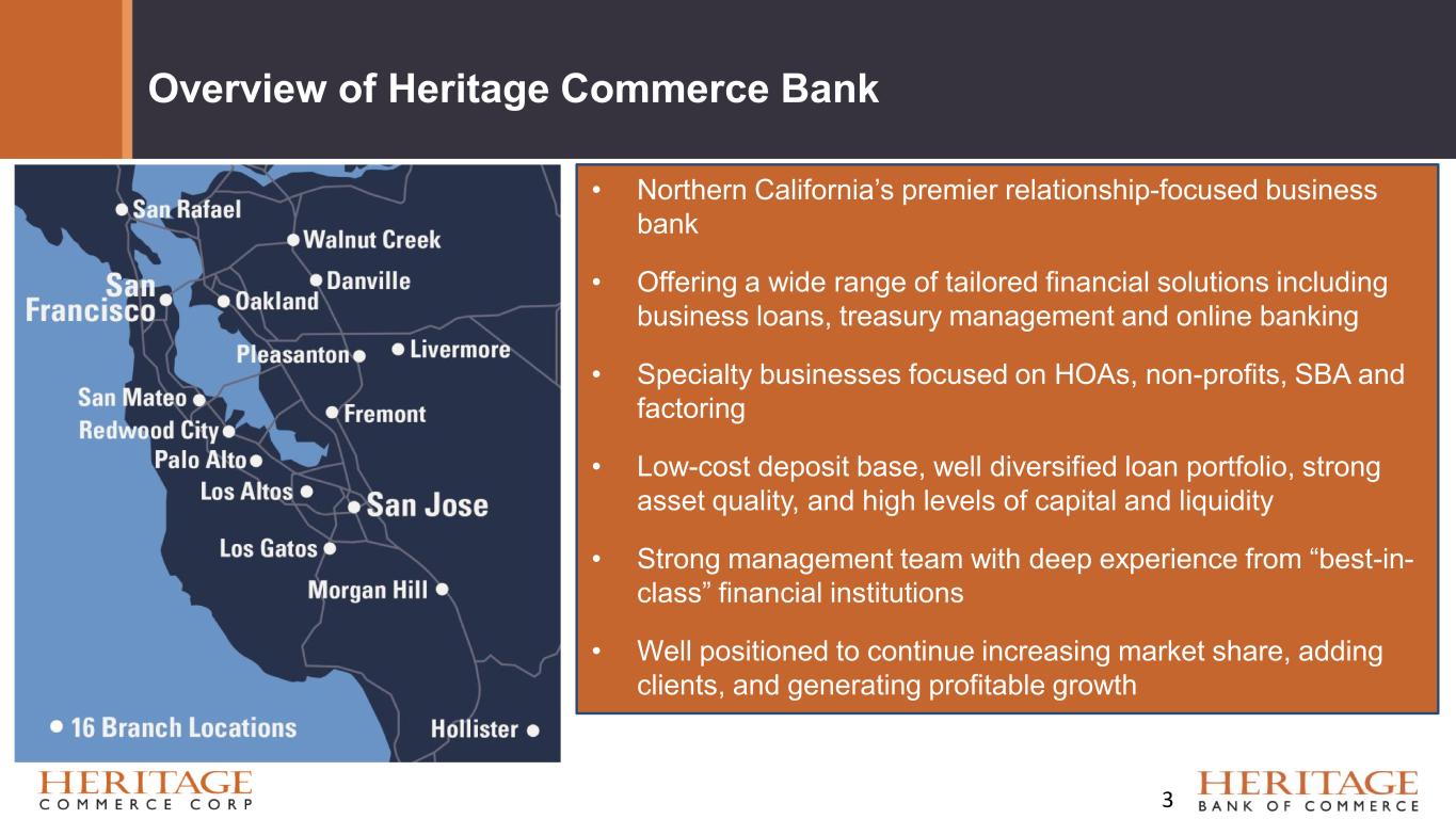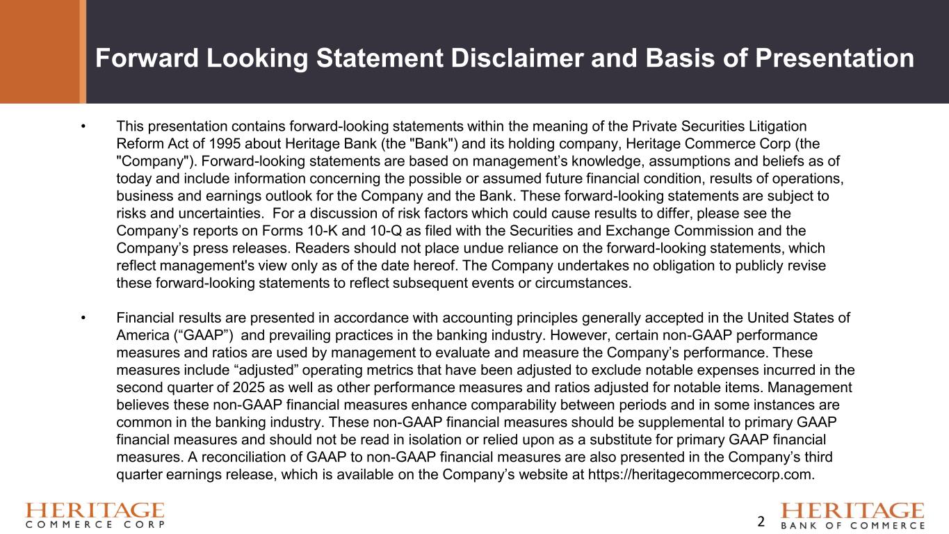 Forward Looking Statement Disclaimer and Basis of Presentation • This presentation contains forward-looking statements within the meaning of the Private Securities Litigation Reform Act of 1995 about Heritage Bank (the "Bank") and its holding company, Heritage Commerce Corp (the "Company"). Forward-looking statements are based on management’s knowledge, assumptions and beliefs as of today and include information concerning the possible or assumed future financial condition, results of operations, business and earnings outlook for the Company and the Bank. These forward-looking statements are subject to risks and uncertainties. For a discussion of risk factors which could cause results to differ, please see the Company’s reports on Forms 10-K and 10-Q as filed with the Securities and Exchange Commission and the Company’s press releases. Readers should not place undue reliance on the forward-looking statements, which reflect management's view only as of the date hereof. The Company undertakes no obligation to publicly revise these forward-looking statements to reflect subsequent events or circumstances. • Financial results are presented in accordance with accounting principles generally accepted in the United States of America (“GAAP”) and prevailing practices in the banking industry. However, certain non-GAAP performance measures and ratios are used by management to evaluate and measure the Company’s performance. These measures include “adjusted” operating metrics that have been adjusted to exclude notable expenses incurred in the second quarter of 2025 as well as other performance measures and ratios adjusted for notable items. Management believes these non-GAAP financial measures enhance comparability between periods and in some instances are common in the banking industry. These non-GAAP financial measures should be supplemental to primary GAAP financial measures and should not be read in isolation or relied upon as a substitute for primary GAAP financial measures. A reconciliation of GAAP to non-GAAP financial measures are also presented in the Company’s third quarter earnings release, which is available on the Company’s website at https://heritagecommercecorp.com. 2