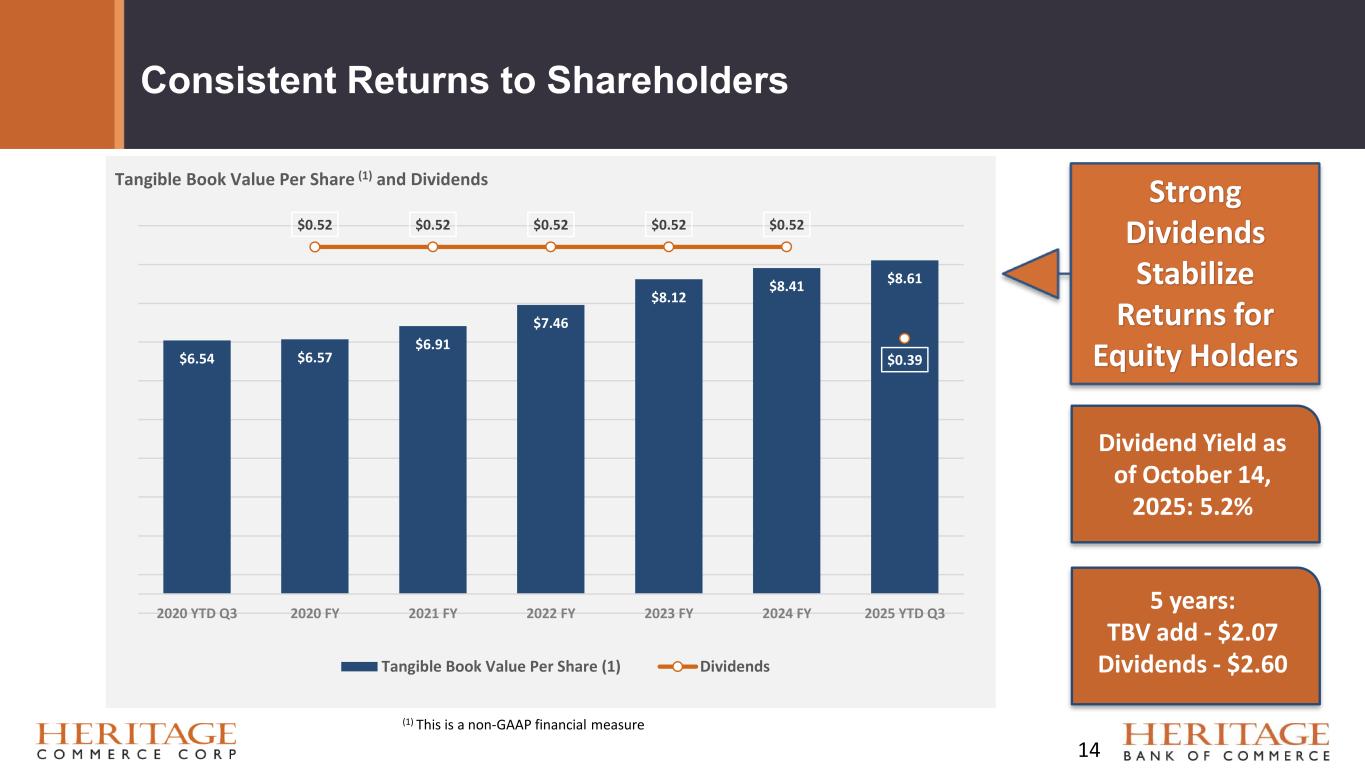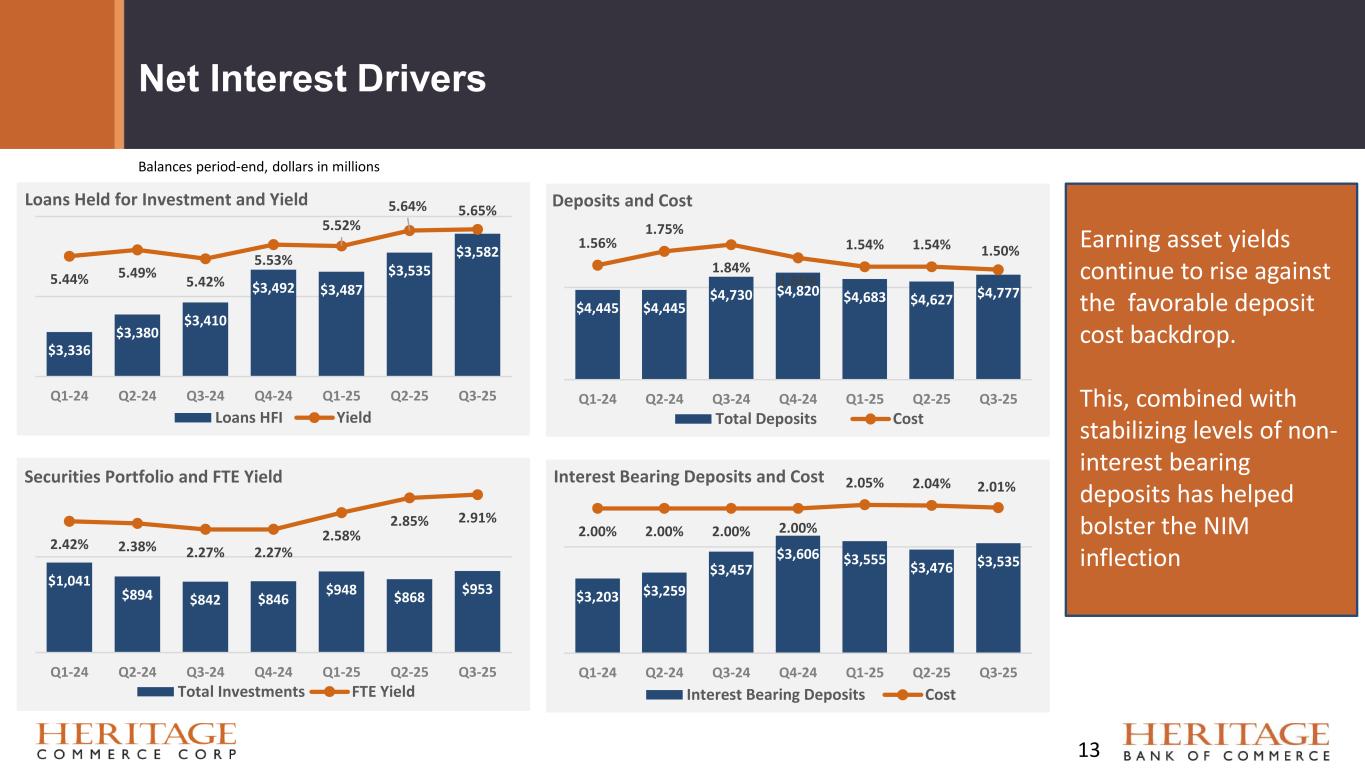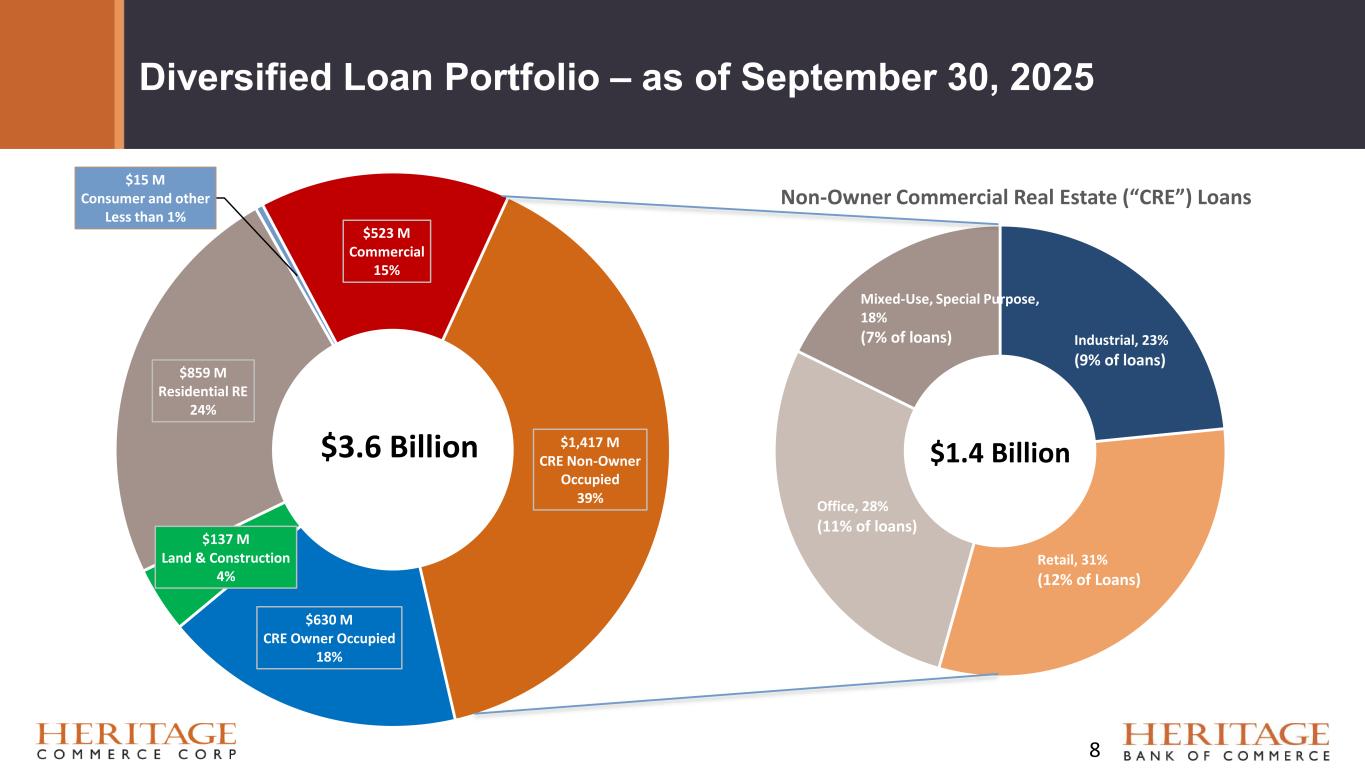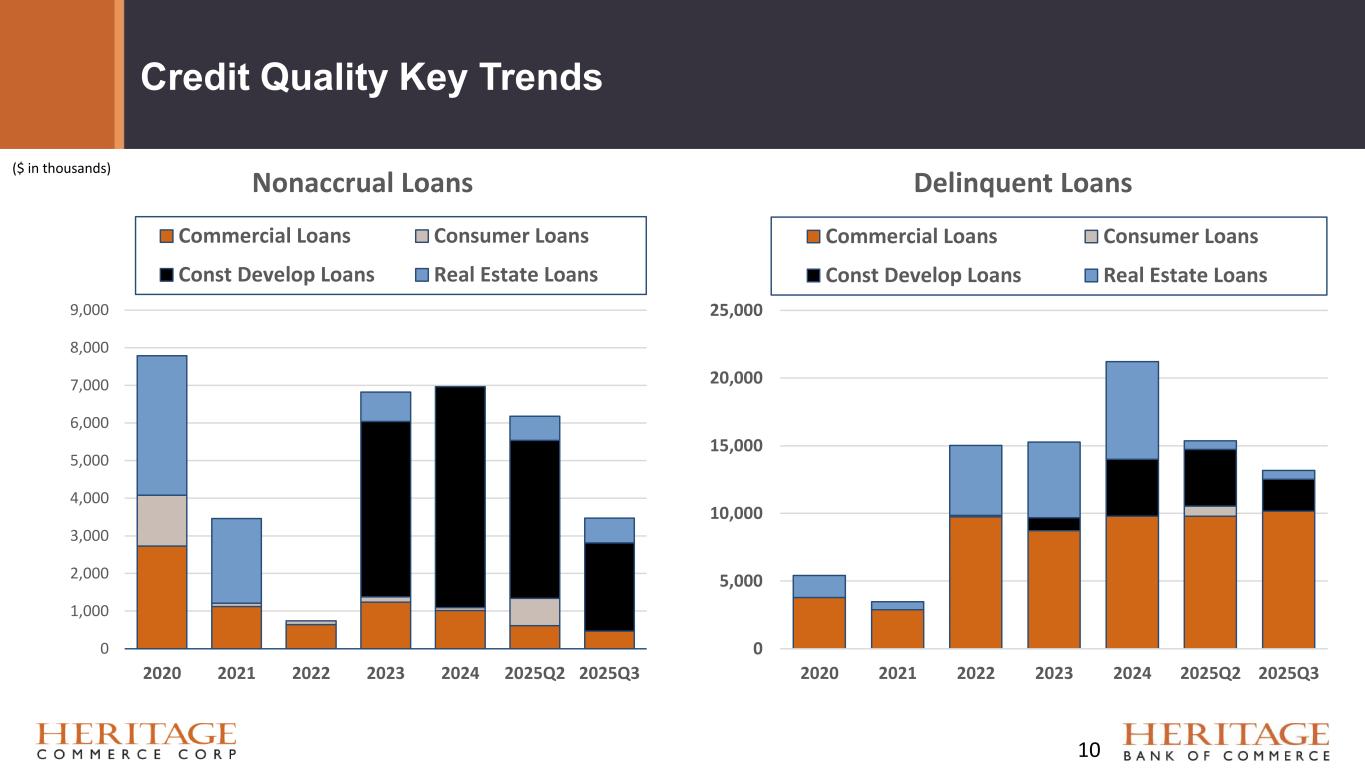 Forward Looking Statement Disclaimer and Basis of Presentation • This presentation contains forward-looking statements within the meaning of the Private Securities Litigation Reform Act of 1995 about Heritage Bank (the "Bank") and its holding company, Heritage Commerce Corp (the "Company"). Forward-looking statements are based on management’s knowledge, assumptions and beliefs as of today and include information concerning the possible or assumed future financial condition, results of operations, business and earnings outlook for the Company and the Bank. These forward-looking statements are subject to risks and uncertainties. For a discussion of risk factors which could cause results to differ, please see the Company’s reports on Forms 10-K and 10-Q as filed with the Securities and Exchange Commission and the Company’s press releases. Readers should not place undue reliance on the forward-looking statements, which reflect management's view only as of the date hereof. The Company undertakes no obligation to publicly revise these forward-looking statements to reflect subsequent events or circumstances. • Financial results are presented in accordance with accounting principles generally accepted in the United States of America (“GAAP”) and prevailing practices in the banking industry. However, certain non-GAAP performance measures and ratios are used by management to evaluate and measure the Company’s performance. These measures include “adjusted” operating metrics that have been adjusted to exclude notable expenses incurred in the second quarter of 2025 as well as other performance measures and ratios adjusted for notable items. Management believes these non-GAAP financial measures enhance comparability between periods and in some instances are common in the banking industry. These non-GAAP financial measures should be supplemental to primary GAAP financial measures and should not be read in isolation or relied upon as a substitute for primary GAAP financial measures. A reconciliation of GAAP to non-GAAP financial measures are also presented in the Company’s third quarter earnings release, which is available on the Company’s website at https://heritagecommercecorp.com. 2