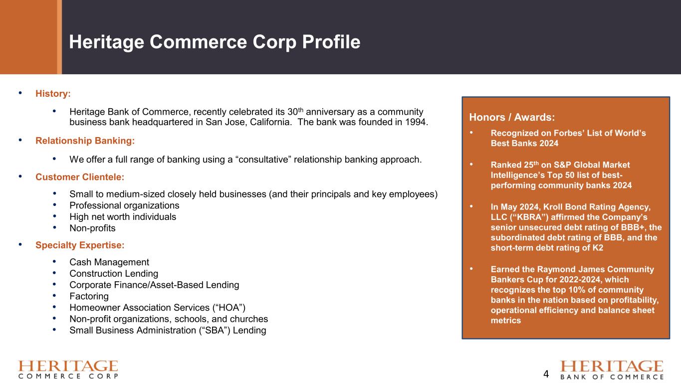 Overview of Heritage Commerce Bank 3 • Northern California’s premier relationship-focused business bank • Offering a wide range of tailored financial solutions including business loans, treasury management and online banking • Specialty businesses focused on HOAs, non-profits, SBA and factoring • Low-cost deposit base, well diversified loan portfolio, strong asset quality, and high levels of capital and liquidity • Strong management team with deep experience from “best-in- class” financial institutions • Well positioned to continue increasing market share, adding clients, and generating profitable growth