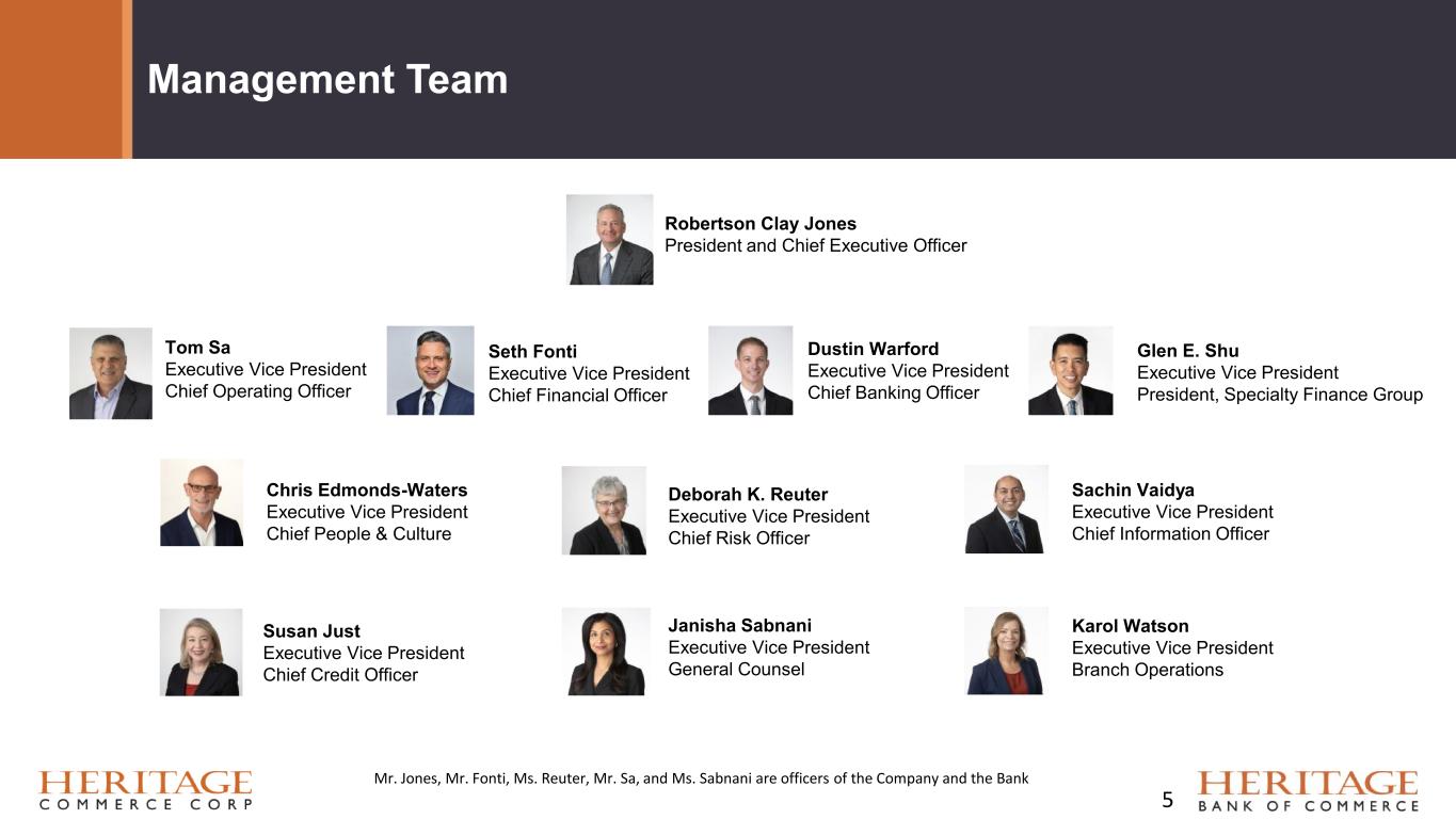 Heritage Commerce Corp Profile • History: • Heritage Bank of Commerce, recently celebrated its 30th anniversary as a community business bank headquartered in San Jose, California. The bank was founded in 1994. • Relationship Banking: • We offer a full range of banking using a “consultative” relationship banking approach. • Customer Clientele: • Small to medium-sized closely held businesses (and their principals and key employees) • Professional organizations • High net worth individuals • Non-profits • Specialty Expertise: • Cash Management • Construction Lending • Corporate Finance/Asset-Based Lending • Factoring • Homeowner Association Services (“HOA”) • Non-profit organizations, schools, and churches • Small Business Administration (“SBA”) Lending Honors / Awards: • Recognized on Forbes’ List of World’s Best Banks 2024 • Ranked 25th on S&P Global Market Intelligence’s Top 50 list of best- performing community banks 2024 • In May 2024, Kroll Bond Rating Agency, LLC (“KBRA”) affirmed the Company’s senior unsecured debt rating of BBB+, the subordinated debt rating of BBB, and the short-term debt rating of K2 • Earned the Raymond James Community Bankers Cup for 2022-2024, which recognizes the top 10% of community banks in the nation based on profitability, operational efficiency and balance sheet metrics 4