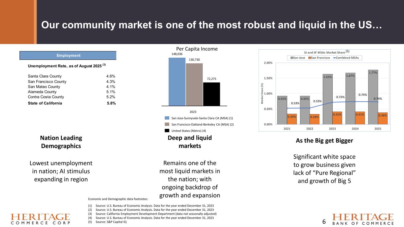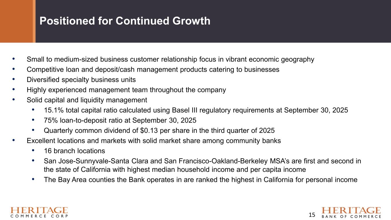 Positioned for Continued Growth • Small to medium-sized business customer relationship focus in vibrant economic geography • Competitive loan and deposit/cash management products catering to businesses • Diversified specialty business units • Highly experienced management team throughout the company • Solid capital and liquidity management • 15.1% total capital ratio calculated using Basel III regulatory requirements at September 30, 2025 • 75% loan-to-deposit ratio at September 30, 2025 • Quarterly common dividend of $0.13 per share in the third quarter of 2025 • Excellent locations and markets with solid market share among community banks • 16 branch locations • San Jose-Sunnyvale-Santa Clara and San Francisco-Oakland-Berkeley MSA’s are first and second in the state of California with highest median household income and per capita income • The Bay Area counties the Bank operates in are ranked the highest in California for personal income 15