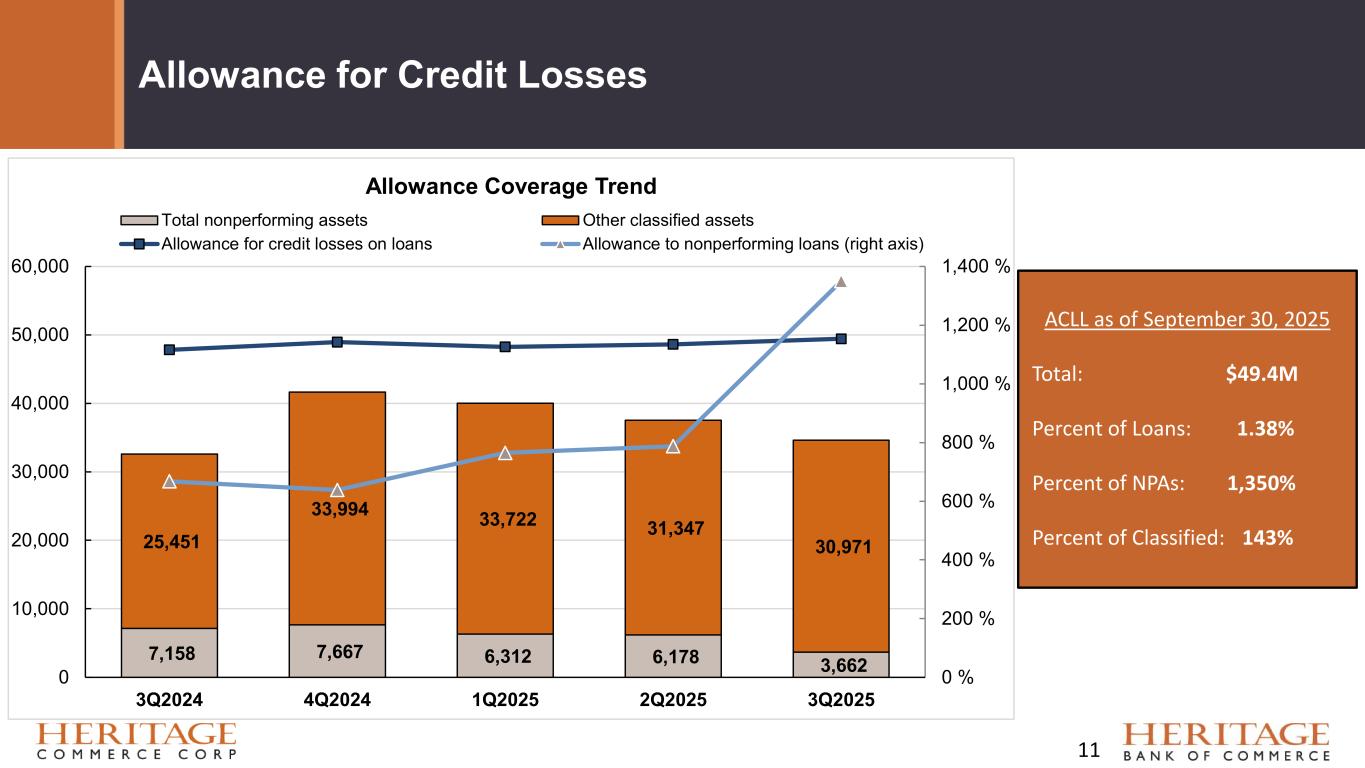 Credit Quality Key Trends ($ in thousands) 10 0 5,000 10,000 15,000 20,000 25,000 2020 2021 2022 2023 2024 2025Q2 2025Q3 Delinquent Loans Commercial Loans Consumer Loans Const Develop Loans Real Estate Loans 0 1,000 2,000 3,000 4,000 5,000 6,000 7,000 8,000 9,000 2020 2021 2022 2023 2024 2025Q2 2025Q3 Nonaccrual Loans Commercial Loans Consumer Loans Const Develop Loans Real Estate Loans