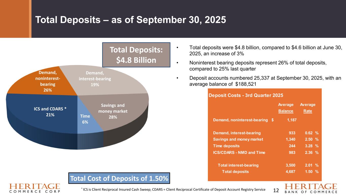 Allowance for Credit Losses ACLL as of September 30, 2025 Total: $49.4M Percent of Loans: 1.38% Percent of NPAs: 1,350% Percent of Classified: 143% 11 7,158 7,667 6,312 6,178 3,662 25,451 33,994 33,722 31,347 30,971 0 % 200 % 400 % 600 % 800 % 1,000 % 1,200 % 1,400 % 0 10,000 20,000 30,000 40,000 50,000 60,000 3Q2024 4Q2024 1Q2025 2Q2025 3Q2025 Allowance Coverage Trend Total nonperforming assets Other classified assets Allowance for credit losses on loans Allowance to nonperforming loans (right axis)