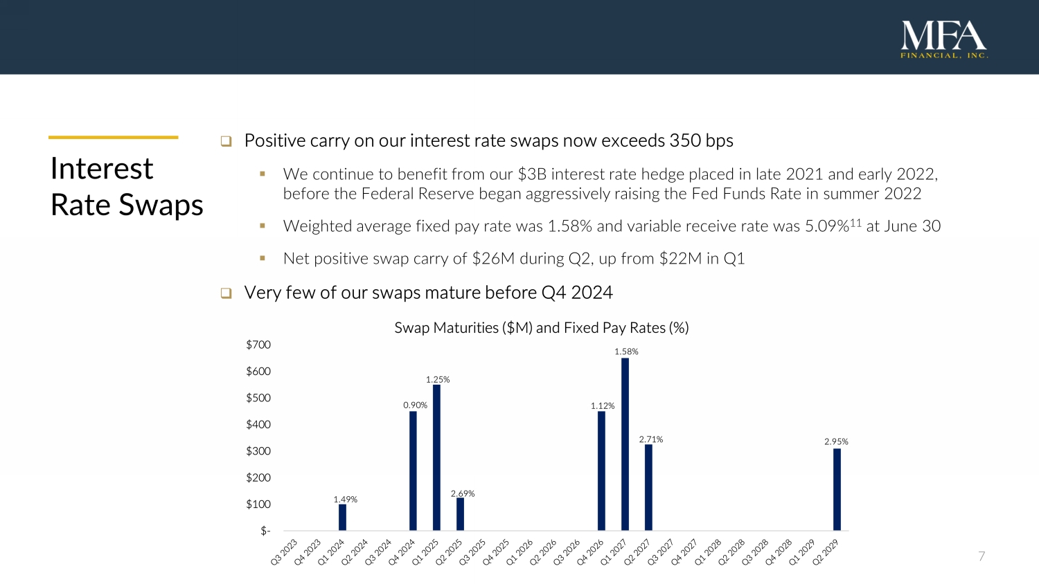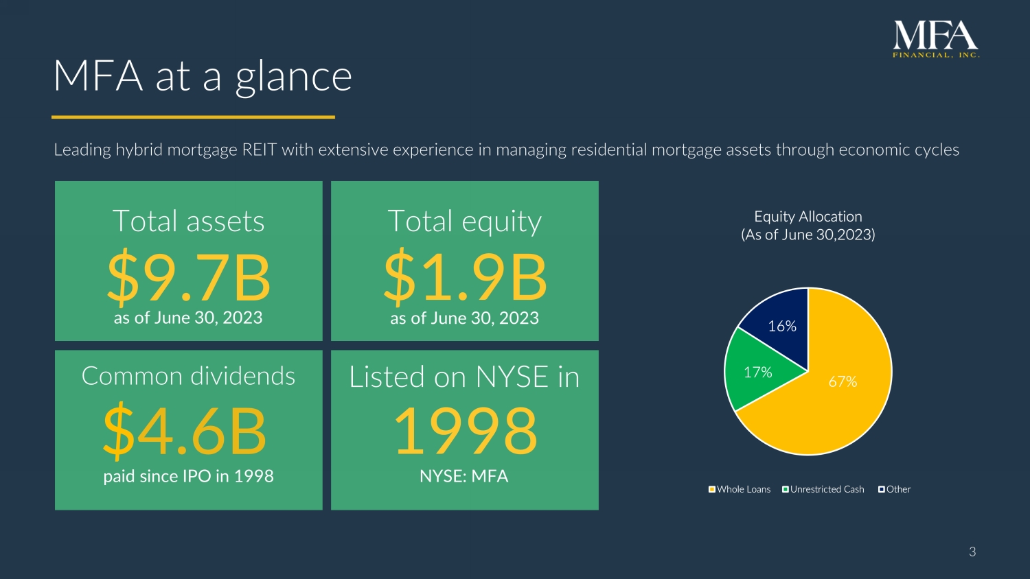 2 Q2 202 2 Financial Snapshot Forward - looking statements When used in this presentation or other written or oral communications, statements that are not historical in nature, including those containing words such as “will,” “believe,” “expect,” “anticipate,” “estimate,” “plan,” “continue,” “intend,” “should,” “could,” “would,” “may,” the negative of these words or similar expressions, are intended to identify “forward - looking statements” within the meaning of Section 27 A of the Securities Act of 1933 , as amended, and Section 21 E of the Securities Exchange Act of 1934 , as amended, and, as such, may involve known and unknown risks, uncertainties and assumptions . These forward - looking statements include information about possible or assumed future results with respect to MFA’s business, financial condition, liquidity, results of operations, plans and objectives . Among the important factors that could cause our actual results to differ materially from those projected in any forward - looking statements that we make are : general economic developments and trends and the performance of the housing, real estate, mortgage finance, broader financial markets ; inflation, increases in interest rates and changes in the market (i . e . , fair) value of MFA’s residential whole loans, MBS, securitized debt and other assets, as well as changes in the value of MFA’s liabilities accounted for at fair value through earnings ; the effectiveness of hedging transactions ; changes in the prepayment rates on residential mortgage assets, an increase of which could result in a reduction of the yield on certain investments in its portfolio and could require MFA to reinvest the proceeds received by it as a result of such prepayments in investments with lower coupons, while a decrease in which could result in an increase in the interest rate duration of certain investments in MFA’s portfolio making their valuation more sensitive to changes in interest rates and could result in lower forecasted cash flows ; credit risks underlying MFA’s assets, including changes in the default rates and management’s assumptions regarding default rates on the mortgage loans in MFA’s residential whole loan portfolio ; MFA’s ability to borrow to finance its assets and the terms, including the cost, maturity and other terms, of any such borrowings ; implementation of or changes in government regulations or programs affecting MFA’s business ; MFA’s estimates regarding taxable income, the actual amount of which is dependent on a number of factors, including, but not limited to, changes in the amount of interest income and financing costs, the method elected by MFA to accrete the market discount on residential whole loans and the extent of prepayments, realized losses and changes in the composition of MFA’s residential whole loan portfolios that may occur during the applicable tax period, including gain or loss on any MBS disposals or whole loan modifications, foreclosures and liquidations ; the timing and amount of distributions to stockholders, which are declared and paid at the discretion of MFA’s Board of Directors and will depend on, among other things, MFA’s taxable income, its financial results and overall financial condition and liquidity, maintenance of its REIT qualification and such other factors as MFA’s Board of Directors deems relevant ; MFA’s ability to maintain its qualification as a REIT for federal income tax purposes ; MFA’s ability to maintain its exemption from registration under the Investment Company Act of 1940 , as amended (or the “Investment Company Act”), including statements regarding the concept release issued by the Securities and Exchange Commission (“SEC”) relating to interpretive issues under the Investment Company Act with respect to the status under the Investment Company Act of certain companies that are engaged in the business of acquiring mortgages and mortgage - related interests ; MFA’s ability to continue growing its residential whole loan portfolio, which is dependent on, among other things, the supply of loans offered for sale in the market ; targeted or expected returns on our investments in recently - originated mortgage loans, the performance of which is, similar to our other mortgage loan investments, subject to, among other things, differences in prepayment risk, credit risk and financing costs associated with such investments ; risks associated with the ongoing operation of Lima One Holdings, LLC (including, without limitation, unanticipated expenditures relating to or liabilities arising from its operation (including, among other things, a failure to realize management’s assumptions regarding expected growth in business purpose loan (BPL) origination volumes and credit risks underlying BPLs, including changes in the default rates and management’s assumptions regarding default rates on the BPLs originated by Lima One) ; expected returns on MFA’s investments in nonperforming residential whole loans (“NPLs”), which are affected by, among other things, the length of time required to foreclose upon, sell, liquidate or otherwise reach a resolution of the property underlying the NPL, home price values, amounts advanced to carry the asset (e . g . , taxes, insurance, maintenance expenses, etc . on the underlying property) and the amount ultimately realized upon resolution of the asset ; risks associated with our investments in MSR - related assets, including servicing, regulatory and economic risks ; risks associated with our investments in loan originators ; risks associated with investing in real estate assets generally, including changes in business conditions and the general economy ; and other risks, uncertainties and factors, including those described in the annual, quarterly and current reports that we file with the SEC . These forward - looking statements are based on beliefs, 
