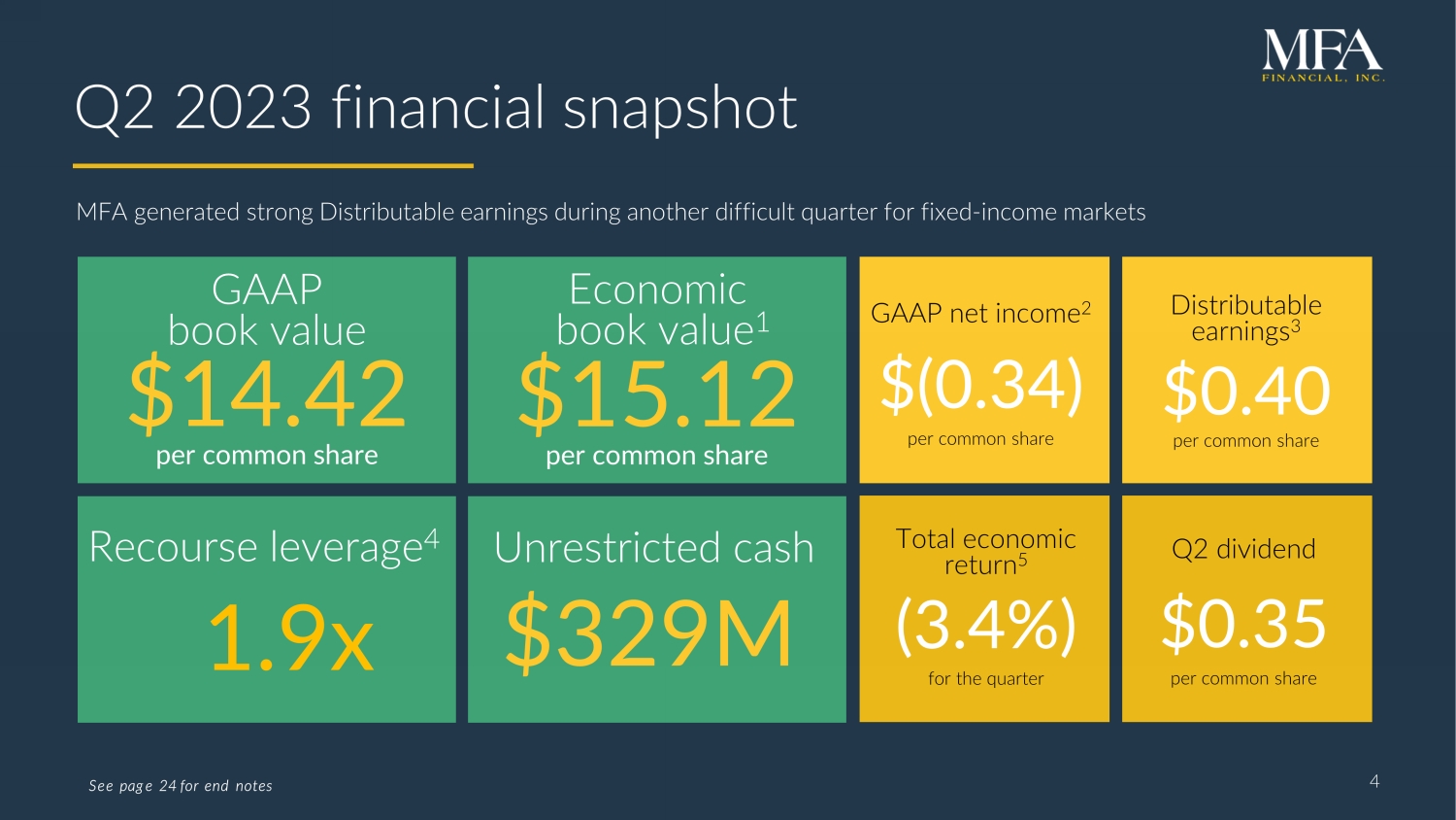 3 MFA at a glance 3 $1.9B Total equity $ 4.6B Common dividends Leading hybrid mortgage REIT with extensive experience in managing residential mortgage assets through economic cycles $9.7B Total assets paid since IPO in 1998 1998 Listed on NYSE in as of June 30, 2023 as of June 30, 2023 NYSE: MFA 67% 17% 16% Equity Allocation (As of June 30,2023) Whole Loans Unrestricted Cash Other
