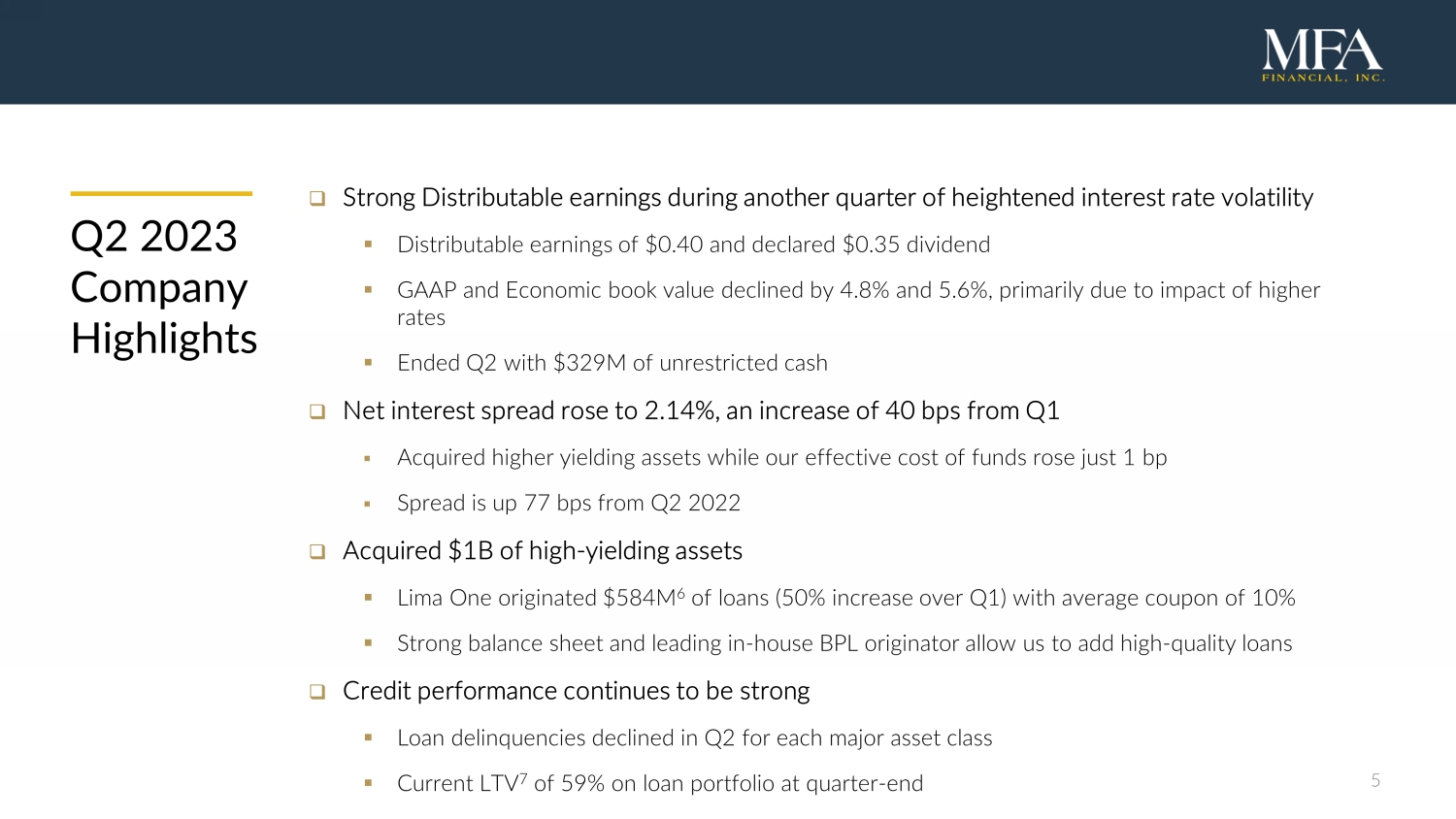 4 Q 2 202 3 financial snapshot MFA generated strong Distributable earnings during another difficult quarter for fixed - income markets $14.42 $15.12 GAAP net income 2 $(0.34) per common share Distributable earnings 3 $0.40 per common share Q2 dividend $0.35 per common share GAAP book value Economic book value 1 per common share per common share $329M Unrestricted cash 1.9x Recourse leverage 4 4 Total economic return 5 (3.4%) for the quarter See page 24 for end notes