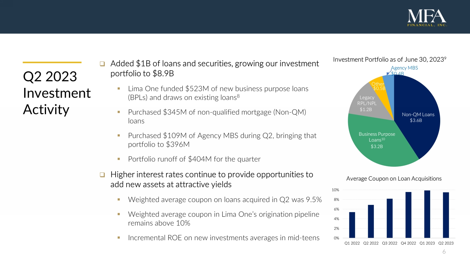 5 Q2 2023 Company Highlights □ Strong Distributable earnings during another quarter of heightened interest rate volatility ▪ Distributable earnings of $0.40 and declared $0.35 dividend ▪ GAAP and Economic book value declined by 4.8% and 5.6%, primarily due to impact of higher rates ▪ Ended Q2 with $329M of unrestricted cash □ Net interest spread rose to 2.14%, an increase of 40 bps from Q1 ▪ Acquired higher yielding assets while our effective cost of funds rose just 1 bp ▪ Spread is up 77 bps from Q2 2022 □ Acquired $1B of high - yielding assets ▪ Lima One originated $584M 6 of loans (50% increase over Q1) with average coupon of 10% ▪ Strong balance sheet and leading in - house BPL originator allow us to add high - quality loans □ Credit performance continues to be strong ▪ Loan delinquencies declined in Q2 for each major asset class ▪ Current LTV 7 of 59% on loan portfolio at quarter - end