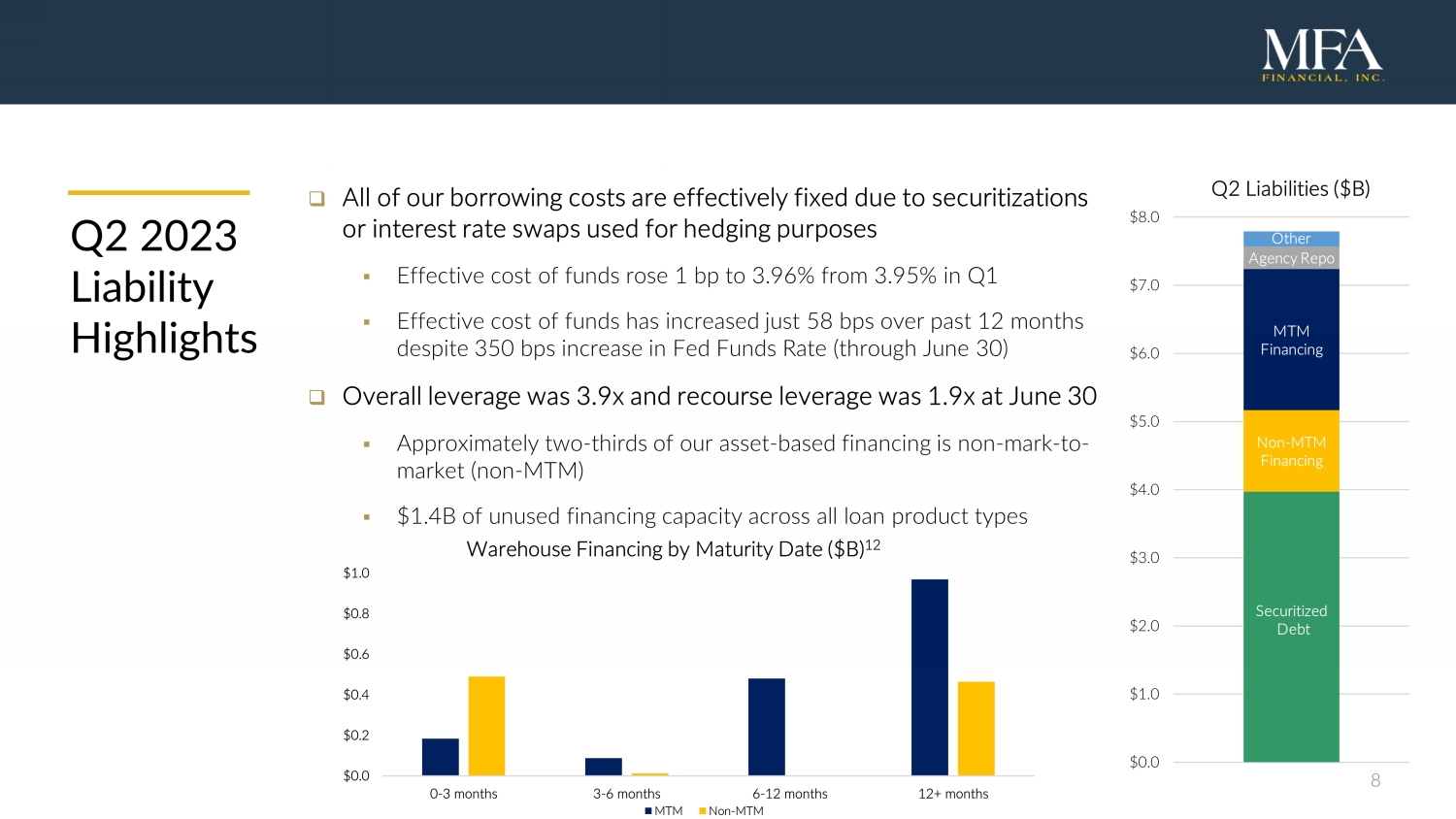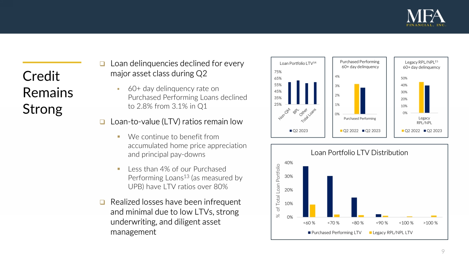 8 Q2 2023 Liability Highlights □ All of our borrowing costs are effectively fixed due to securitizations or interest rate swaps used for hedging purposes ▪ Effective cost of funds rose 1 bp to 3.96% from 3.95% in Q1 ▪ Effective cost of funds has increased just 58 bps over past 12 months despite 350 bps increase in Fed Funds Rate (through June 30) □ Overall leverage was 3.9x and recourse leverage was 1.9x at June 30 ▪ Approximately two - thirds of our asset - based financing is non - mark - to - market (non - MTM) ▪ $1.4B of unused financing capacity across all loan product types Securitized Debt Non - MTM Financing MTM Financing Agency Repo Other $0.0 $1.0 $2.0 $3.0 $4.0 $5.0 $6.0 $7.0 $8.0 Q2 Liabilities ($B) $0.0 $0.2 $0.4 $0.6 $0.8 $1.0 0-3 months 3-6 months 6-12 months 12+ months Warehouse Financing by Maturity Date ($B) 12 MTM Non-MTM