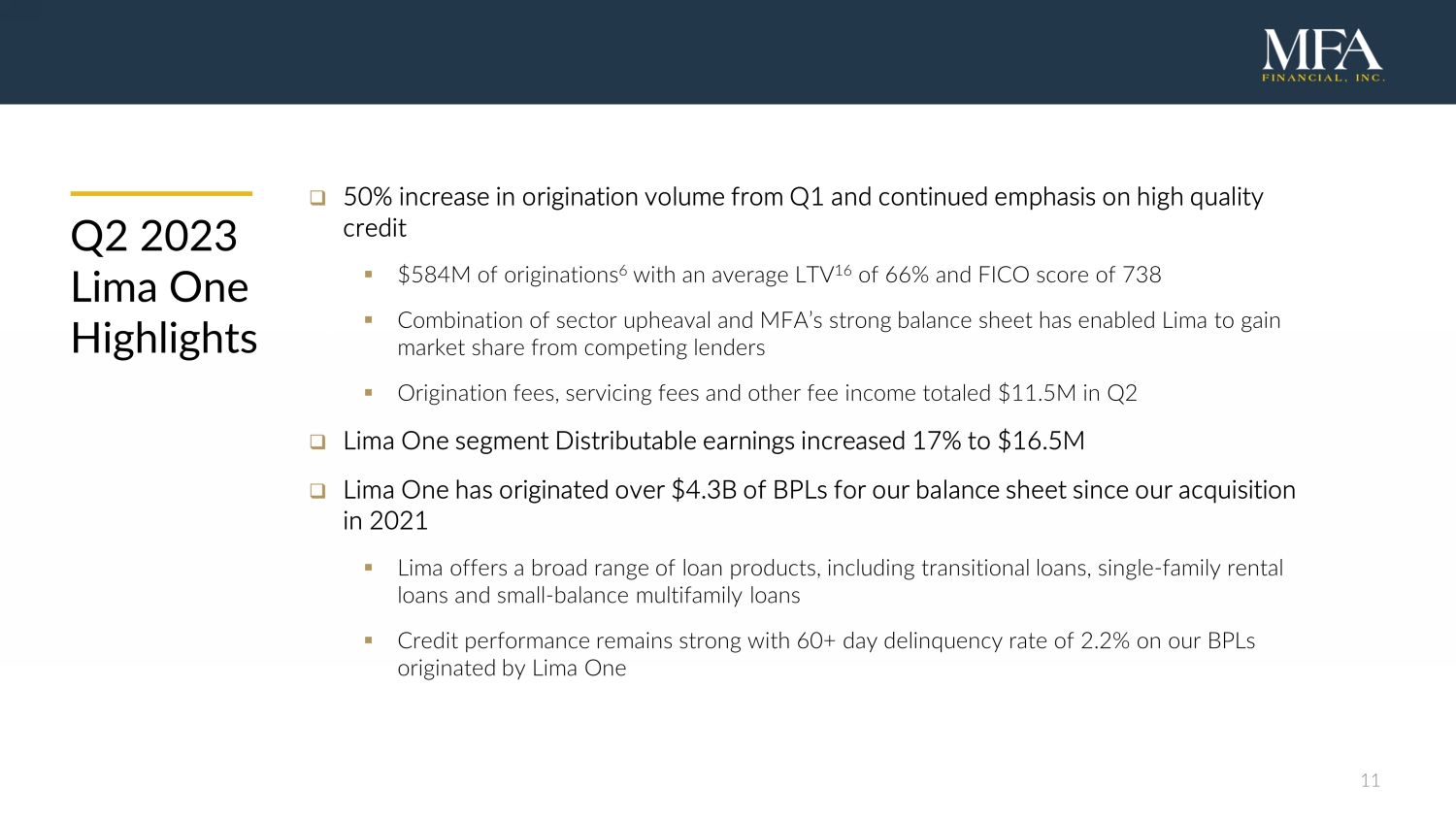 10 Book Value Upside □ Economic book value has over $3.50 per share of potential upside ▪ Our loan portfolio is marked at a substantial discount to par, mostly due to impact of higher interest rates ▪ We recoup these unrealized losses as loans pay off and as borrowers make scheduled principal payments □ Economic book value would be $18.64 per share if our loans and securitized debt are repaid at par ▪ Strong credit fundamentals support potential book value upside $(2.95) $9.92 $3.52 potential upside $6 $8 $10 $12 $14 $16 $18 $20 $22 MFA Stock Price 6/30 EBV 6/30 Loan portfolio discount to par Securitized debt discount to par Potential EBV Potential Upside in Economic Book Value (EBV) $15.12 $6.93 $(3.42) $18.64 $11.24