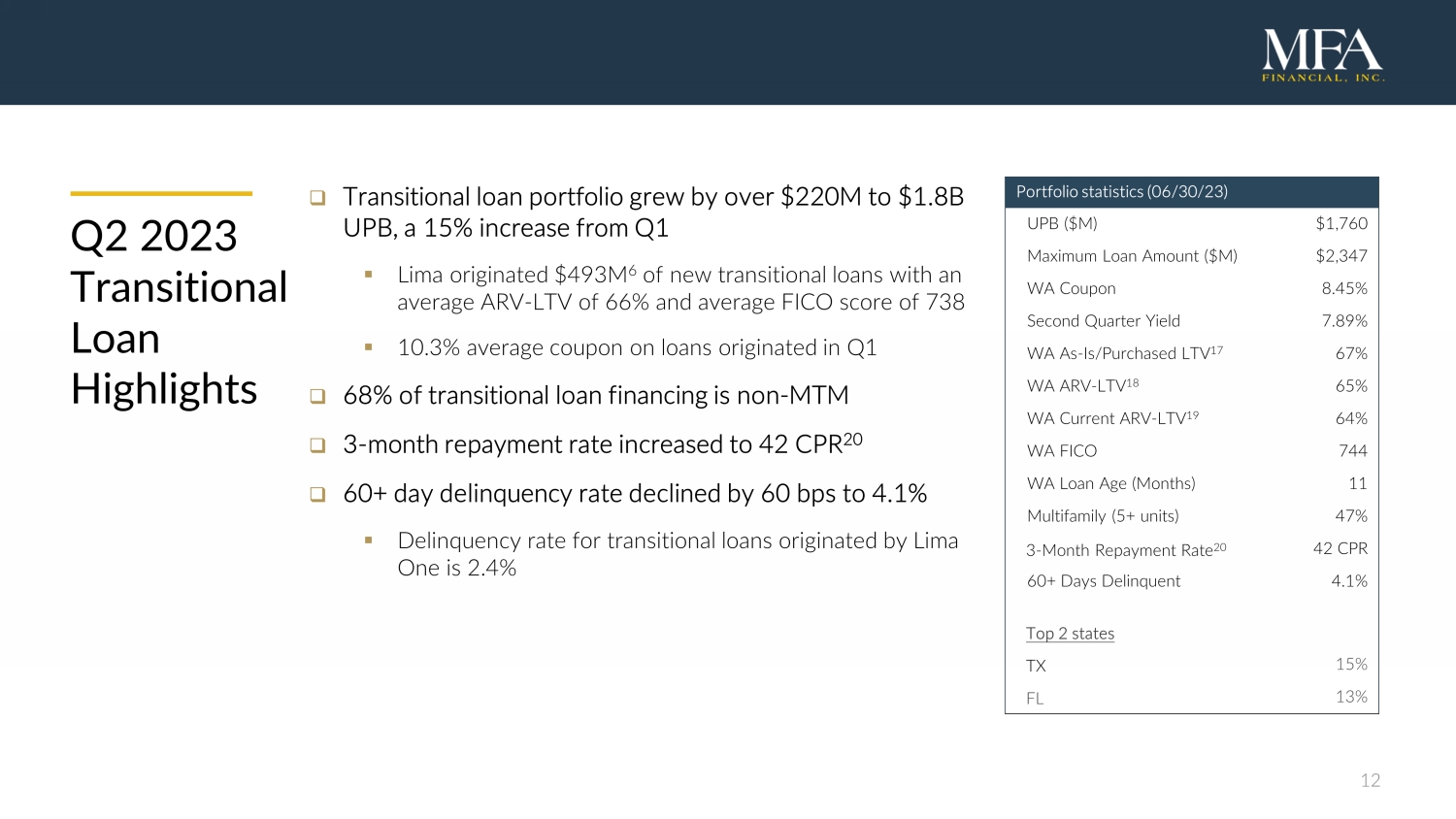 11 □ 50% increase in origination volume from Q1 and continued emphasis on high quality credit ▪ $584M of originations 6 with an average LTV 16 of 66% and FICO score of 738 ▪ Combination of sector upheaval and MFA’s strong balance sheet has enabled Lima to gain market share from competing lenders ▪ Origination fees, servicing fees and other fee income totaled $11.5M in Q2 □ Lima One segment Distributable earnings increased 17% to $16.5M □ Lima One has originated over $4.3B of BPLs for our balance sheet since our acquisition in 2021 ▪ Lima offers a broad range of loan products, including transitional loans, single - family rental loans and small - balance multifamily loans ▪ Credit performance remains strong with 60+ day delinquency rate of 2.2% on our BPLs originated by Lima One Q2 2023 Lima One Highlights