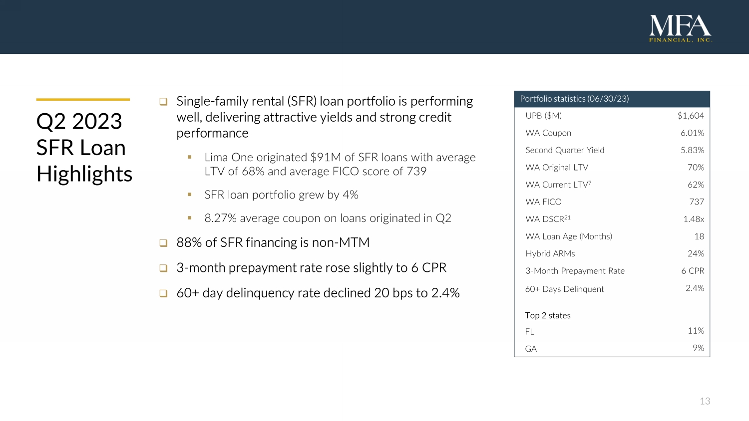 12 Portfolio s tatistics ( 06/30 /2 3 ) UPB ($M) $1,760 Maximum Loan Amount ($M) $2,347 WA Coupon 8.45% Second Quarter Yield 7.89% WA As - Is/Purchased LTV 17 67% WA ARV - LTV 18 65% WA Current ARV - LTV 19 64% WA FICO 744 WA Loan Age (Months) 11 Multifamily (5+ units) 47% 3 - Month Repayment Rate 20 42 CPR 60+ Days Delinquent 4.1 % Top 2 states TX 15% FL 13% Q2 2023 Transitional Loan Highlights □ Transitional loan portfolio grew by over $220M to $1.8B UPB, a 15% increase from Q1 ▪ Lima originated $493M 6 of new transitional loans with an average ARV - LTV of 66% and average FICO score of 738 ▪ 10.3% average coupon on loans originated in Q1 □ 68% of transitional loan financing is non - MTM □ 3 - month repayment rate increased to 42 CPR 20 □ 60+ day delinquency rate declined by 60 bps to 4.1% ▪ Delinquency rate for transitional loans originated by Lima One is 2.4%