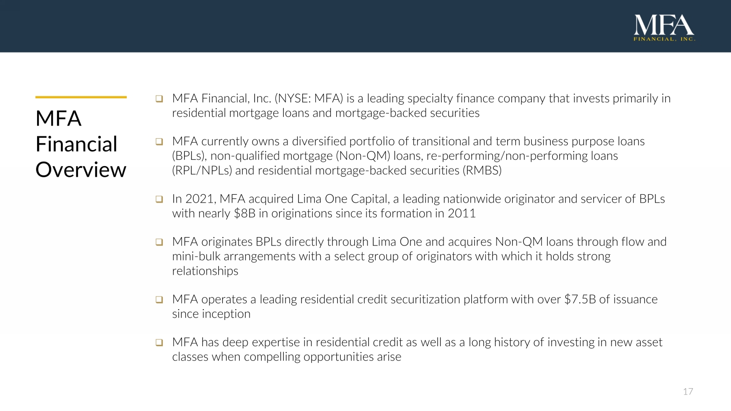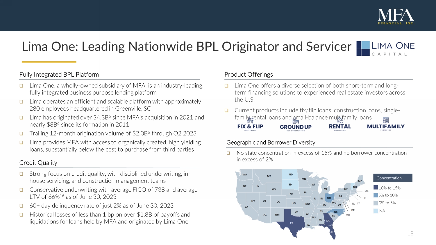 17 MFA Financial Overview □ MFA Financial, Inc. (NYSE: MFA) is a leading specialty finance company that invests primarily in residential mortgage loans and mortgage - backed securities □ MFA currently owns a diversified portfolio of transitional and term business purpose loans (BPLs), non - qualified mortgage (Non - QM) loans, re - performing/non - performing loans (RPL/NPLs) and residential mortgage - backed securities (RMBS) □ In 2021, MFA acquired Lima One Capital, a leading nationwide originator and servicer of BPLs with nearly $8B in originations since its formation in 2011 □ MFA originates BPLs directly through Lima One and acquires Non - QM loans through flow and mini - bulk arrangements with a select group of originators with which it holds strong relationships □ MFA operates a leading residential credit securitization platform with over $7.5B of issuance since inception □ MFA has deep expertise in residential credit as well as a long history of investing in new asset classes when compelling opportunities arise