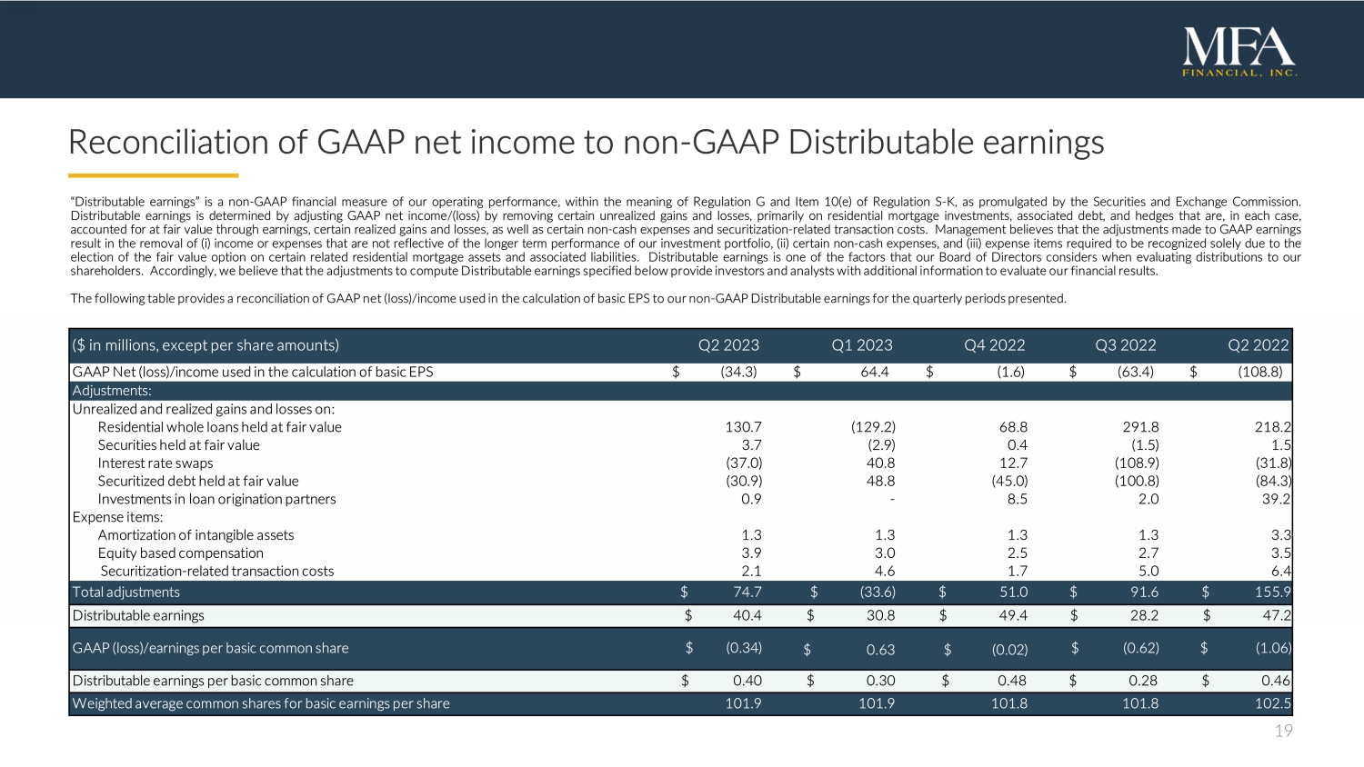 19 Reconciliation of GAAP net income to non - GAAP Distributable earnings “Distributable earnings” is a non - GAAP financial measure of our operating performance, within the meaning of Regulation G and Item 10 (e) of Regulation S - K, as promulgated by the Securities and Exchange Commission . Distributable earnings is determined by adjusting GAAP net income/(loss) by removing certain unrealized gains and losses, primarily on residential mortgage investments, associated debt, and hedges that are, in each case, accounted for at fair value through earnings, certain realized gains and losses, as well as certain non - cash expenses and securitization - related transaction costs . Management believes that the adjustments made to GAAP earnings result in the removal of ( i ) income or expenses that are not reflective of the longer term performance of our investment portfolio, (ii) certain non - cash expenses, and (iii) expense items required to be recognized solely due to the election of the fair value option on certain related residential mortgage assets and associated liabilities . Distributable earnings is one of the factors that our Board of Directors considers when evaluating distributions to our shareholders . Accordingly, we believe that the adjustments to compute Distributable earnings specified below provide investors and analysts with additional information to evaluate our financial results . The following table provides a reconciliation of GAAP net (loss)/income used in the calculation of basic EPS to our non - GAAP Distributable earnings for the quarterly periods presented . ( $ i n m illions, e xcept p er s hare a mounts) Q 2 202 3 Q 1 202 3 Q 4 2022 Q 3 2022 Q2 2022 GAAP Net (loss)/income used in the calculation of basic EPS $ (34.3) $ 64.4 $ (1.6) $ ( 63.4 ) $ (108.8) Adjustments: Unrealized and realized gains and losses on: Residential whole loans held at fair value 130.7 (129.2) 68.8 291.8 218.2 Securities held at fair value 3.7 (2.9) 0.4 ( 1.5 ) 1.5 Interest rate swaps (37.0) 40.8 12.7 ( 108 . 9 ) (31.8) Securitized debt held at fair value (30.9) 48.8 ( 45.0 ) ( 100 . 8 ) (84.3) Investments in loan origination partners 0.9 - 8.5 2.0 39.2 Expense items: Amortization of intangible assets 1.3 1.3 1.3 1.3 3.3 Equity based compensation 3.9 3.0 2.5 2.7 3.5 Securitization - related transaction costs 2.1 4.6 1.7 5.0 6.4 Total adjustments $ 74.7 $ (33.6) $ 51.0 $ 91.6 $ 155.9 Distributable earnings $ 40.4 $ 30.8 $ 49.4 $ 28.2 $ 47.2 GAAP (loss)/earnings per basic common share $ (0.34) $ 0.63 $ (0.02) $ ( 0 . 62 ) $ (1.06) Distributable earnings per basic common share $ 0.40 $ 0.30 $ 0.48 $ 0.28 $ 0.46 Weighted average common shares for basic earnings per share 10 1 . 9 10 1 . 9 10 1 . 8 10 1 . 8 102.5