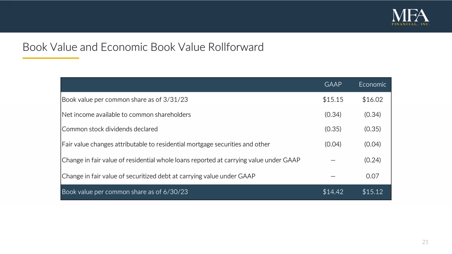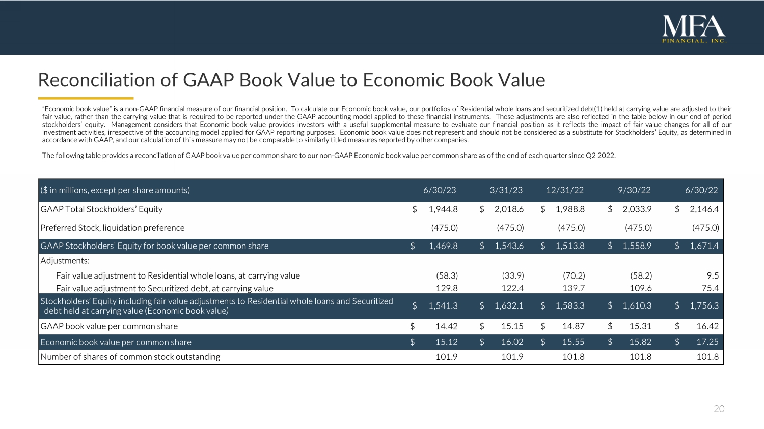 20 Reconciliation of GAAP Book Value to Economic Book Value “Economic book value” is a non - GAAP financial measure of our financial position . To calculate our Economic book value, our portfolios of Residential whole loans and securitized debt( 1 ) held at carrying value are adjusted to their fair value, rather than the carrying value that is required to be reported under the GAAP accounting model applied to these financial instruments . These adjustments are also reflected in the table below in our end of period stockholders’ equity . Management considers that Economic book value provides investors with a useful supplemental measure to evaluate our financial position as it reflects the impact of fair value changes for all of our investment activities, irrespective of the accounting model applied for GAAP reporting purposes . Economic book value does not represent and should not be considered as a substitute for Stockholders’ Equity, as determined in accordance with GAAP, and our calculation of this measure may not be comparable to similarly titled measures reported by other companies . The following table provides a reconciliation of GAAP book value per common share to our non - GAAP Economic book value per common share as of the end of each quarter since Q 2 2022 . ($ i n millions, except per share amounts) 6/30 /2 3 3 /3 1 /2 3 12 /3 1 /22 9 /30/22 6/30/22 GAAP Total Stockholders’ Equity $ 1,944.8 $ 2,018.6 $ 1,988.8 $ 2,033.9 $ 2,146.4 Preferred Stock, liquidation preference (475.0) (475.0 ) (475.0 ) (475.0 ) (475.0 ) GAAP Stockholders’ Equity for book value per common share $ 1,469.8 $ 1, 543.6 $ 1, 513.8 $ 1, 558 . 9 $ 1,671.4 Adjustments: Fair value adjustment to Residential whole loans, at carrying value (58.3) (33.9) (70.2) (58.2) 9.5 Fair value adjustment to Securitized debt, at carrying value 129.8 122.4 139.7 109.6 75.4 Stockholders’ Equity including fair value adjustments to Residential whole loans and Securitized debt held at carrying value (Economic book value ) $ 1,541.3 $ 1,632.1 $ 1,583.3 $ 1,610.3 $ 1,756.3 GAAP book value per common share $ 14.42 $ 15.15 $ 14.87 $ 15.31 $ 16.42 Economic book value per common share $ 15.12 $ 16.02 $ 15.55 $ 15.82 $ 17.25 Number of shares of common stock outstanding 101.9 101. 9 101.8 101.8 101.8