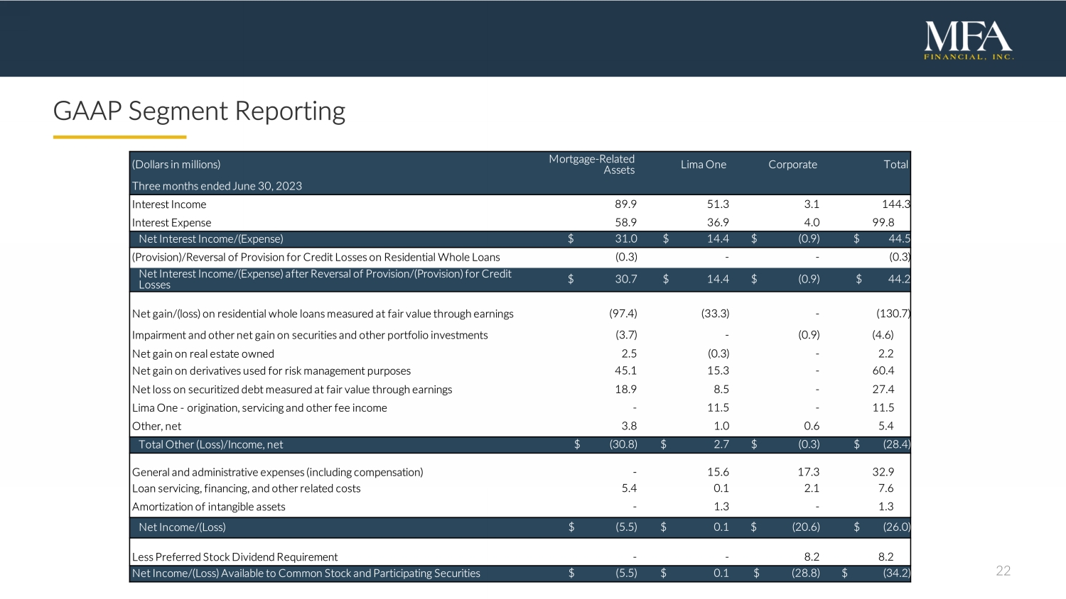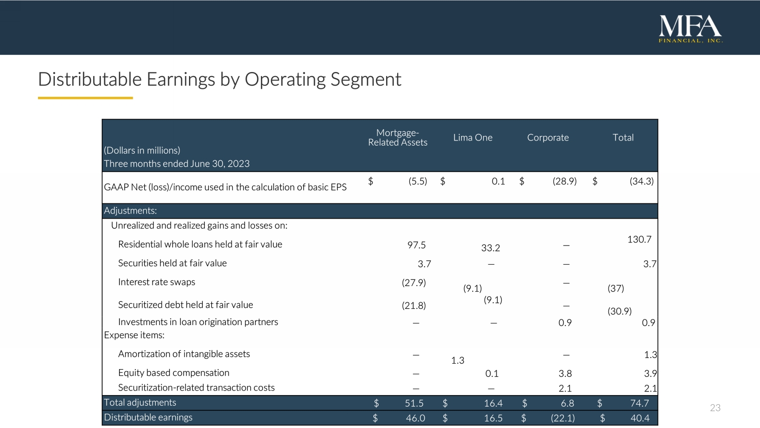 22 GAAP Segment Reporting (Dollars in m illions) Mortgage - Related Assets Lima One Corporate Total Three months ended June 30, 2023 Interest Income 89.9 51.3 3.1 144.3 Interest Expense 58.9 36.9 4.0 99.8 Net Interest Income /(Expense) $ 31.0 $ 14.4 $ (0.9) $ 44.5 (Provision)/Reversal of Provision for Credit Losses on Residential Whole Loans (0.3) - - (0.3) Net Interest Income /(Expense) after Reversal of Provision/( Provision ) for Credit Losses $ 30.7 $ 14.4 $ (0.9) $ 44.2 Net gain/(loss) on residential whole loans measured at fair value through earnings (97.4) (33.3) - (130.7) Impairment and other net gain on securities and other portfolio investments (3.7) - (0.9) (4.6) Net gain on real estate owned 2.5 (0.3) - 2.2 Net gain on derivatives used for risk management purposes 45.1 15.3 - 60.4 Net loss on securitized debt measured at fair value through earnings 18.9 8.5 - 27.4 Lima One - origination, servicing and other fee income - 11.5 - 11.5 Other, net 3.8 1.0 0.6 5.4 Total Other ( Loss )/Income , net $ (30.8) $ 2.7 $ (0.3) $ (28.4) General and administrative expenses (including compensation) - 15.6 17.3 32.9 Loan servicing, financing, and other related costs 5.4 0.1 2.1 7.6 Amortization of intangible assets - 1.3 - 1.3 Net Income/( Loss ) $ (5.5) $ 0.1 $ (20.6) $ (26.0) Less Preferred Stock Dividend Requirement - - 8.2 8.2 Net Income/( Loss ) Available to Common Stock and Participating Securities $ (5.5) $ 0.1 $ (28.8) $ (34.2)