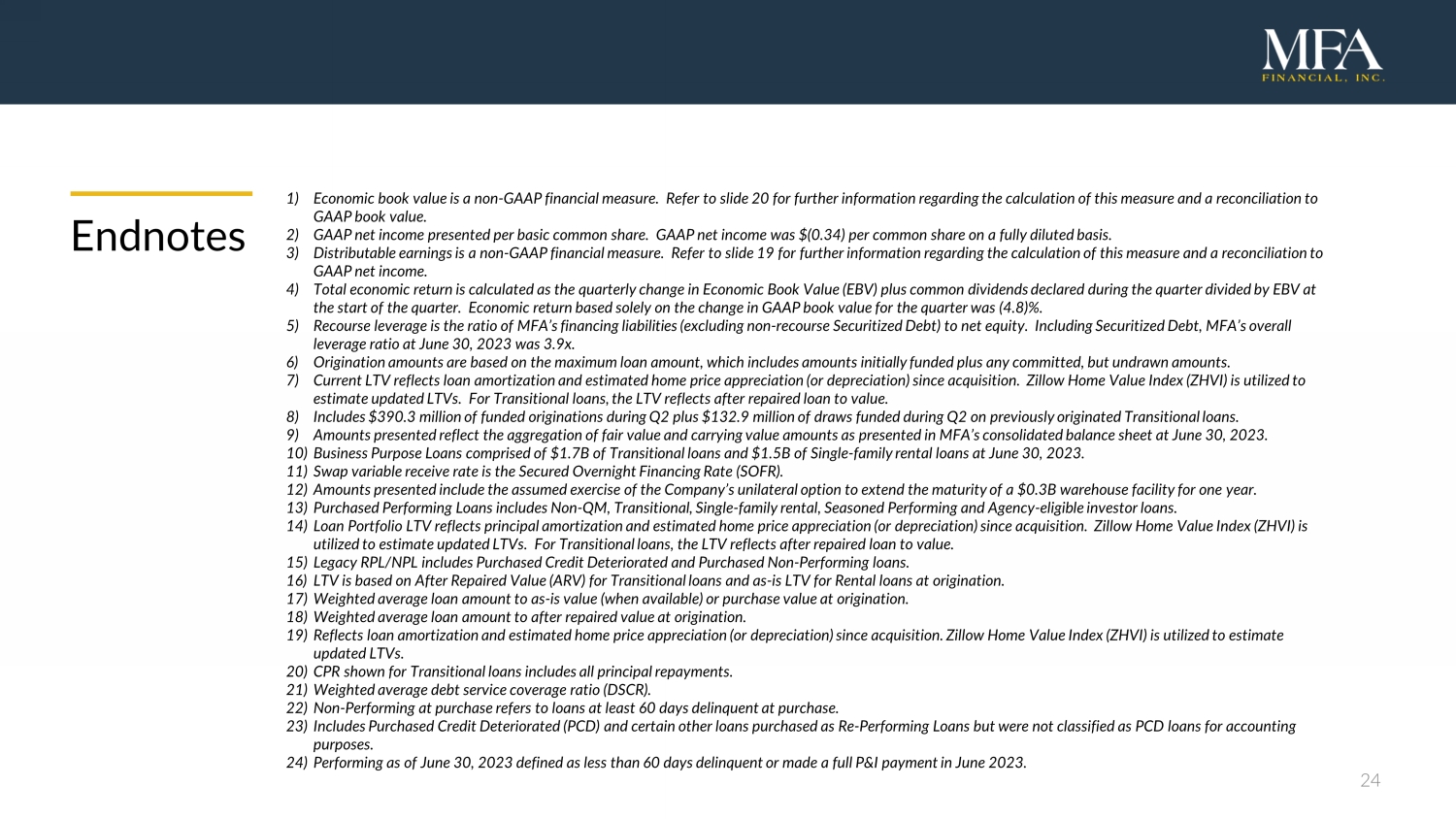 24 Endnotes 1) Economic book value is a non - GAAP financial measure. Refer to slide 20 for further information regarding the calculation of this measure and a reco nciliation to GAAP book value. 2) GAAP net income presented per basic common share. GAAP net income was $(0.34) per common share on a fully diluted basis. 3) Distributable earnings is a non - GAAP financial measure. Refer to slide 19 for further information regarding the calculation of this measure and a reconciliation to GAAP net income. 4) Total economic return is calculated as the quarterly change in Economic Book Value (EBV) plus common dividends declared durin g t he quarter divided by EBV at the start of the quarter. Economic return based solely on the change in GAAP book value for the quarter was (4.8)%. 5) Recourse leverage is the ratio of MFA’s financing liabilities (excluding non - recourse Securitized Debt) to net equity. Includin g Securitized Debt, MFA’s overall leverage ratio at June 30, 2023 was 3.9x. 6) Origination amounts are based on the maximum loan amount, which includes amounts initially funded plus any committed, but und raw n amounts. 7) Current LTV reflects loan amortization and estimated home price appreciation (or depreciation) since acquisition. Zillow Hom e V alue Index (ZHVI) is utilized to estimate updated LTVs. For Transitional loans, the LTV reflects after repaired loan to value. 8) Includes $390.3 million of funded originations during Q2 plus $132.9 million of draws funded during Q2 on previously originat ed Transitional loans. 9) Amounts presented reflect the aggregation of fair value and carrying value amounts as presented in MFA’s consolidated balance sh eet at June 30, 2023. 10) Business Purpose Loans comprised of $1.7B of Transitional loans and $1.5B of Single - family rental loans at June 30, 2023. 11) Swap variable receive rate is the Secured Overnight Financing Rate (SOFR). 12) Amounts presented include the assumed exercise of the Company’s unilateral option to extend the maturity of a $0.3B warehouse fa cility for one year. 13) Purchased Performing Loans includes Non - QM, Transitional, Single - family rental, Seasoned Performing and Agency - eligible investor loans. 14) Loan Portfolio LTV reflects principal amortization and estimated home price appreciation (or depreciation) since acquisition. Z illow Home Value Index (ZHVI) is utilized to estimate updated LTVs. For Transitional loans, the LTV reflects after repaired loan to value. 15) Legacy RPL/NPL includes Purchased Credit Deteriorated and Purchased Non - Performing loans. 16) LTV is based on After Repaired Value (ARV) for Transitional loans and as - is LTV for Rental loans at origination. 17) Weighted average loan amount to as - is value (when available) or purchase value at origination. 18) Weighted average loan amount to after repaired value at origination. 19) Reflects loan amortization and estimated home price appreciation (or depreciation) since acquisition. Zillow Home Value Index (Z HVI) is utilized to estimate updated LTVs. 20) CPR shown for Transitional loans includes all principal repayments. 21) Weighted average debt service coverage ratio (DSCR). 22) Non - Performing at purchase refers to loans at least 60 days delinquent at purchase. 23) Includes Purchased Credit Deteriorated (PCD) and certain other loans purchased as Re - Performing Loans but were not classified as PCD loans for accounting purposes. 24) Performing as of June 30, 2023 defined as less than 60 days delinquent or made a full P&I payment in June 2023.