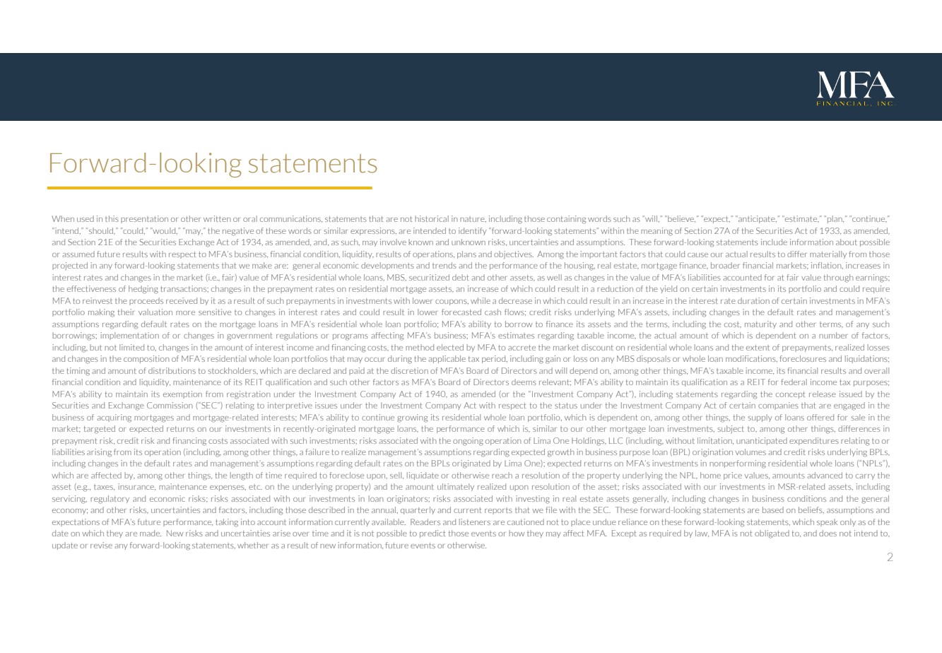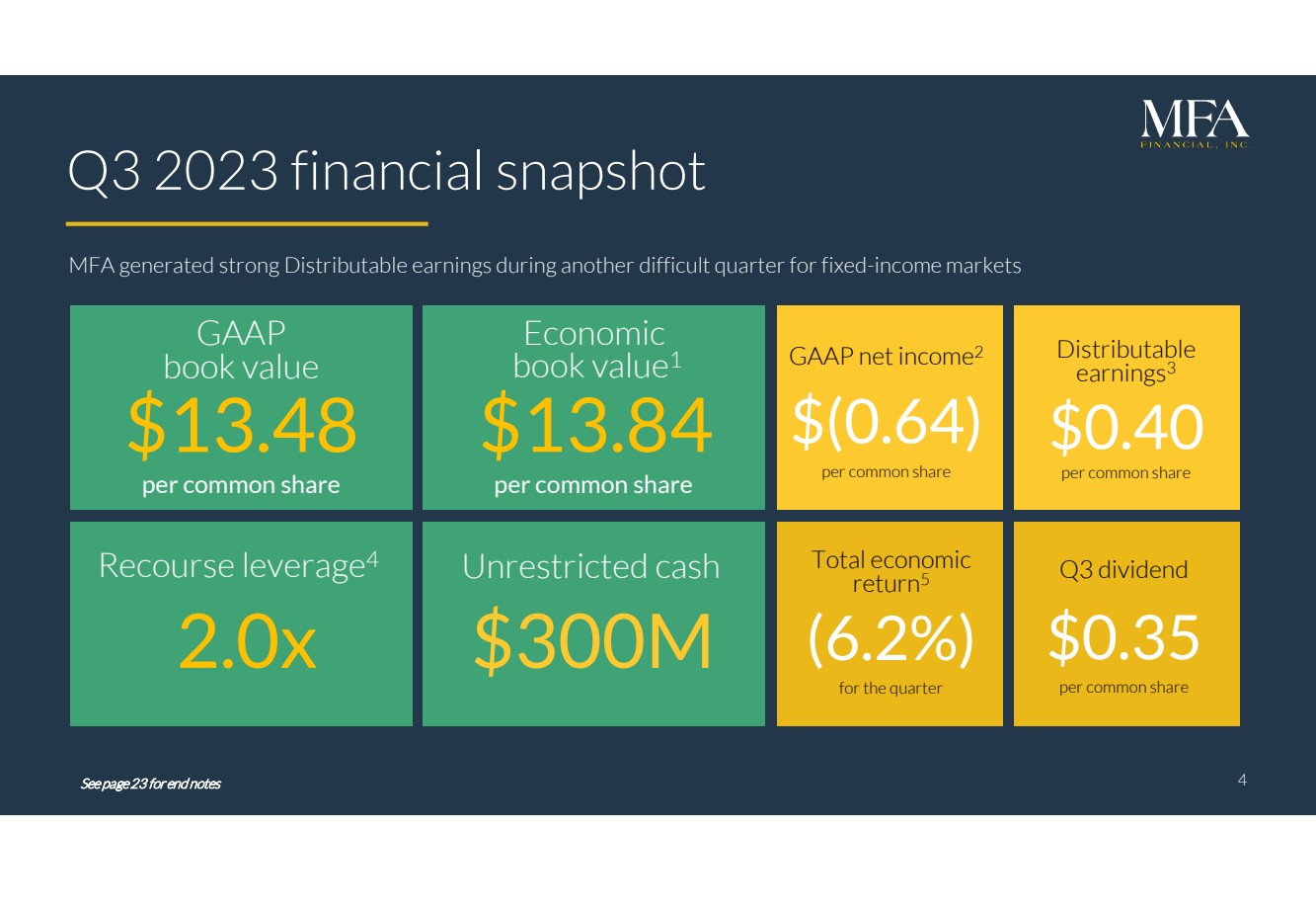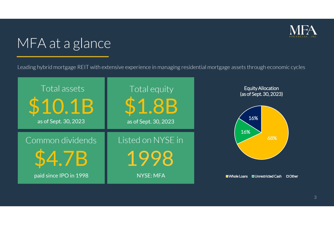 2 Q3 202 2 Financial Snapshot Forward - looking statements When used in this presentation or other written or oral communications, statements that are not historical in nature, including those containing words such as “will,” “believe,” “expect,” “anticipate,” “estimate,” “plan,” “continue,” “intend,” “should,” “could,” “would,” “may,” the negative of these words or similar expressions, are intended to identify “forward - looking statements” within the meaning of Section 27 A of the Securities Act of 1933 , as amended, and Section 21 E of the Securities Exchange Act of 1934 , as amended, and, as such, may involve known and unknown risks, uncertainties and assumptions . These forward - looking statements include information about possible or assumed future results with respect to MFA’s business, financial condition, liquidity, results of operations, plans and objectives . Among the important factors that could cause our actual results to differ materially from those projected in any forward - looking statements that we make are : general economic developments and trends and the performance of the housing, real estate, mortgage finance, broader financial markets ; inflation, increases in interest rates and changes in the market (i . e . , fair) value of MFA’s residential whole loans, MBS, securitized debt and other assets, as well as changes in the value of MFA’s liabilities accounted for at fair value through earnings ; the effectiveness of hedging transactions ; changes in the prepayment rates on residential mortgage assets, an increase of which could result in a reduction of the yield on certain investments in its portfolio and could require MFA to reinvest the proceeds received by it as a result of such prepayments in investments with lower coupons, while a decrease in which could result in an increase in the interest rate duration of certain investments in MFA’s portfolio making their valuation more sensitive to changes in interest rates and could result in lower forecasted cash flows ; credit risks underlying MFA’s assets, including changes in the default rates and management’s assumptions regarding default rates on the mortgage loans in MFA’s residential whole loan portfolio ; MFA’s ability to borrow to finance its assets and the terms, including the cost, maturity and other terms, of any such borrowings ; implementation of or changes in government regulations or programs affecting MFA’s business ; MFA’s estimates regarding taxable income, the actual amount of which is dependent on a number of factors, including, but not limited to, changes in the amount of interest income and financing costs, the method elected by MFA to accrete the market discount on residential whole loans and the extent of prepayments, realized losses and changes in the composition of MFA’s residential whole loan portfolios that may occur during the applicable tax period, including gain or loss on any MBS disposals or whole loan modifications, foreclosures and liquidations ; the timing and amount of distributions to stockholders, which are declared and paid at the discretion of MFA’s Board of Directors and will depend on, among other things, MFA’s taxable income, its financial results and overall financial condition and liquidity, maintenance of its REIT qualification and such other factors as MFA’s Board of Directors deems relevant ; MFA’s ability to maintain its qualification as a REIT for federal income tax purposes ; MFA’s ability to maintain its exemption from registration under the Investment Company Act of 1940 , as amended (or the “Investment Company Act”), including statements regarding the concept release issued by the Securities and Exchange Commission (“SEC”) relating to interpretive issues under the Investment Company Act with respect to the status under the Investment Company Act of certain companies that are engaged in the business of acquiring mortgages and mortgage - related interests ; MFA’s ability to continue growing its residential whole loan portfolio, which is dependent on, among other things, the supply of loans offered for sale in the market ; targeted or expected returns on our investments in recently - originated mortgage loans, the performance of which is, similar to our other mortgage loan investments, subject to, among other things, differences in prepayment risk, credit risk and financing costs associated with such investments ; risks associated with the ongoing operation of Lima One Holdings, LLC (including, without limitation, unanticipated expenditures relating to or liabilities arising from its operation (including, among other things, a failure to realize management’s assumptions regarding expected growth in business purpose loan (BPL) origination volumes and credit risks underlying BPLs, including changes in the default rates and management’s assumptions regarding default rates on the BPLs originated by Lima One) ; expected returns on MFA’s investments in nonperforming residential whole loans (“NPLs”), which are affected by, among other things, the length of time required to foreclose upon, sell, liquidate or otherwise reach a resolution of the property underlying the NPL, home price values, amounts advanced to carry the asset (e . g . , taxes, insurance, maintenance expenses, etc . on the underlying property) and the amount ultimately realized upon resolution of the asset ; risks associated with our investments in MSR - related assets, including servicing, regulatory and economic risks ; risks associated with our investments in loan originators ; risks associated with investing in real estate assets generally, including changes in business conditions and the general economy ; and other risks, uncertainties and factors, including those described in the annual, quarterly and current reports that we file with the SEC . These forward - looking statements are based on beliefs, 