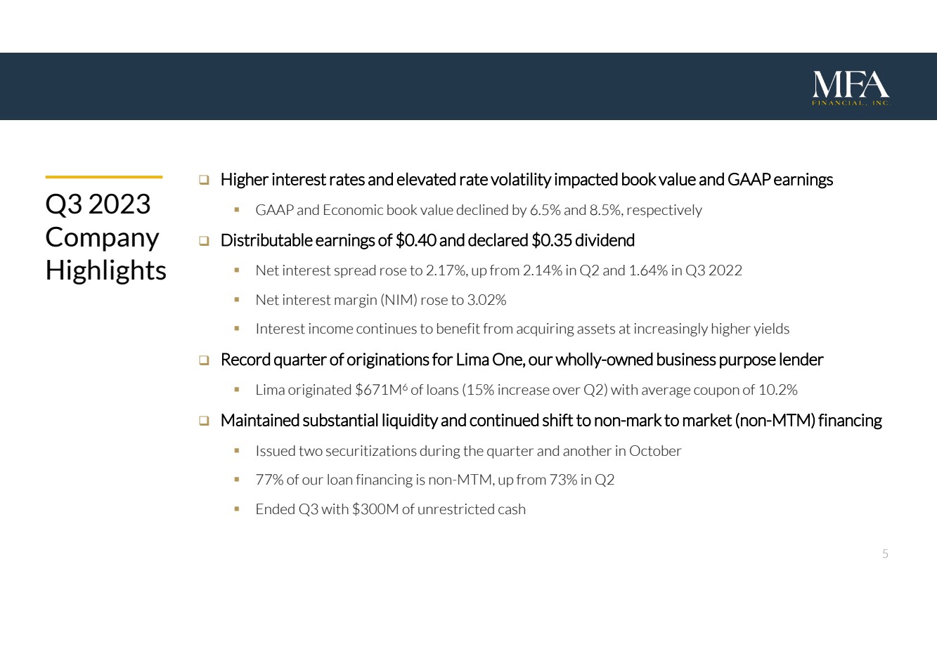 4 Q 3 202 3 financial snapshot MFA generated strong Distributable earnings during another difficult quarter for fixed - income markets $13.48 $13.84 GAAP net income 2 $(0.64) per common share Distributable earnings 3 $0.40 per common share Q3 dividend $0.35 per common share GAAP book value Economic book value 1 per common share per common share $300M Unrestricted cash 2.0x Recourse leverage 4 4 Total economic return 5 (6.2%) for the quarter See page 23 for end notes