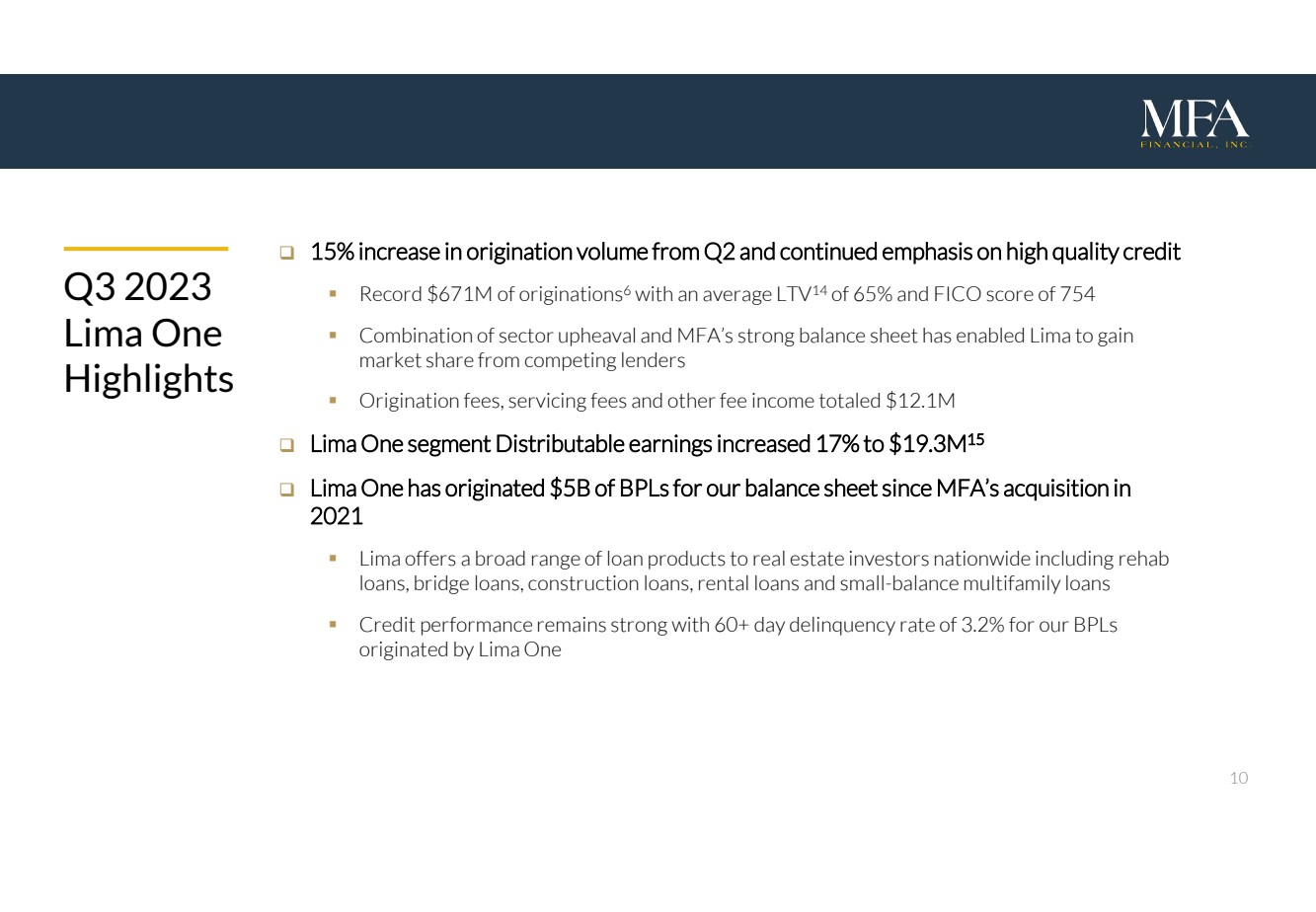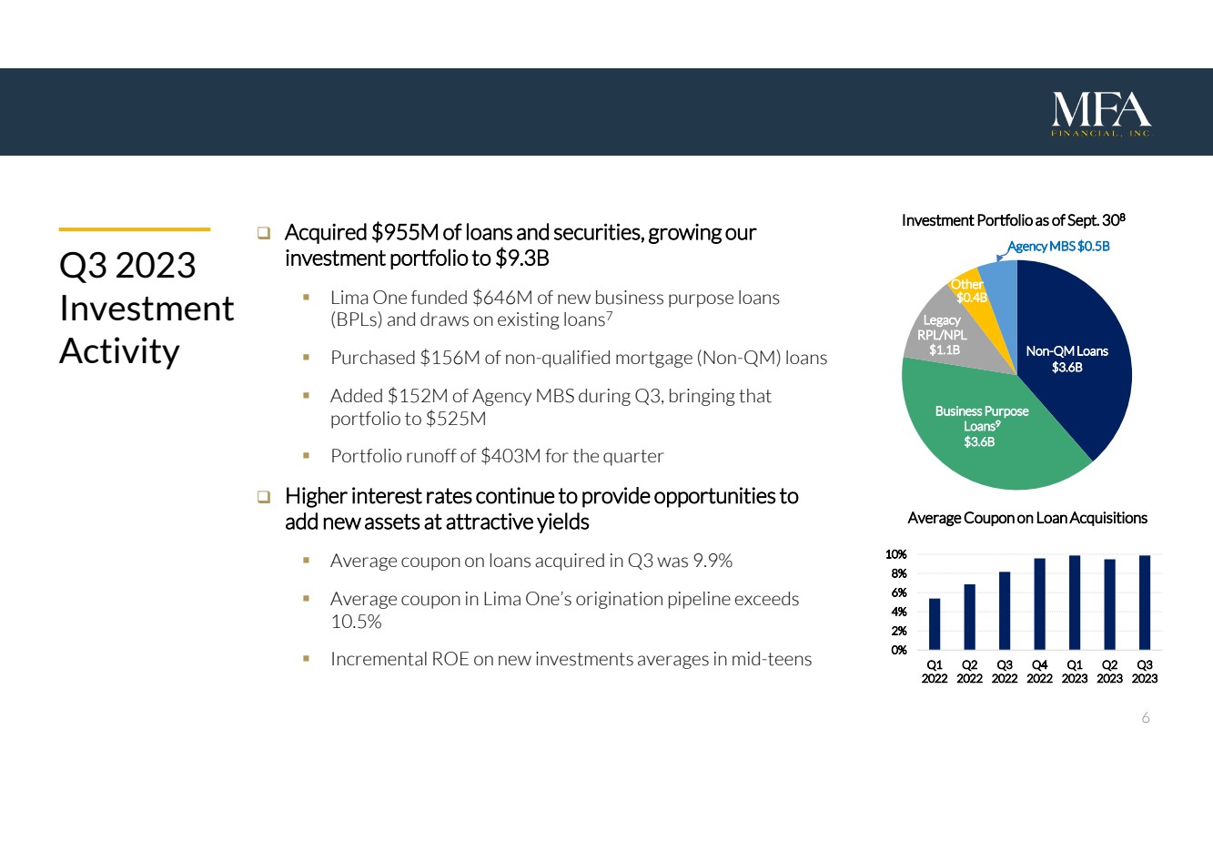 6 □ Acquired $955M of loans and securities, growing our investment portfolio to $9.3B ▪ Lima One funded $646M of new business purpose loans (BPLs) and draws on existing loans 7 ▪ Purchased $156M of non - qualified mortgage (Non - QM) loans ▪ Added $152M of Agency MBS during Q3, bringing that portfolio to $525M ▪ Portfolio runoff of $403M for the quarter □ Higher interest rates continue to provide opportunities to add new assets at attractive yields ▪ Average coupon on loans acquired in Q3 was 9.9% ▪ Average coupon in Lima One’s origination pipeline exceeds 10.5% ▪ Incremental ROE on new investments averages in mid - teens Q3 2023 Investment Activity Investment Portfolio as of Sept. 30 8 Non - QM Loans Business Purpose Loans 9 Legacy RPL/NPL Other $3.6B $3.6B $ 0.4B Agency MBS $0.5B $1.1B Average Coupon on Loan Acquisitions 0% 2% 4% 6% 8% 10% Q1 2022 Q2 2022 Q3 2022 Q4 2022 Q1 2023 Q2 2023 Q3 2023