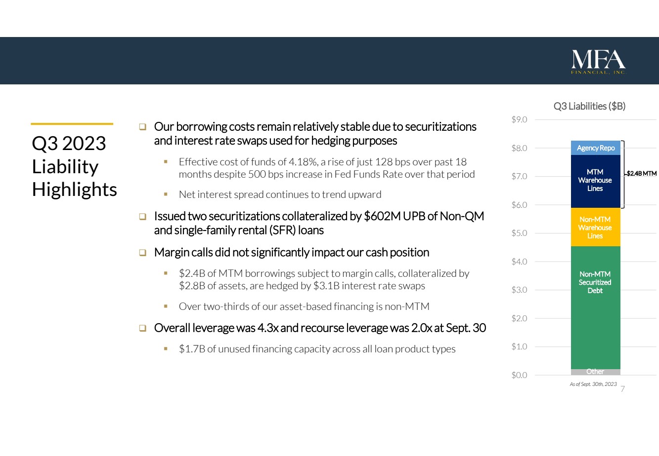 5 Q3 2023 Company Highlights □ Higher interest rates and elevated rate volatility impacted book value and GAAP earnings ▪ GAAP and Economic book value declined by 6.5% and 8.5%, respectively □ Distributable earnings of $0.40 and declared $0.35 dividend ▪ Net interest spread rose to 2.17%, up from 2.14% in Q2 and 1.64% in Q3 2022 ▪ Net interest margin (NIM) rose to 3.02% ▪ Interest income continues to benefit from acquiring assets at increasingly higher yields □ Record quarter of originations for Lima One, our wholly - owned business purpose lender ▪ Lima originated $671M 6 of loans (15% increase over Q2) with average coupon of 10.2% □ Maintained substantial liquidity and continued shift to non - mark to market (non - MTM) financing ▪ Issued two securitizations during the quarter and another in October ▪ 77% of our loan financing is non - MTM, up from 73% in Q2 ▪ Ended Q3 with $300M of unrestricted cash