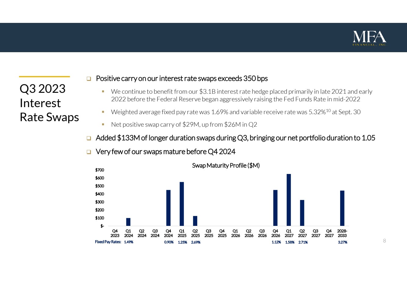 7 Q3 2023 Liability Highlights □ Our borrowing costs remain relatively stable due to securitizations and interest rate swaps used for hedging purposes ▪ Effective cost of funds of 4.18%, a rise of just 128 bps over past 18 months despite 500 bps increase in Fed Funds Rate over that period ▪ Net interest spread continues to trend upward □ Issued two securitizations collateralized by $602M UPB of Non - QM and single - family rental (SFR) loans □ Margin calls did not significantly impact our cash position ▪ $2.4B of MTM borrowings subject to margin calls, collateralized by $2.8B of assets, are hedged by $3.1B interest rate swaps ▪ Over two - thirds of our asset - based financing is non - MTM □ Overall leverage was 4.3x and recourse leverage was 2.0x at Sept. 30 ▪ $1.7B of unused financing capacity across all loan product types MTM Warehouse Line Non - MTM Warehouse Line Non - MTM Securitized Debt Other As of Sept. 30th, 2023 $2.4B MTM $0.0 $1.0 $2.0 $3.0 $4.0 $5.0 $6.0 $7.0 $8.0 $9.0 Q3 Liabilities ($B) Agency Repo MTM Warehouse Lines Non - MTM Warehouse Lines Non - MTM Securitized Debt Other