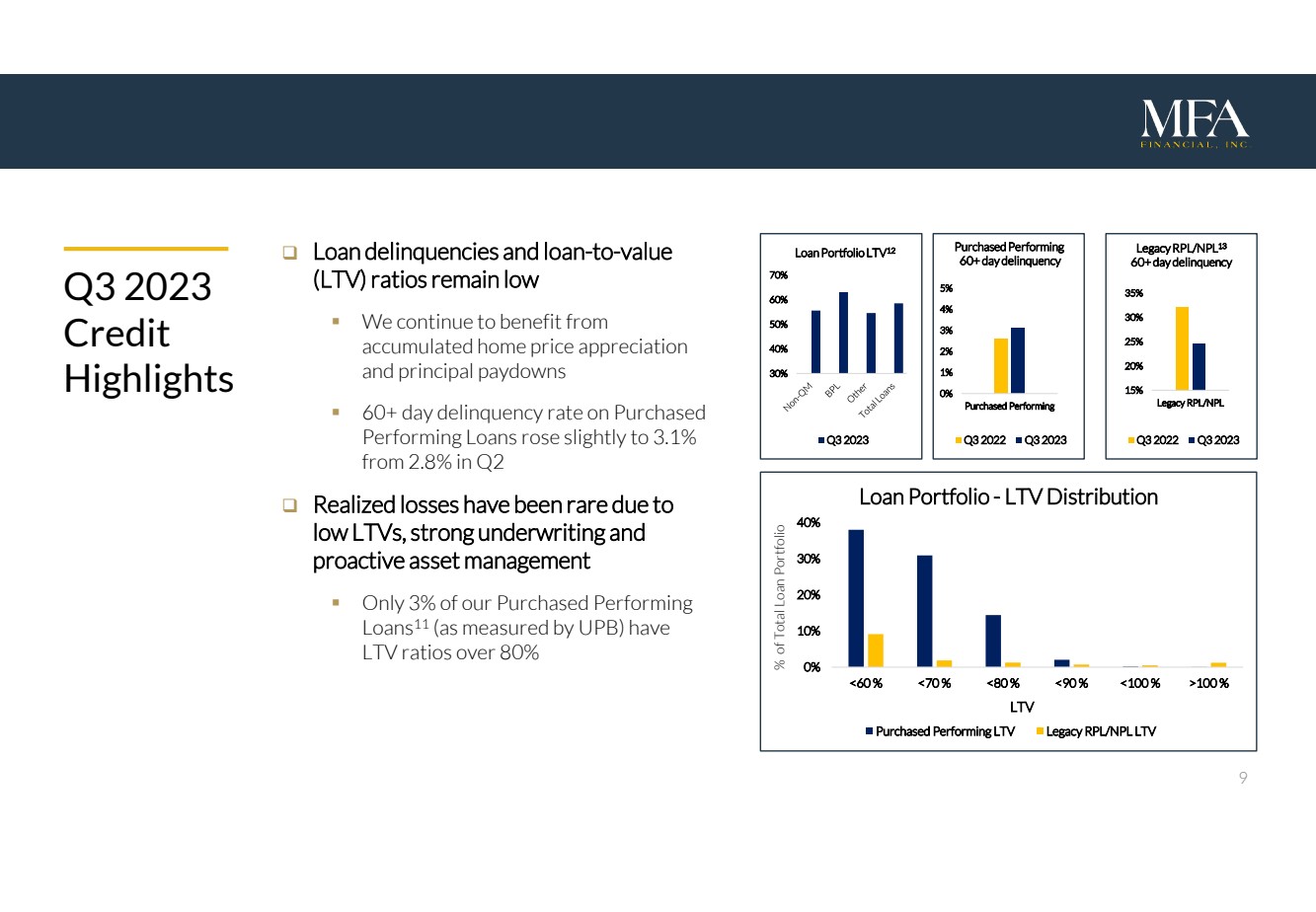 9 □ Loan delinquencies and loan - to - value (LTV) ratios remain low ▪ We continue to benefit from accumulated home price appreciation and principal paydowns ▪ 60+ day delinquency rate on Purchased Performing Loans rose slightly to 3.1% from 2.8% in Q2 □ Realized losses have been rare due to low LTVs, strong underwriting and proactive asset management ▪ Only 3% of our Purchased Performing Loans 11 (as measured by UPB) have LTV ratios over 80% Q3 2023 Credit Highlights 15% 20% 25% 30% 35% Legacy RPL/NPL Legacy RPL/NPL 13 60+ day delinquency Q3 2022 Q3 2023 0% 1% 2% 3% 4% 5% Purchased Performing Purchased Performing 60+ day delinquency Q3 2022 Q3 2023 0% 10% 20% 30% 40% <60 % <70 % <80 % <90 % <100 % >100 % % of Total Loan Portfolio LTV Loan Portfolio - LTV Distribution Purchased Performing LTV Legacy RPL/NPL LTV 30% 40% 50% 60% 70% Loan Portfolio LTV 12 Q3 2023