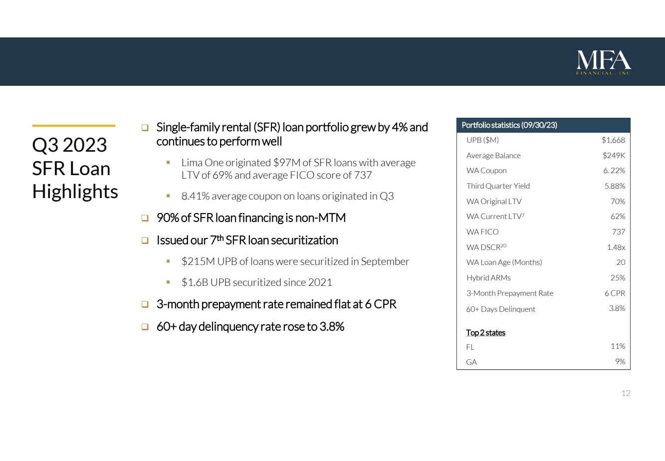 10 □ 15% increase in origination volume from Q2 and continued emphasis on high quality credit ▪ Record $671M of originations 6 with an average LTV 14 of 65% and FICO score of 754 ▪ Combination of sector upheaval and MFA’s strong balance sheet has enabled Lima to gain market share from competing l enders ▪ Origination fees, servicing fees and other fee income totaled $12.1M □ Lima One segment Distributable earnings increased 17% to $19.3M 15 □ Lima One has originated $5B of BPLs for our balance sheet since MFA’s acquisition in 2021 ▪ Lima offers a broad range of loan products to real estate investors nationwide including rehab loans, bridge loans, construction loans, rental loans and small - balance multifamily loans ▪ Credit performance remains strong with 60+ day delinquency rate of 3.2% for our BPLs originated by Lima One Q3 2023 Lima One Highlights